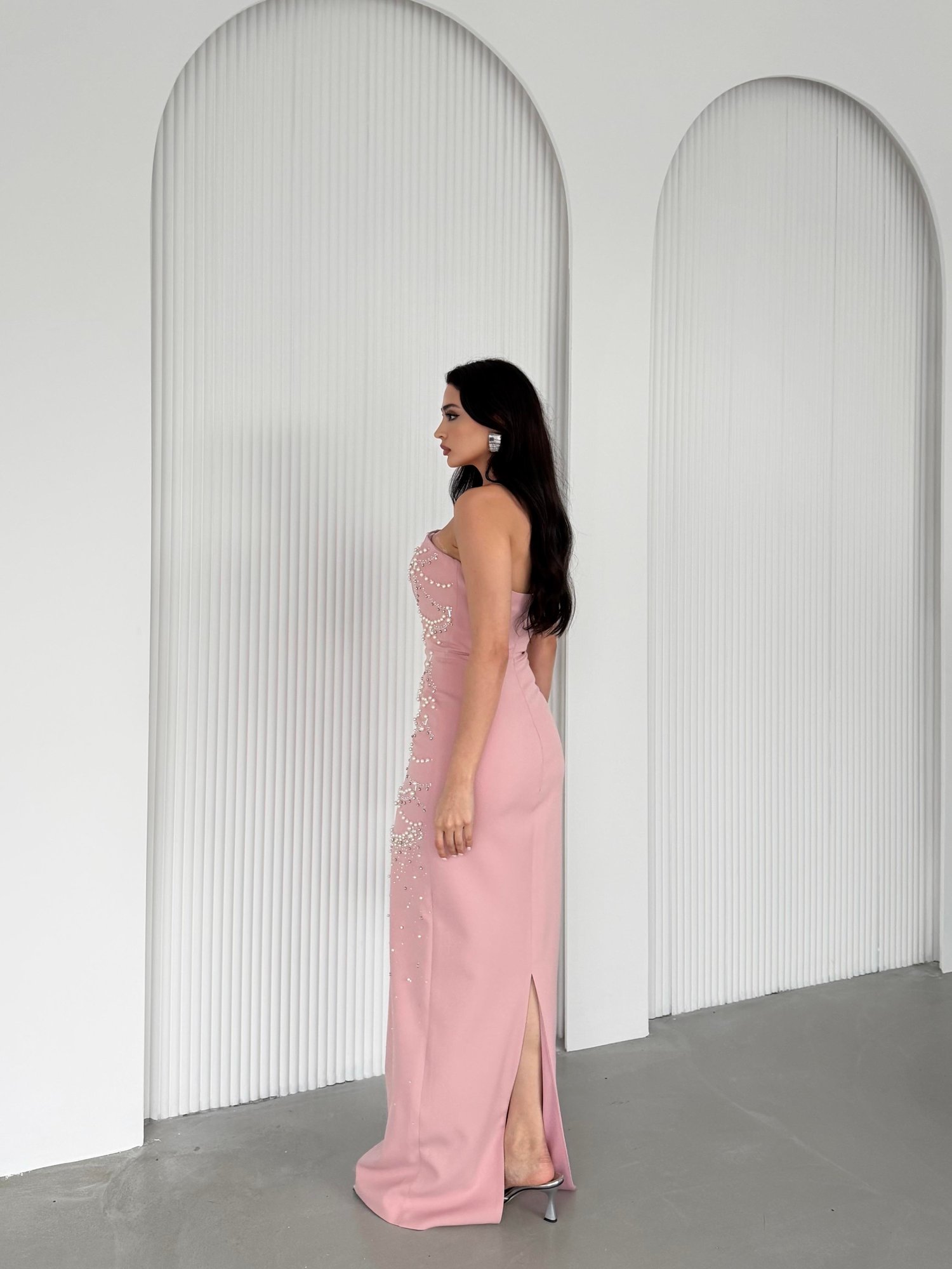 Pudra İnci İşlemeli Yırtmaçlı Straplez Kalem Abiye Elbise