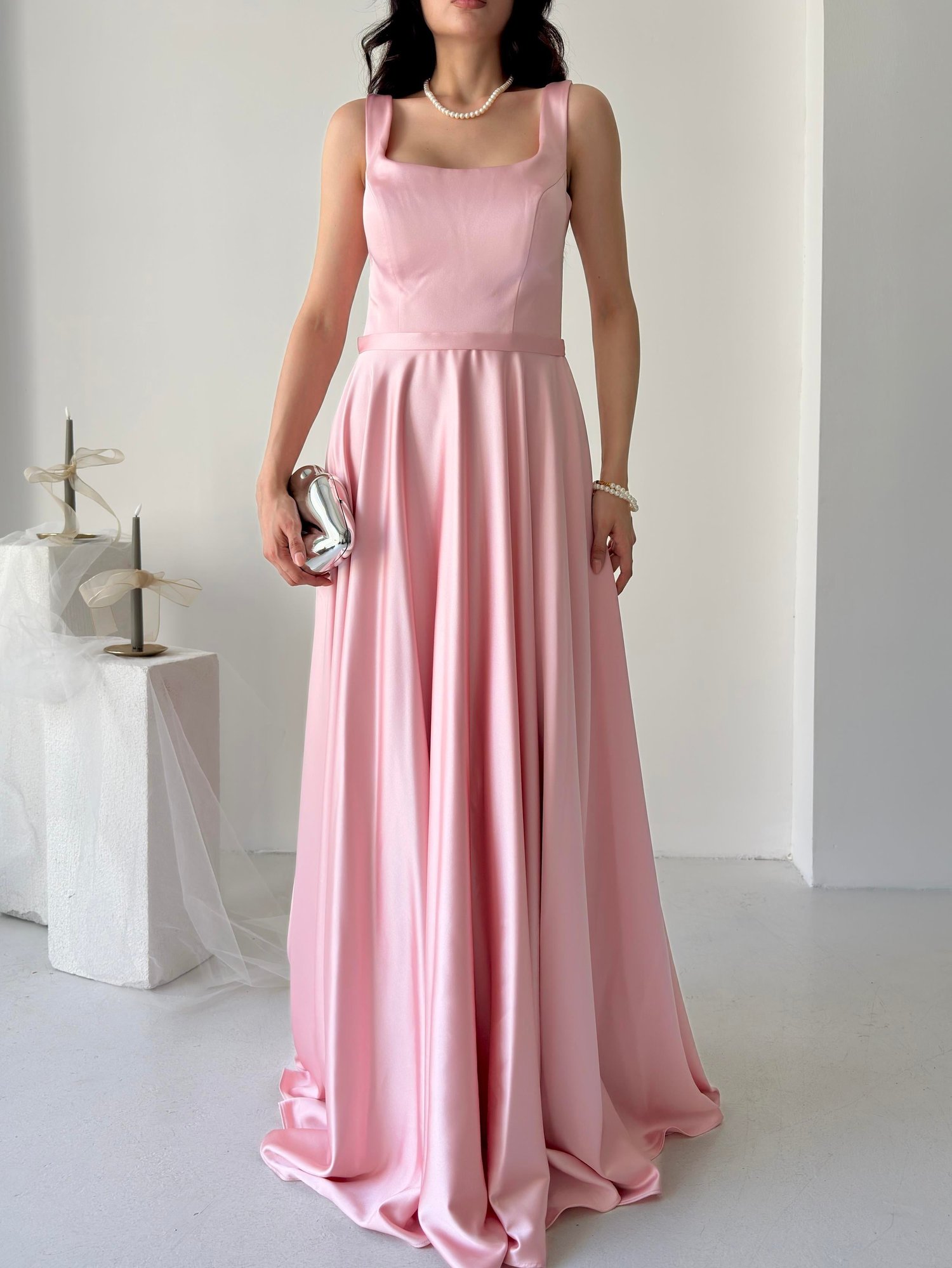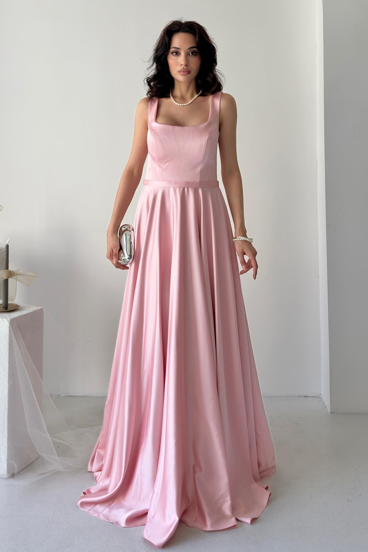 Pudra Kare Yaka Askılı Saten Abiye Elbise