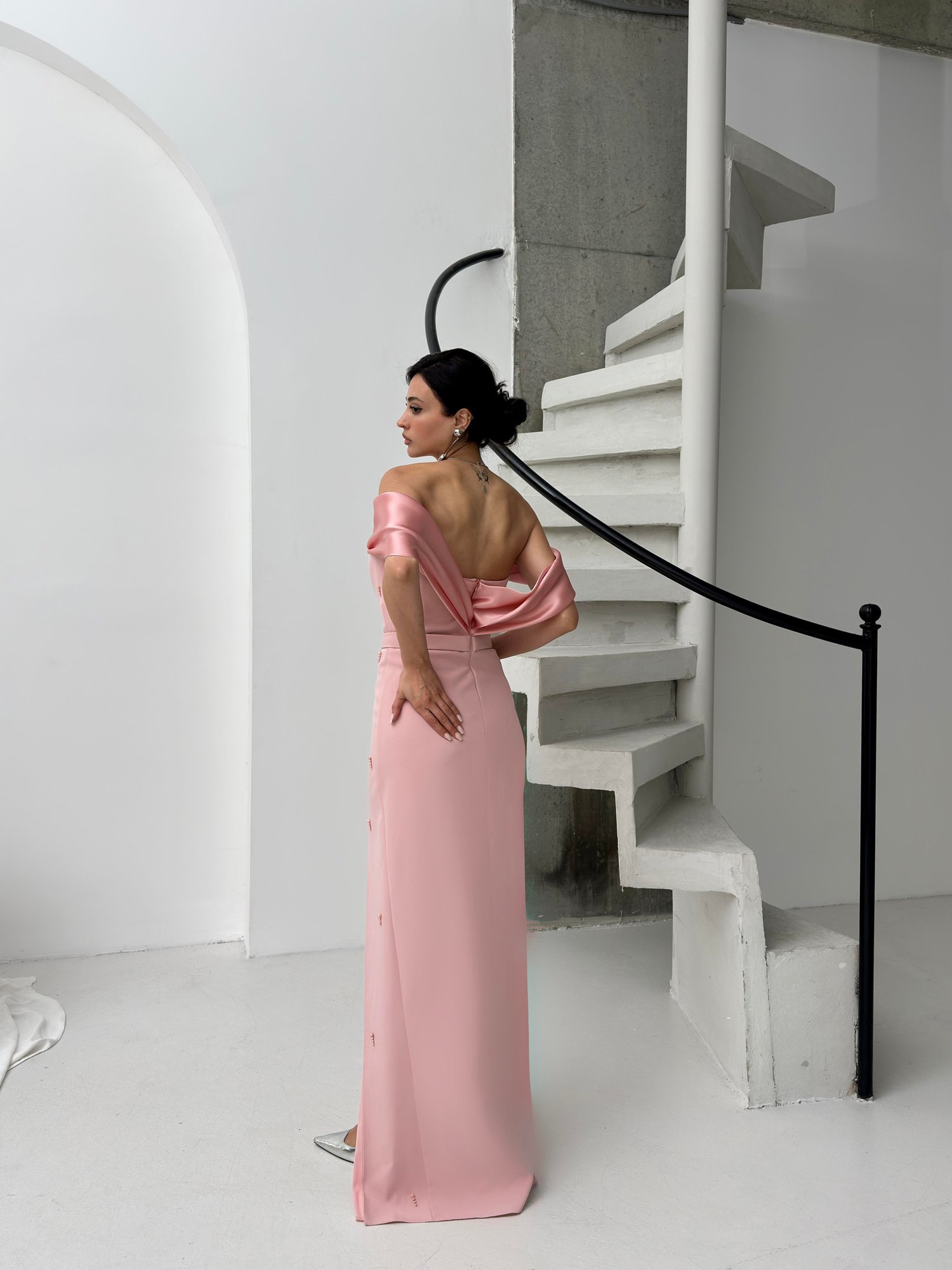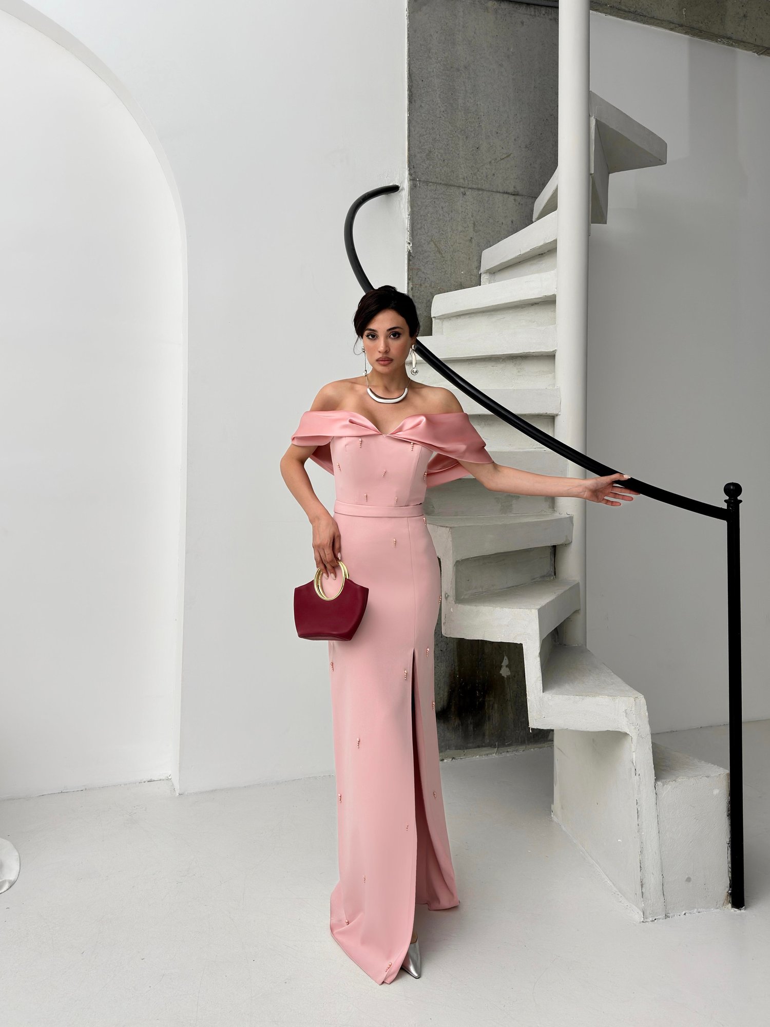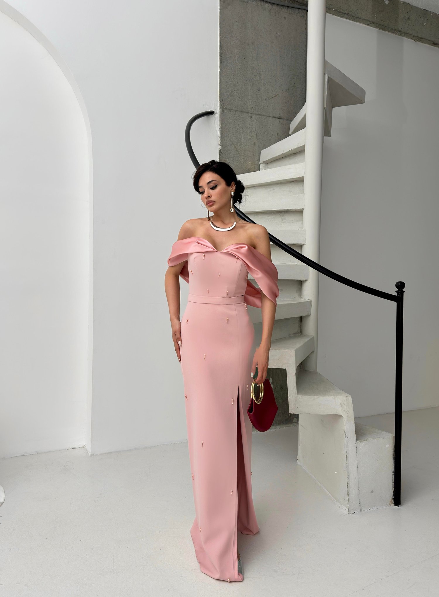 Pudra Kayık Yaka İnci Detaylı Abiye Elbise