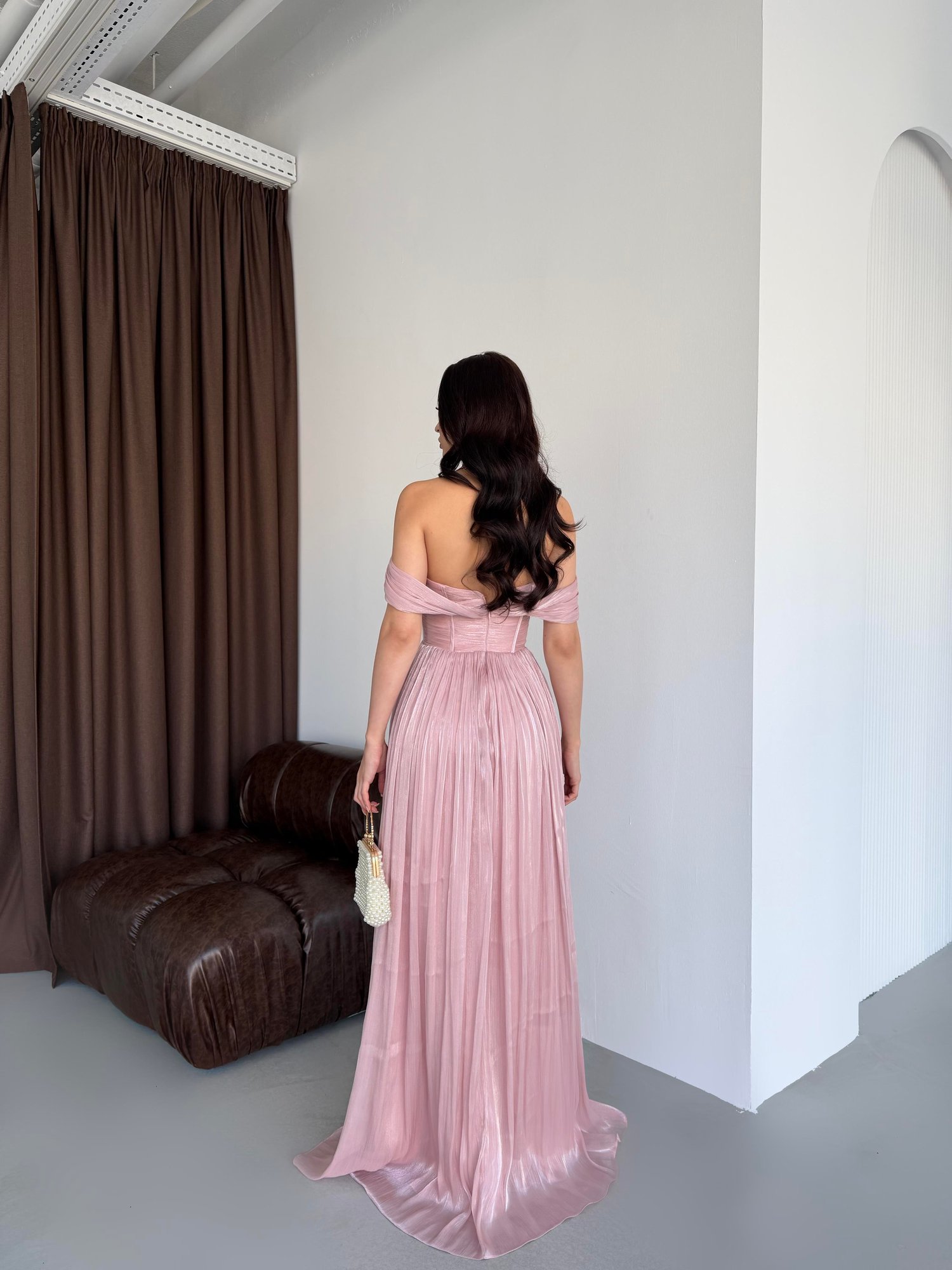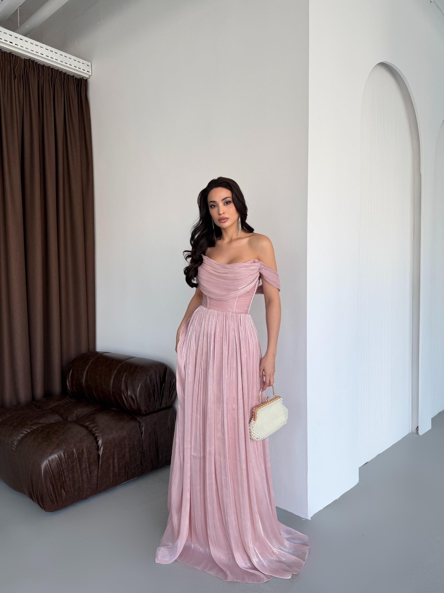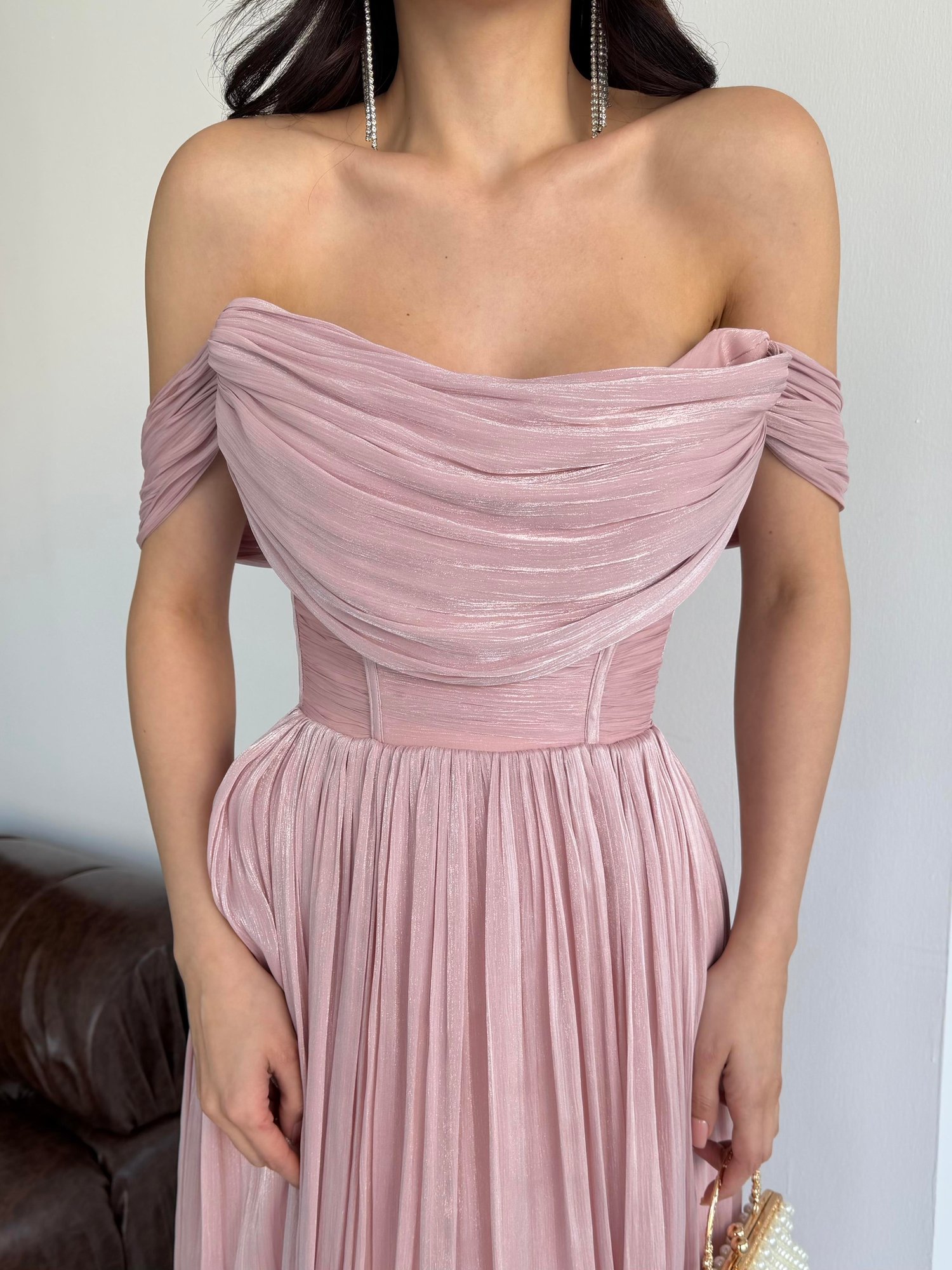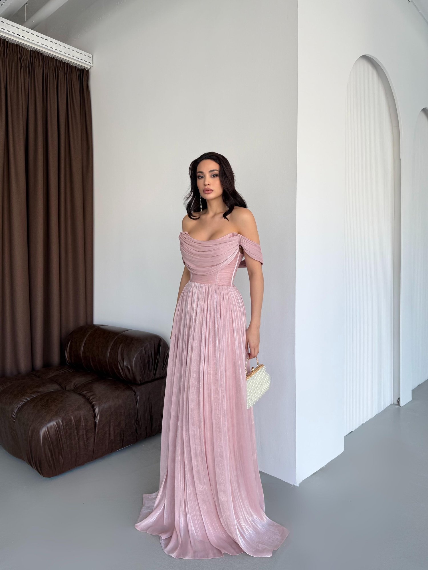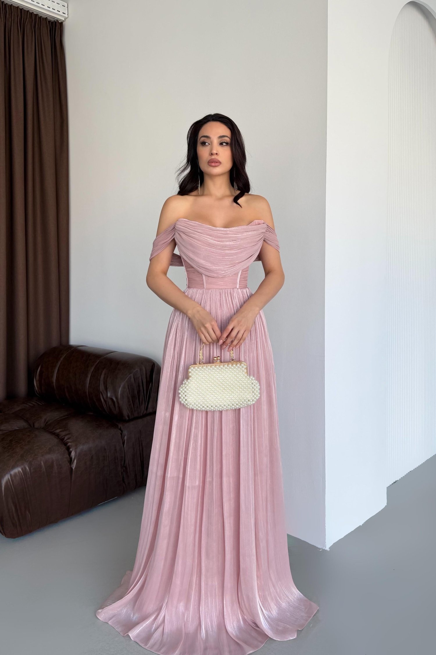 Pudra Kayık Yaka Pliseli Abiye Elbise