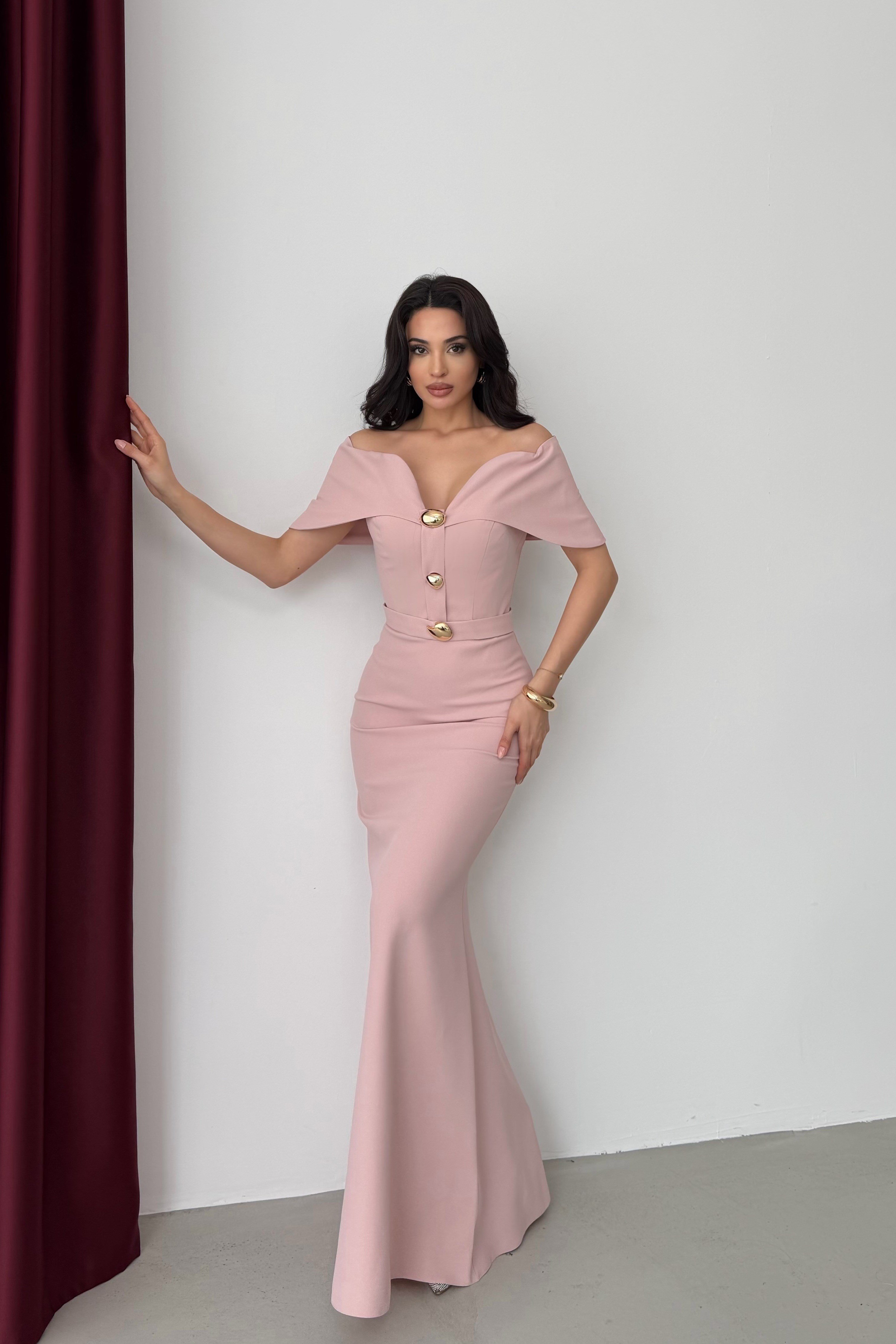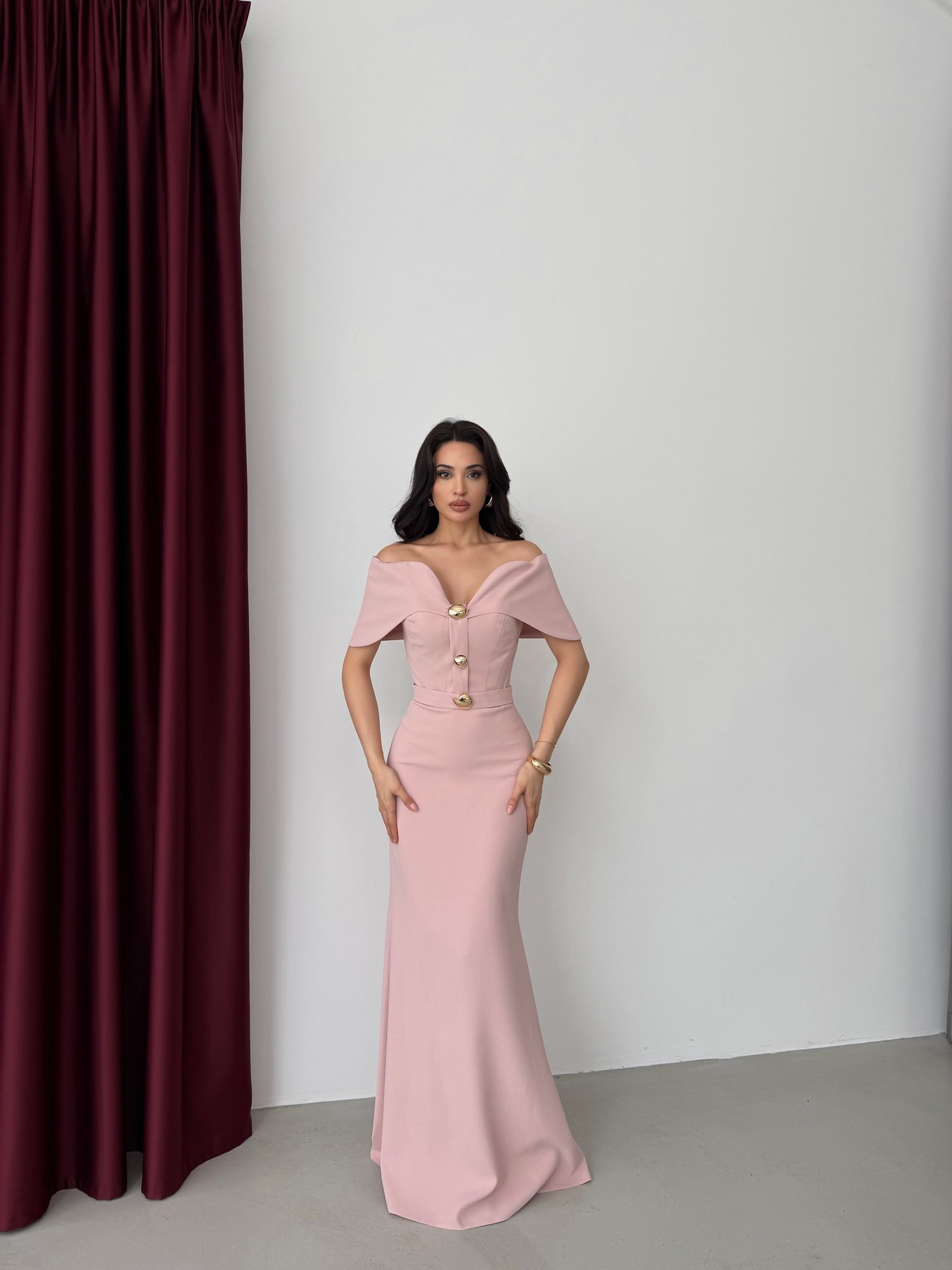 Pudra Madonna Yaka Kemerli Düğme Detaylı Abiye Elbise