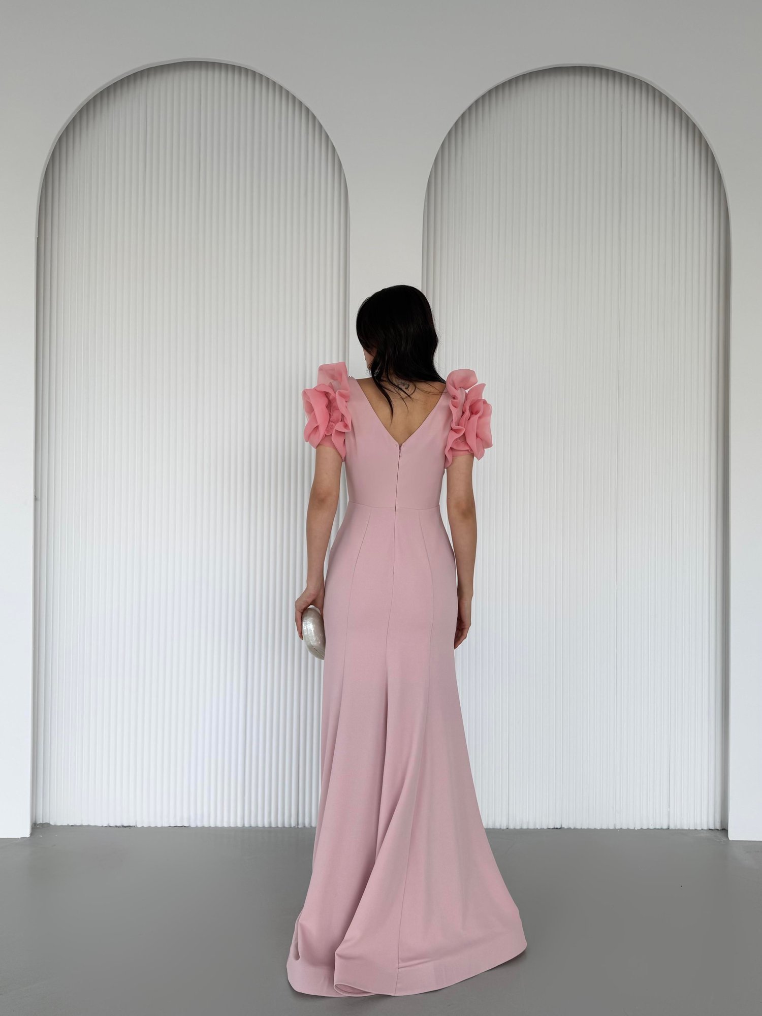 Pudra Omuz Detaylı V Yaka Taş İşlemeli Abiye Elbise