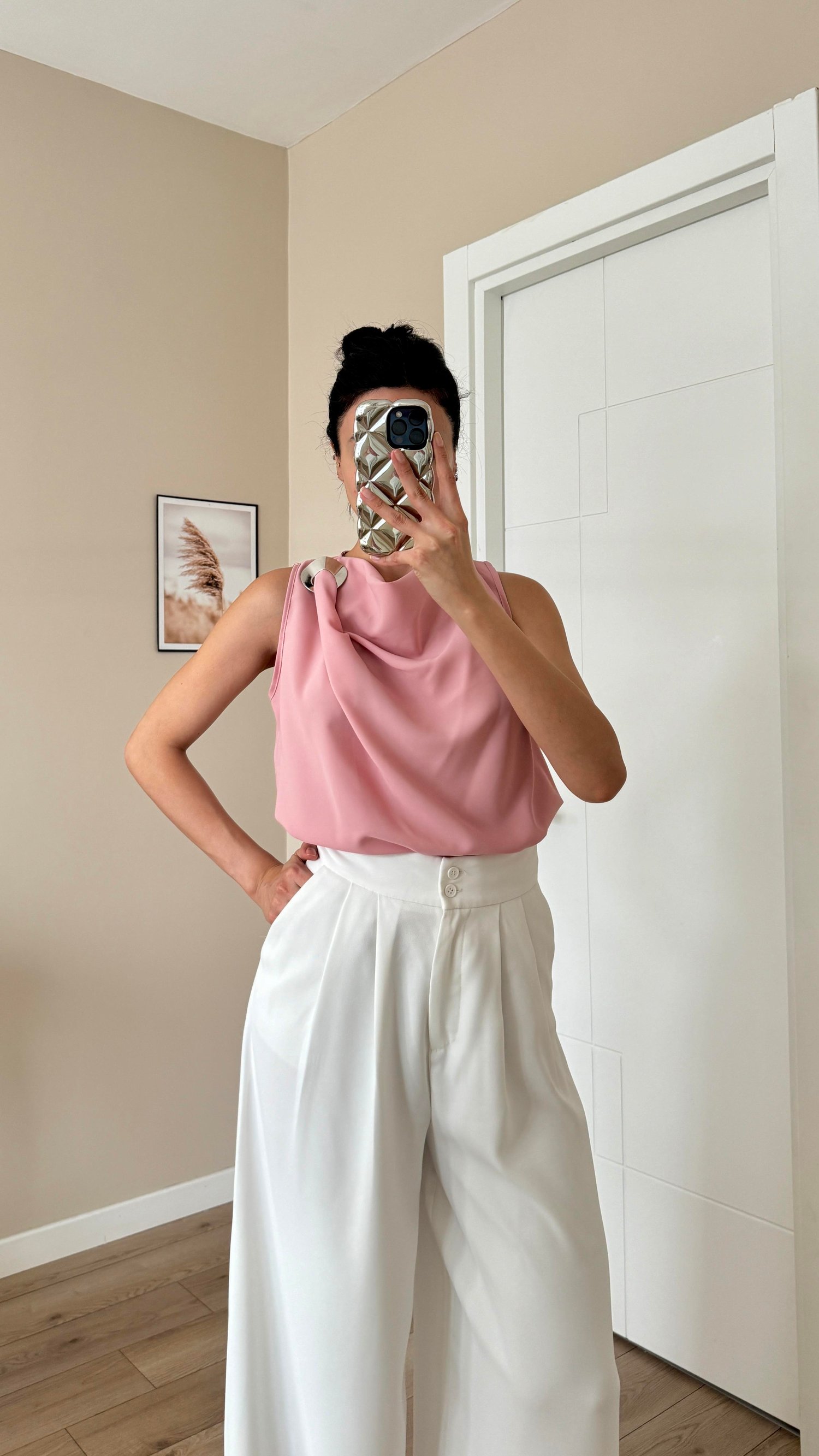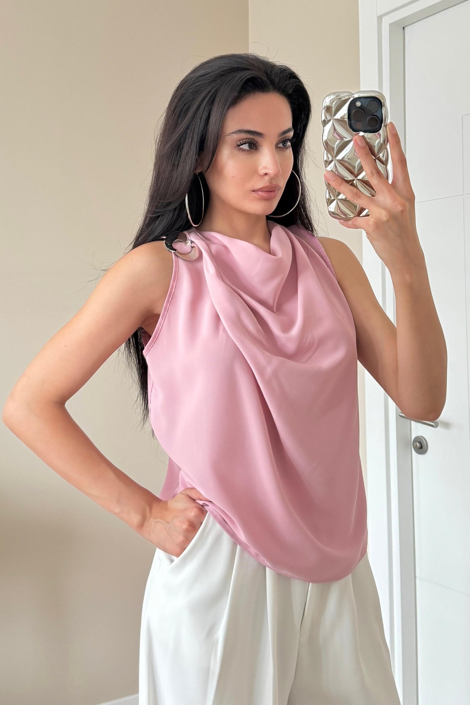 Pudra Omuz Tokalı Degaje Yaka Kolsuz Bluz