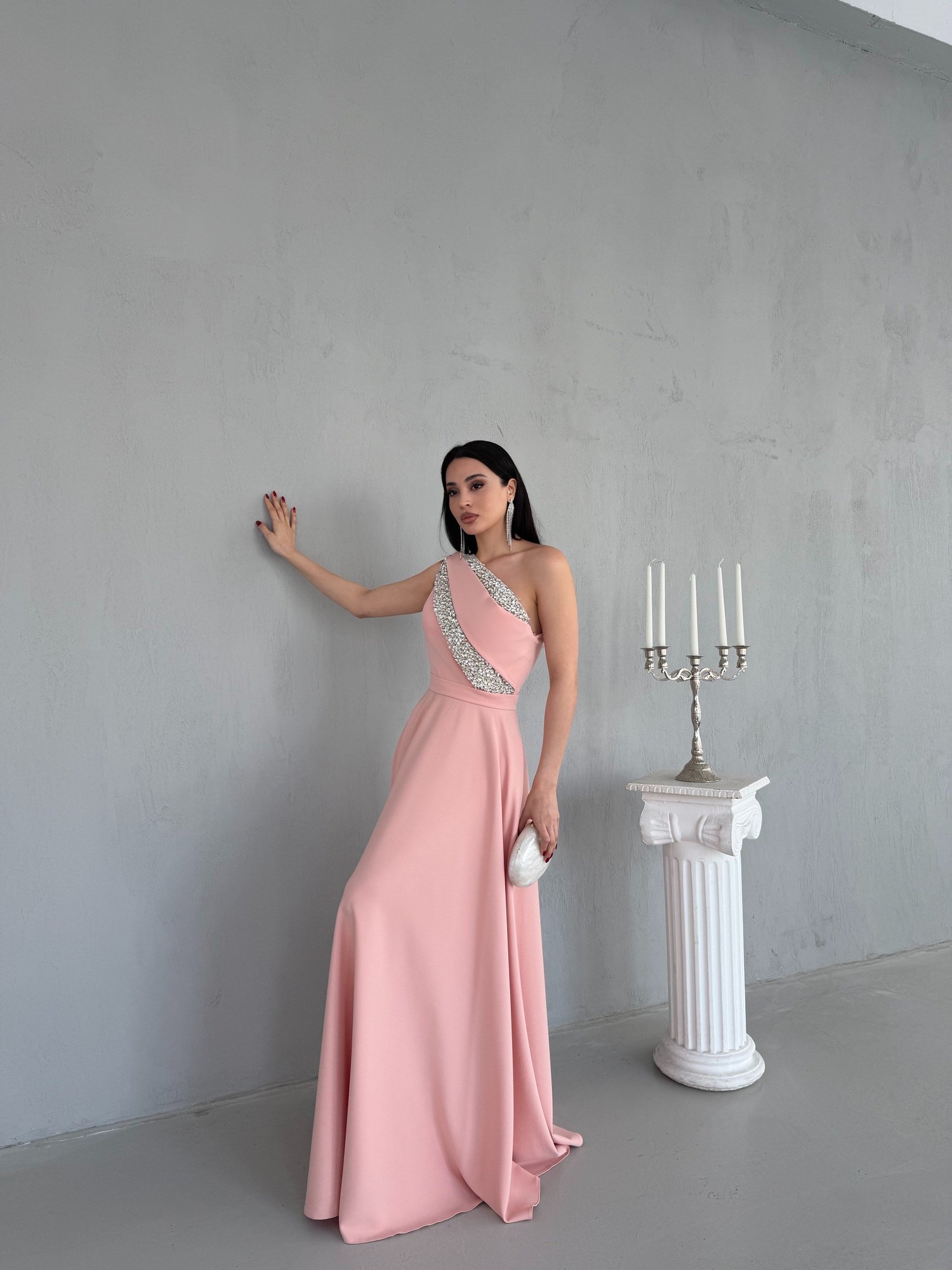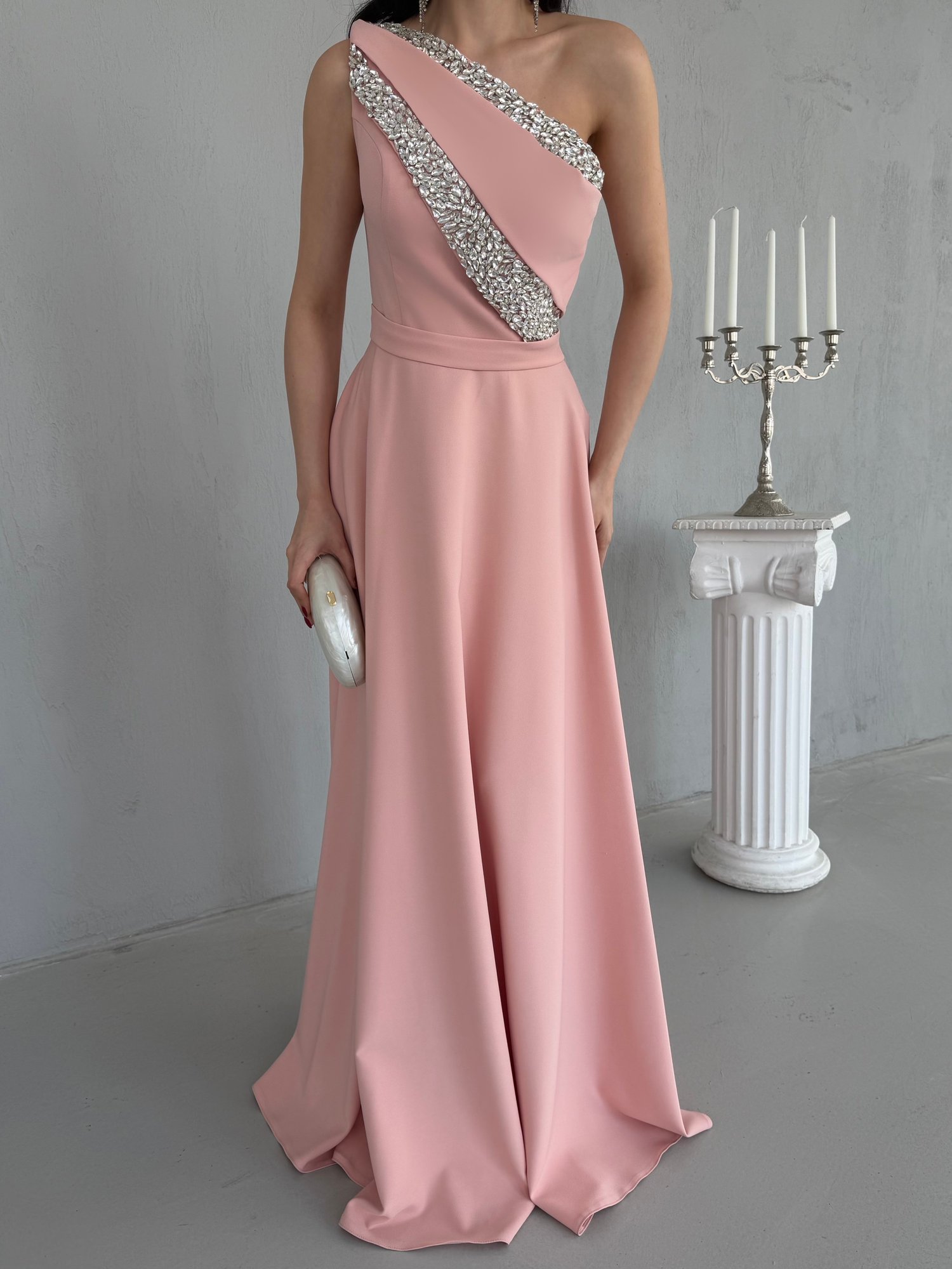 Pudra Tek Omuz Taş İşlemeli Abiye Elbise