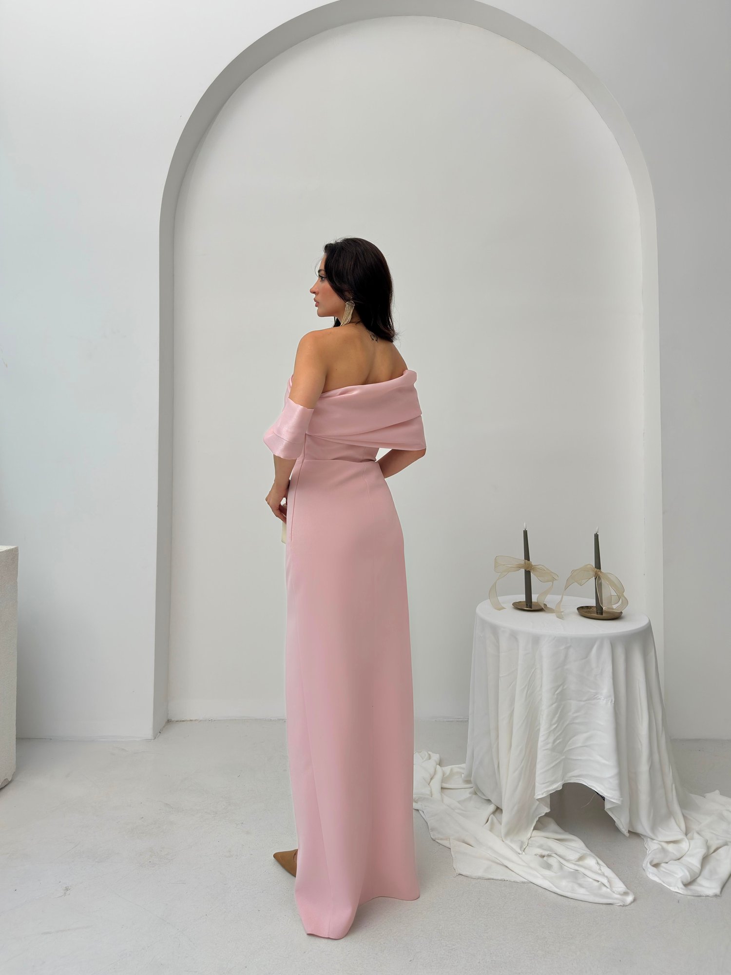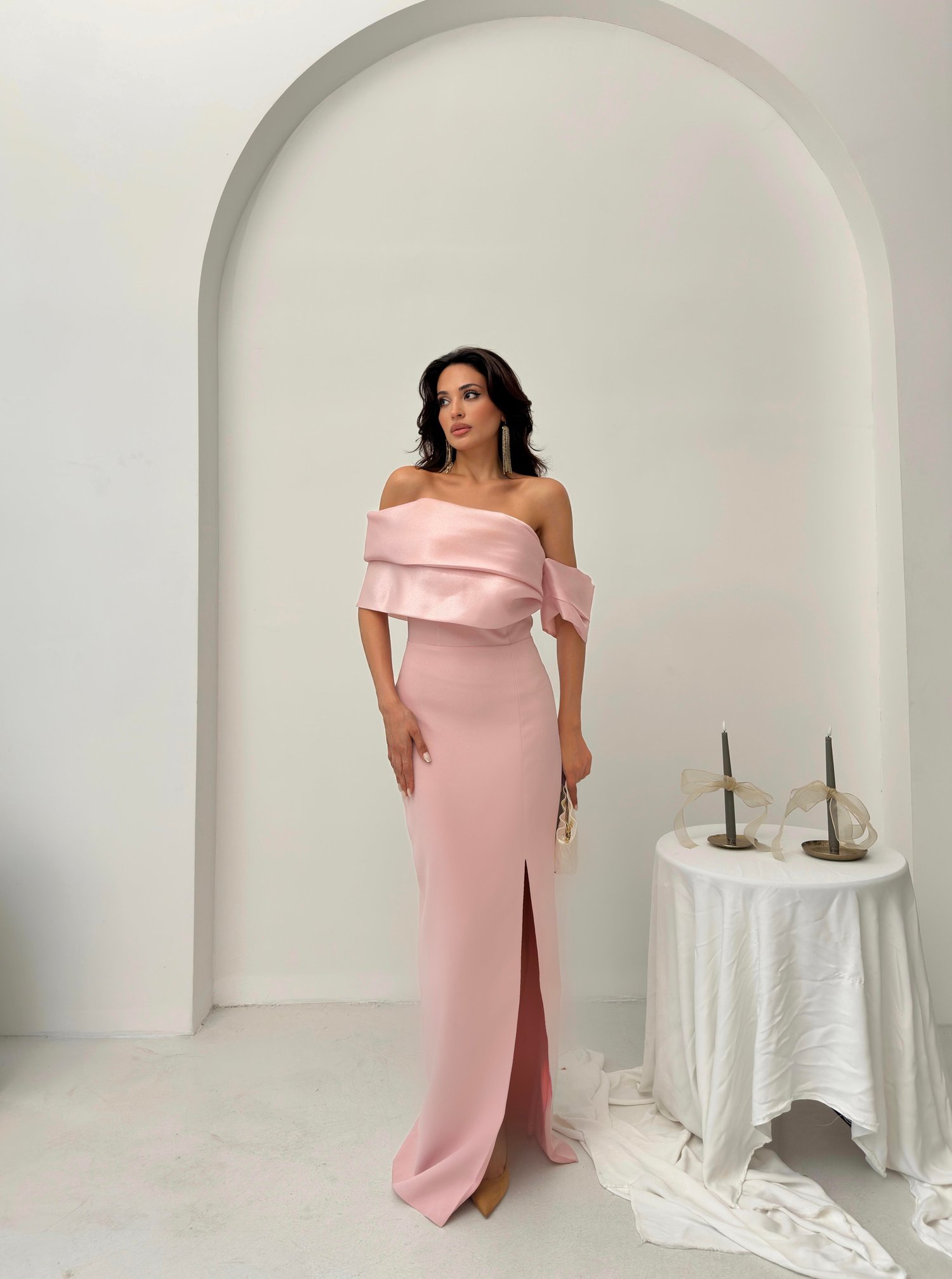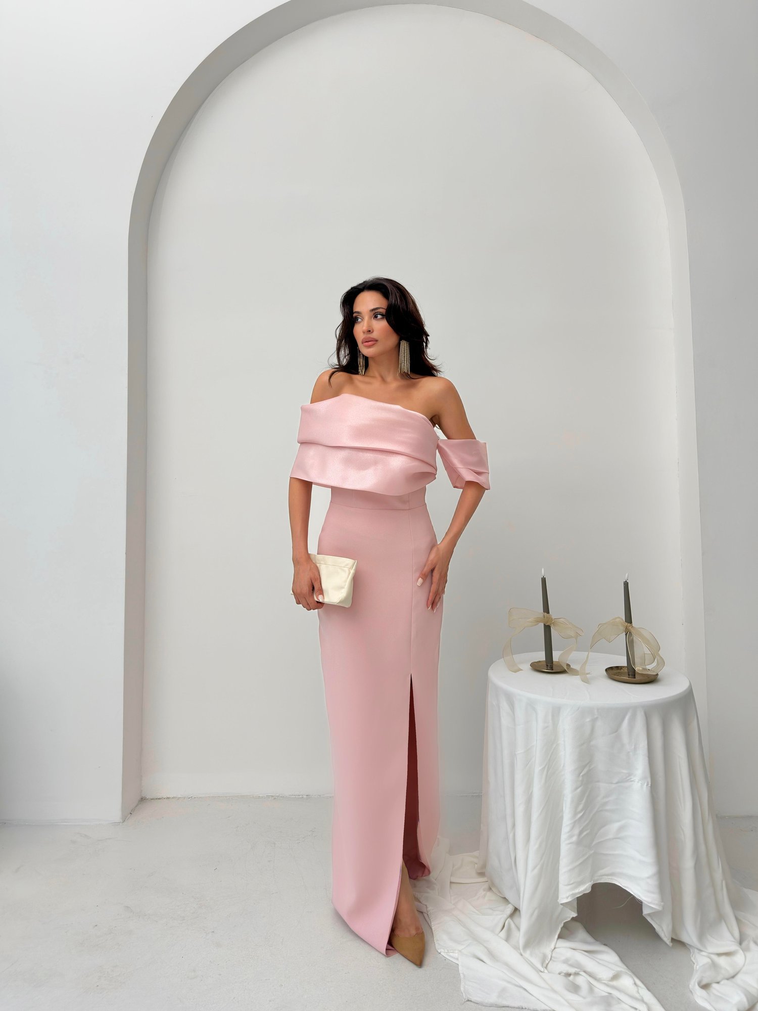Pudra Yaka Detaylı Yırtmaçlı Abiye Elbise