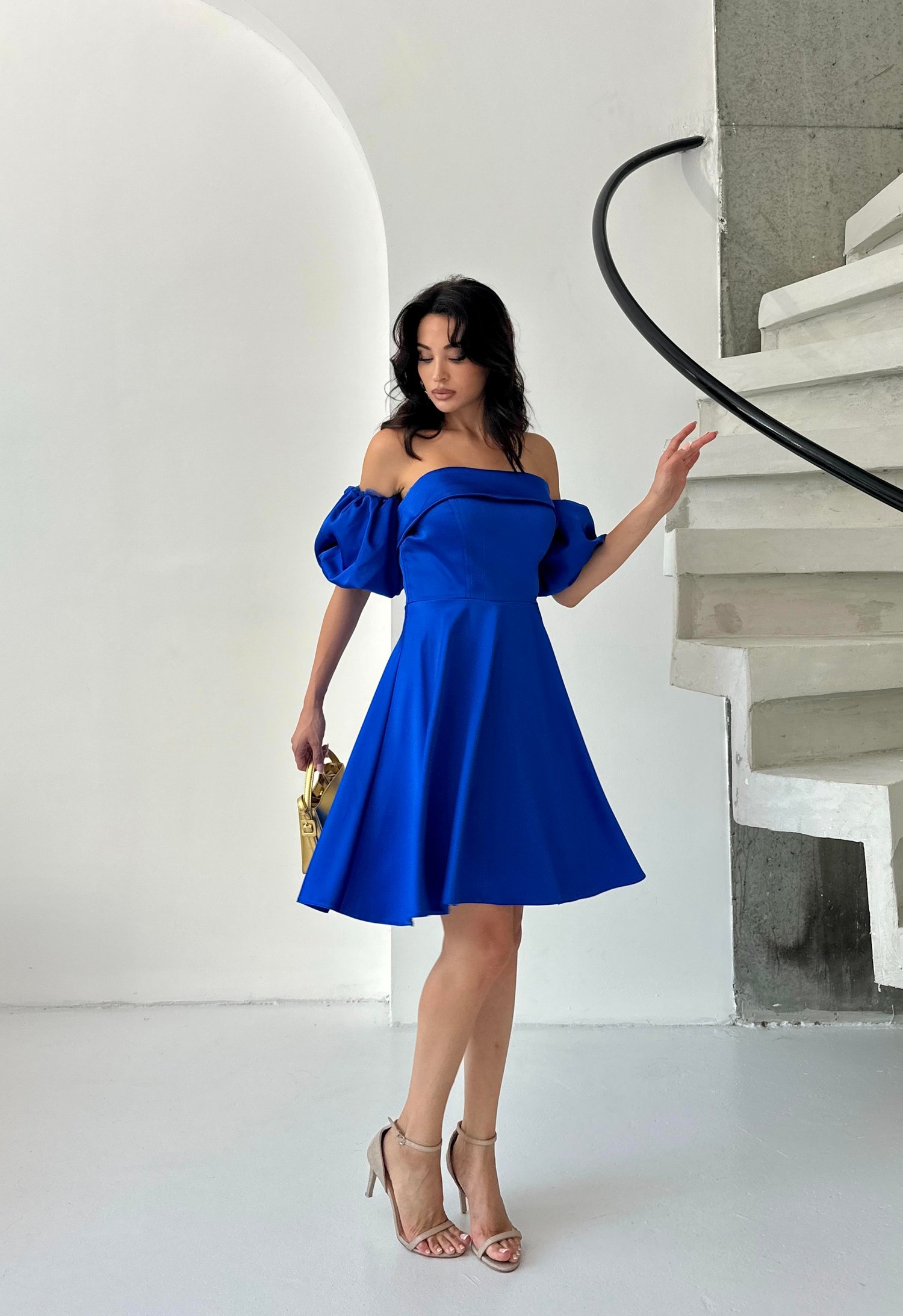Saks Mavi Balon Kol Detaylı Mini Saten Abiye Elbise