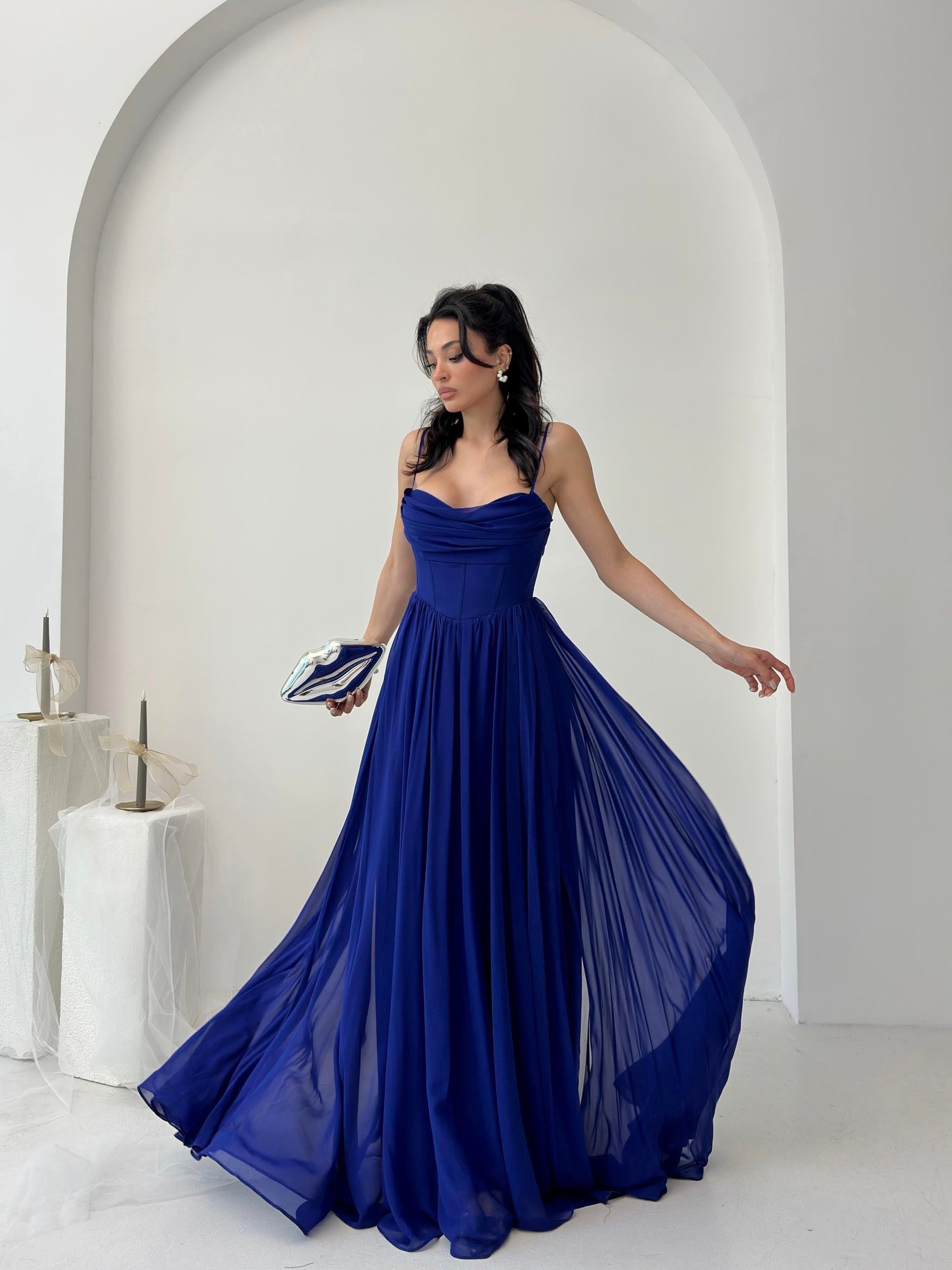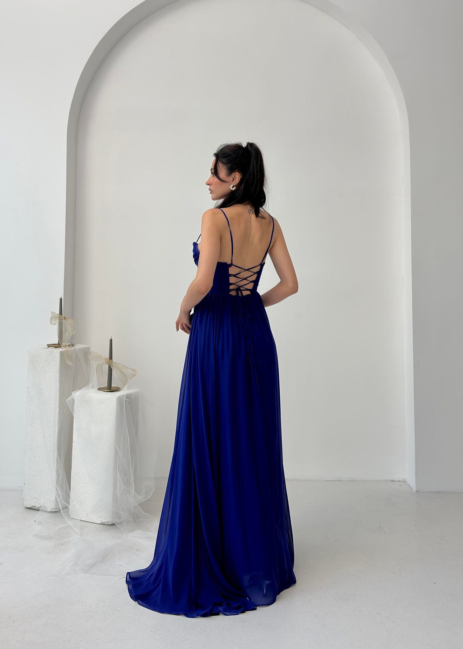 Saks Mavi İp Askılı Yırtmaçlı Şifon Tül Abiye Elbise