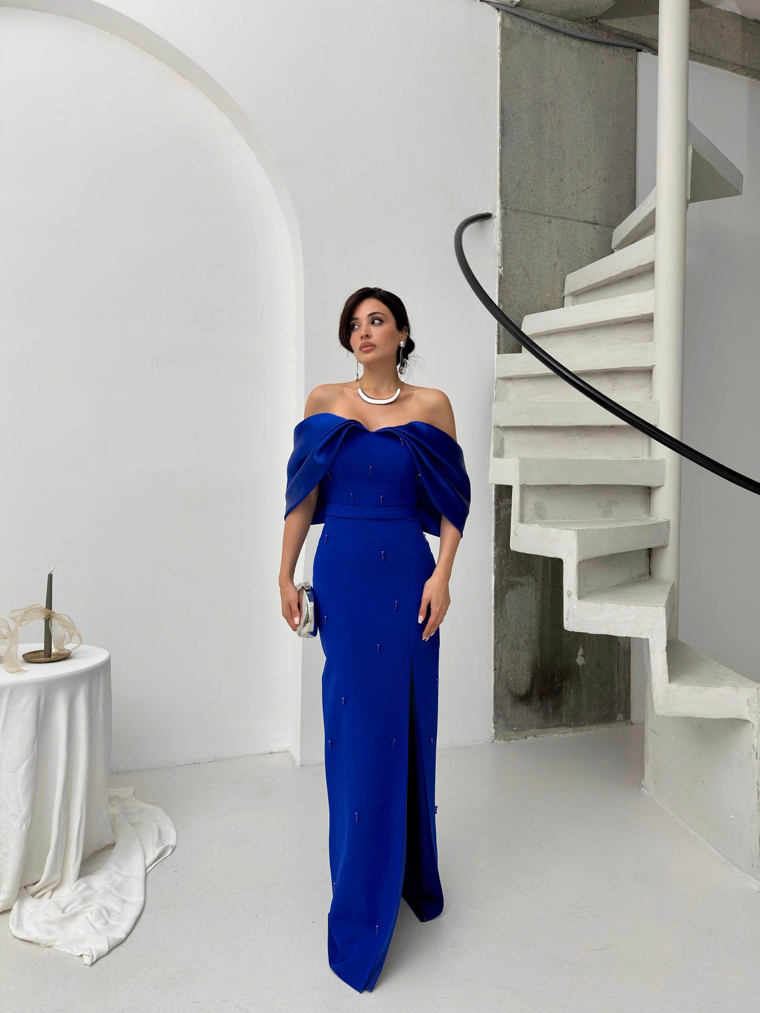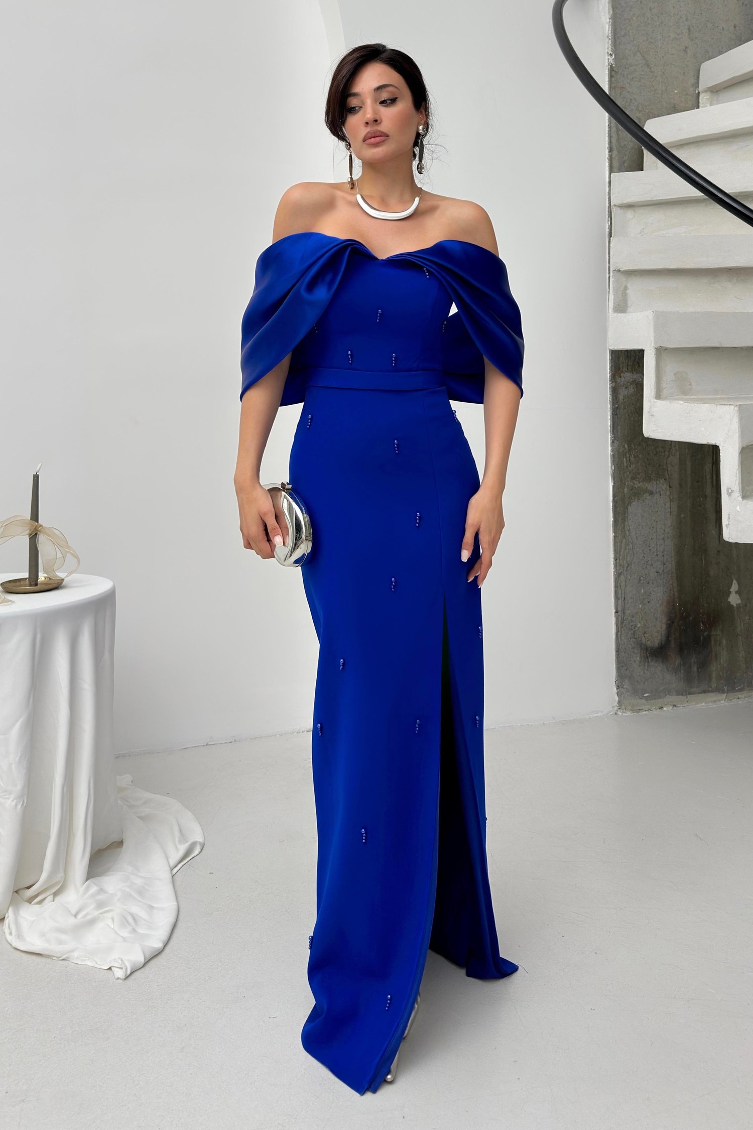 Saks Mavi Kayık Yaka İnci Detaylı Abiye Elbise