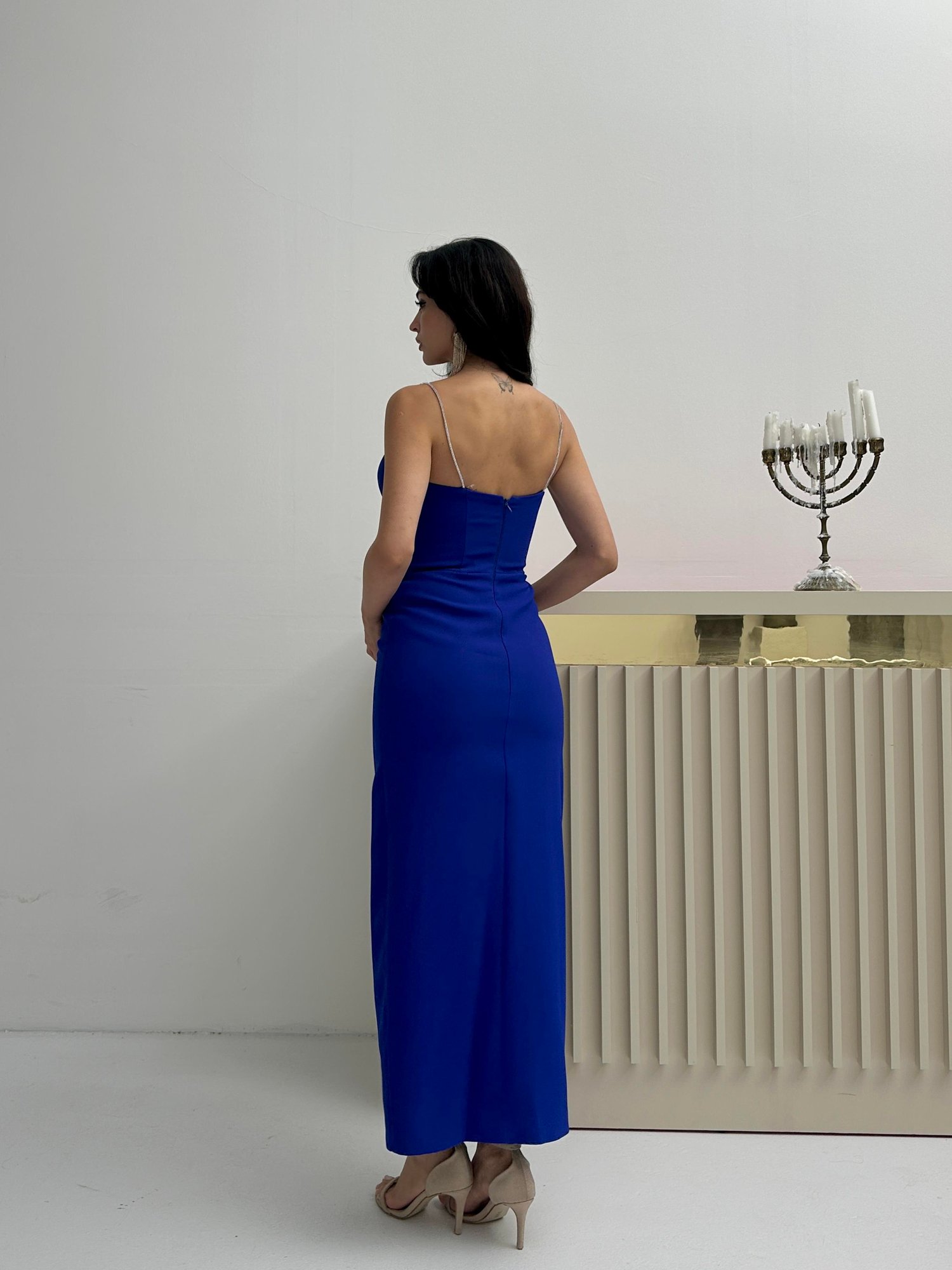 Saks Mavi Taş Askılı Yırtmaçlı Midi Abiye Elbise
