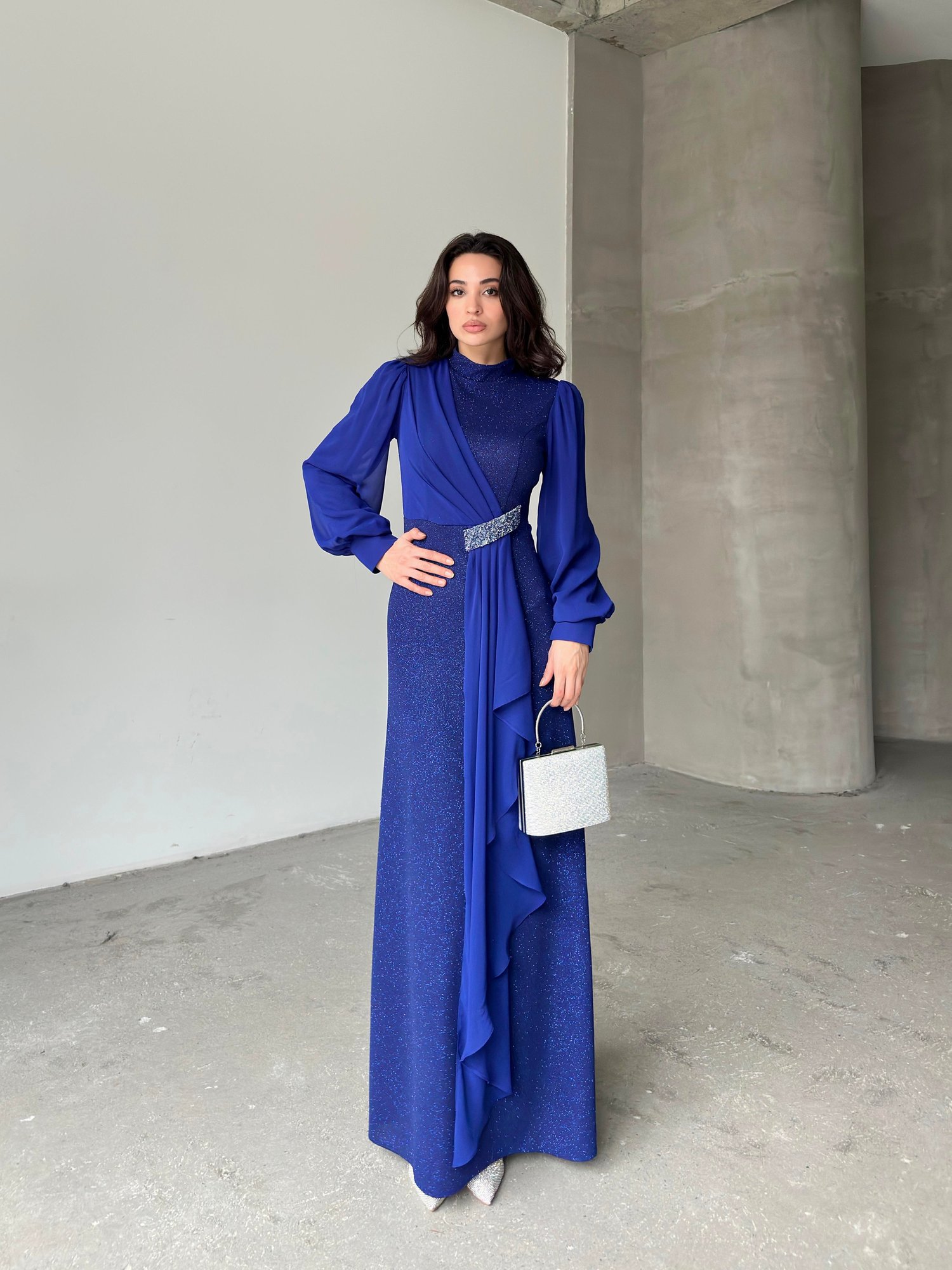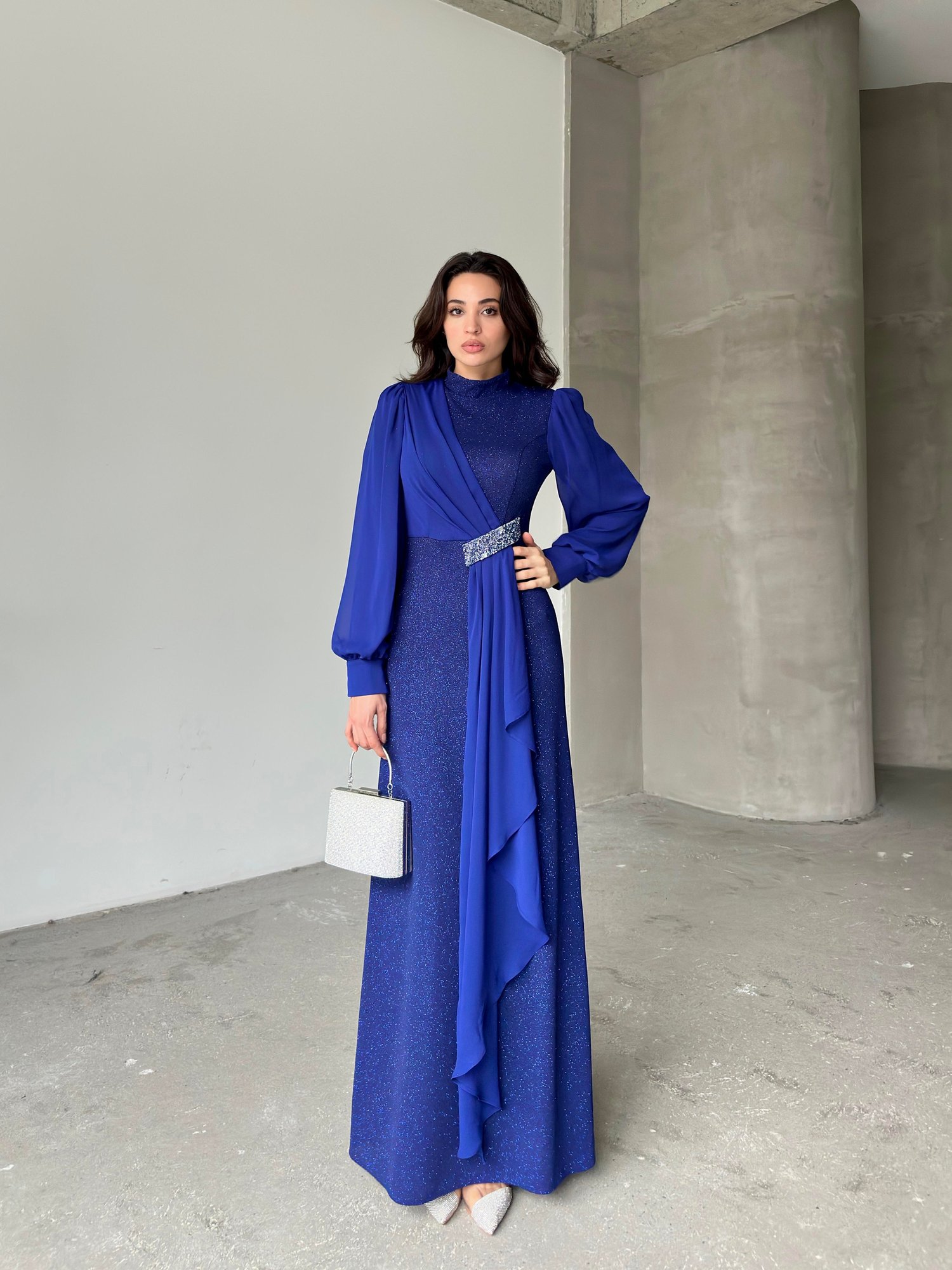 Saks Mavi Taş Detaylı Uzun Kol Simli Abiye Elbise