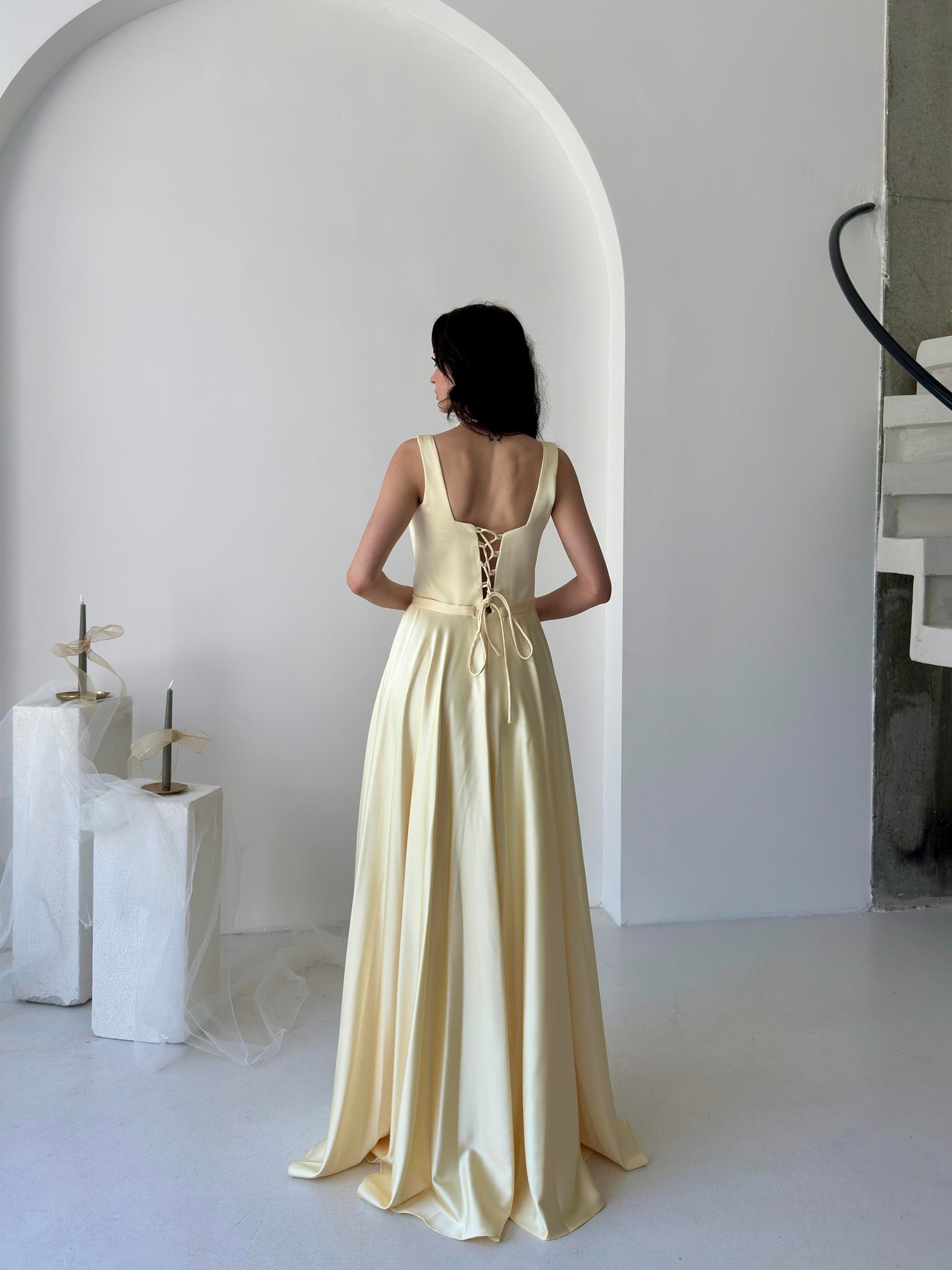 Sarı Kare Yaka Askılı Saten Abiye Elbise