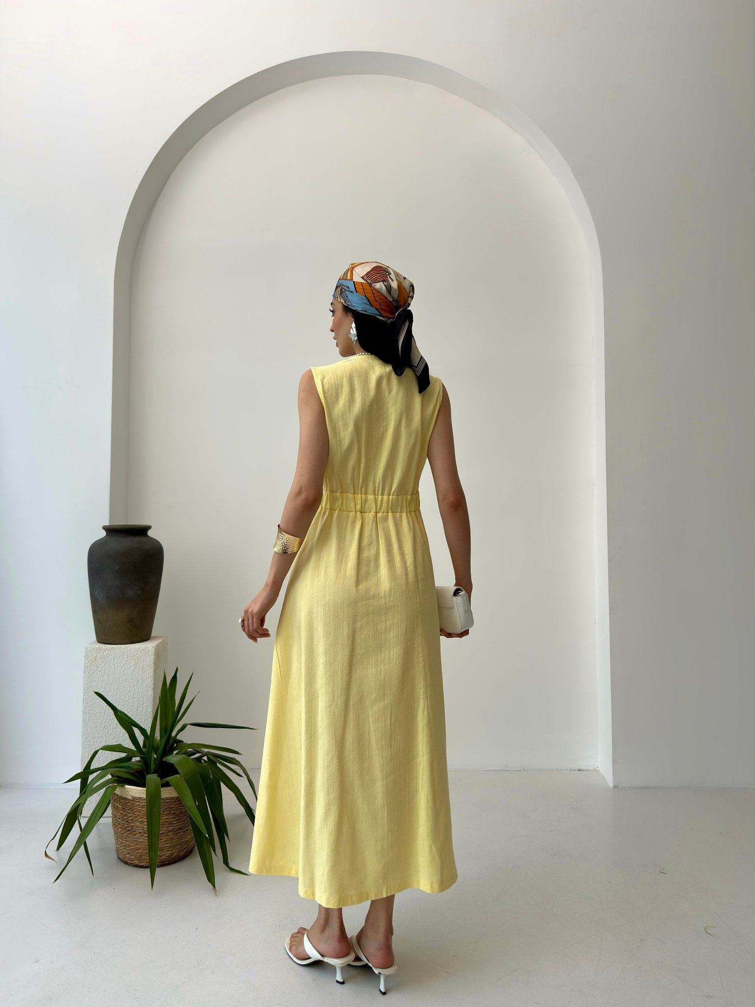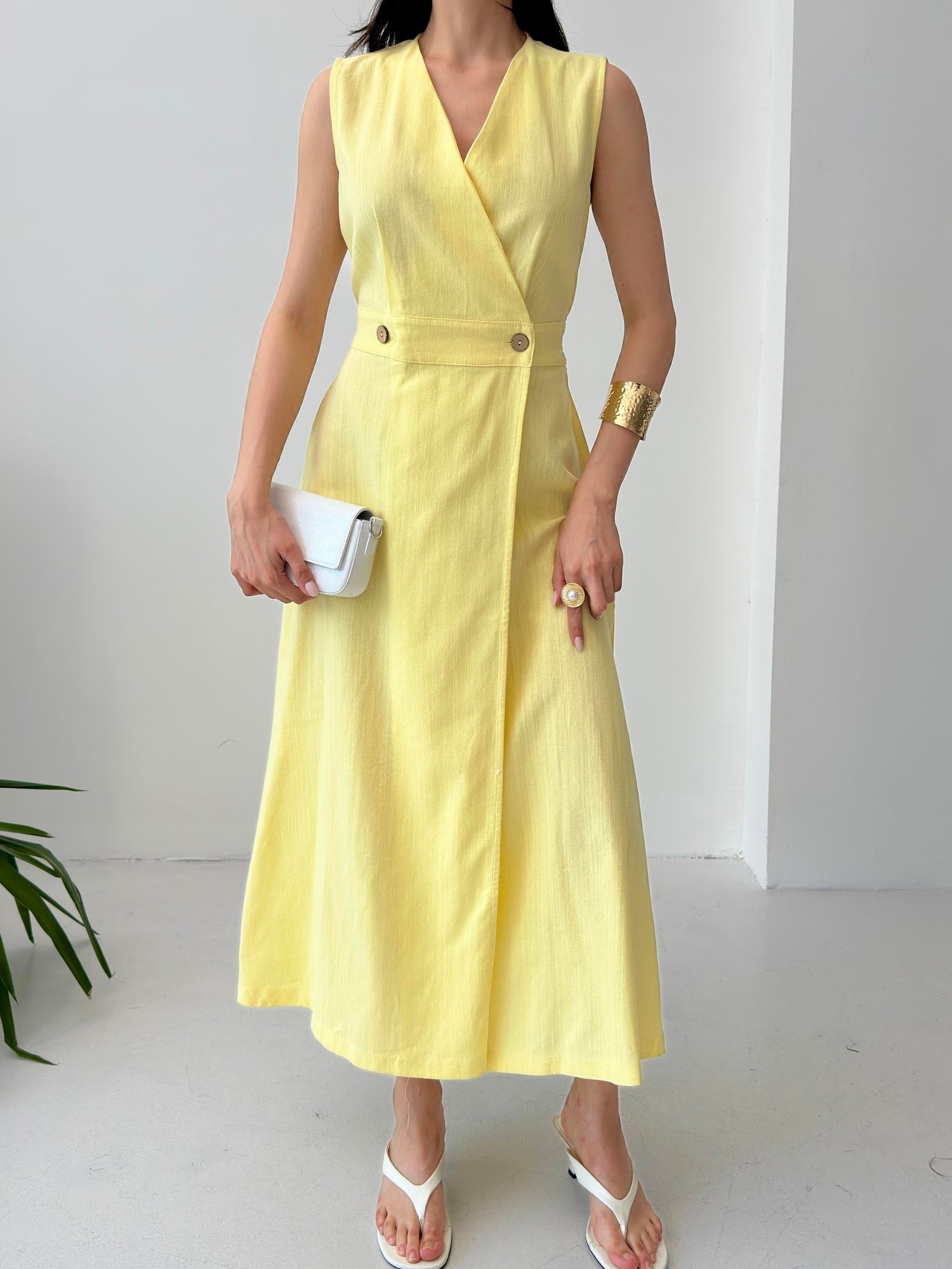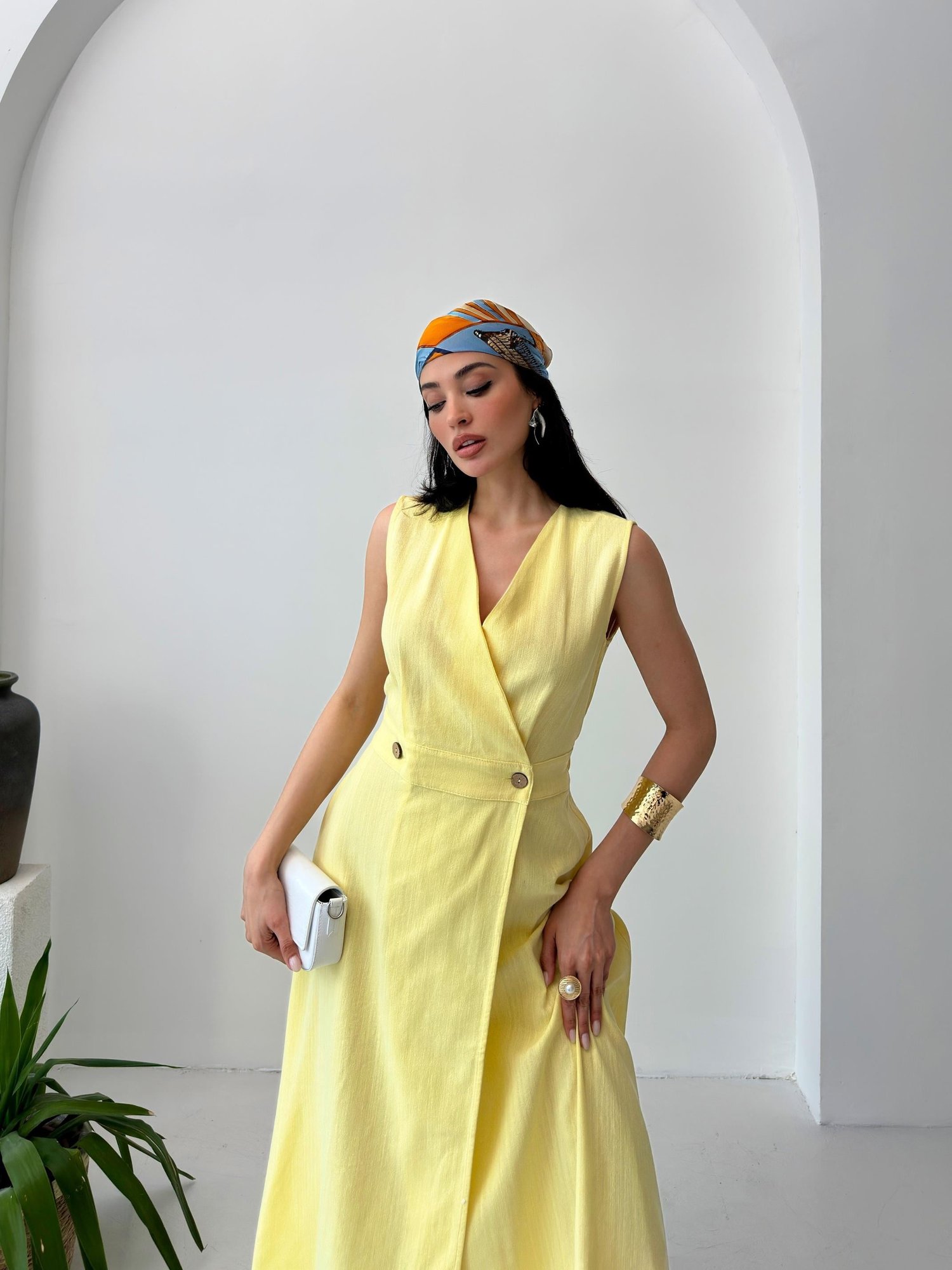 Sarı Kruvaze Kesim Kolsuz Uzun Keten Elbise