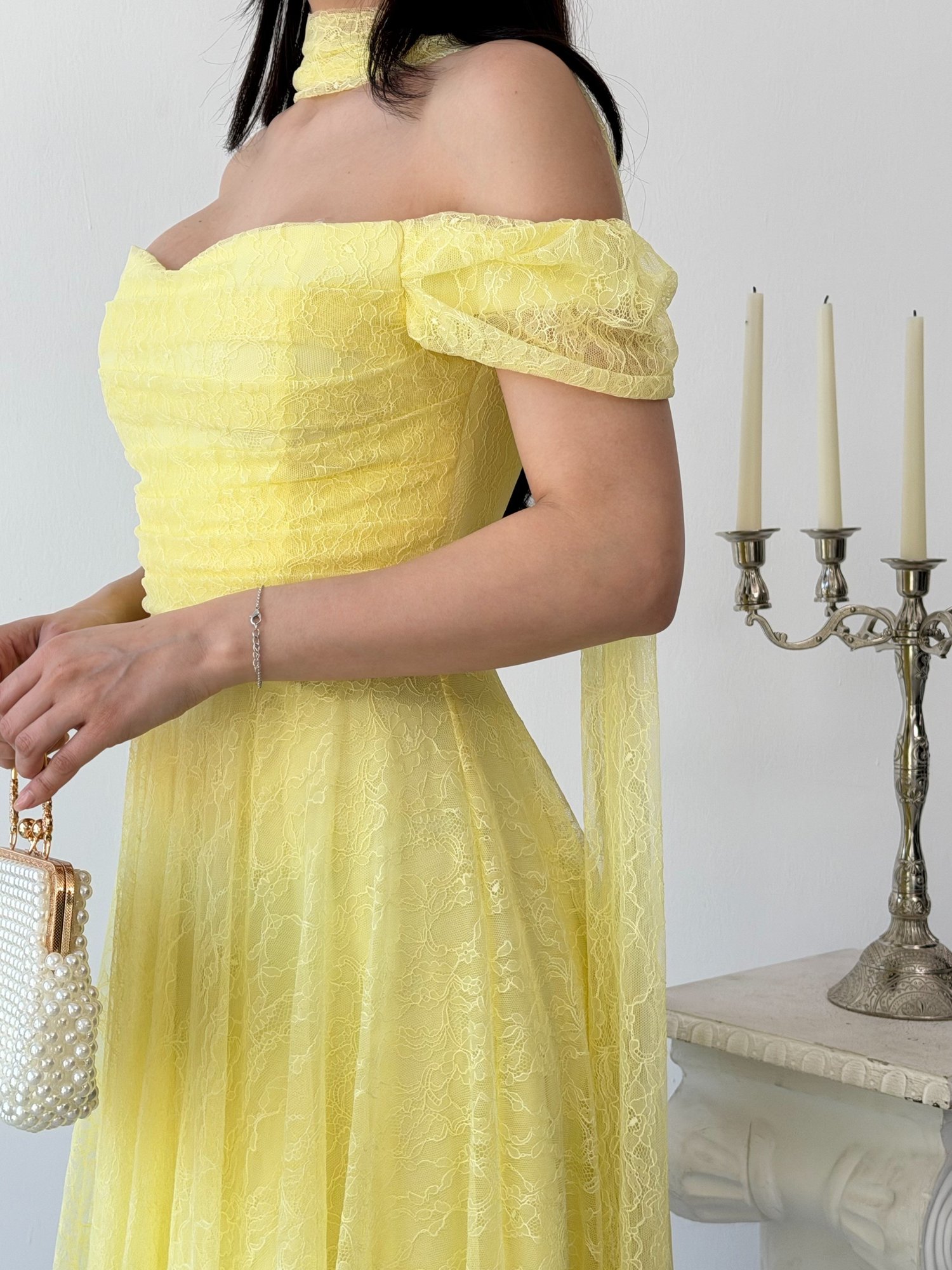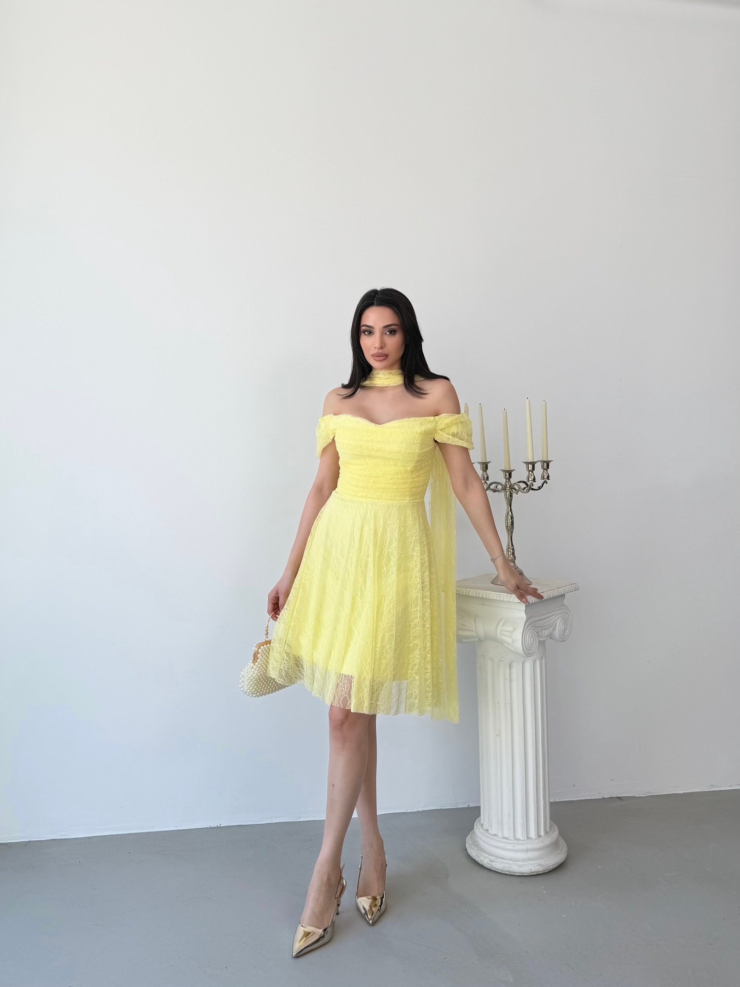 Sarı Omuz Fular Detaylı Dantel Kumaş Kısa Abiye Elbise