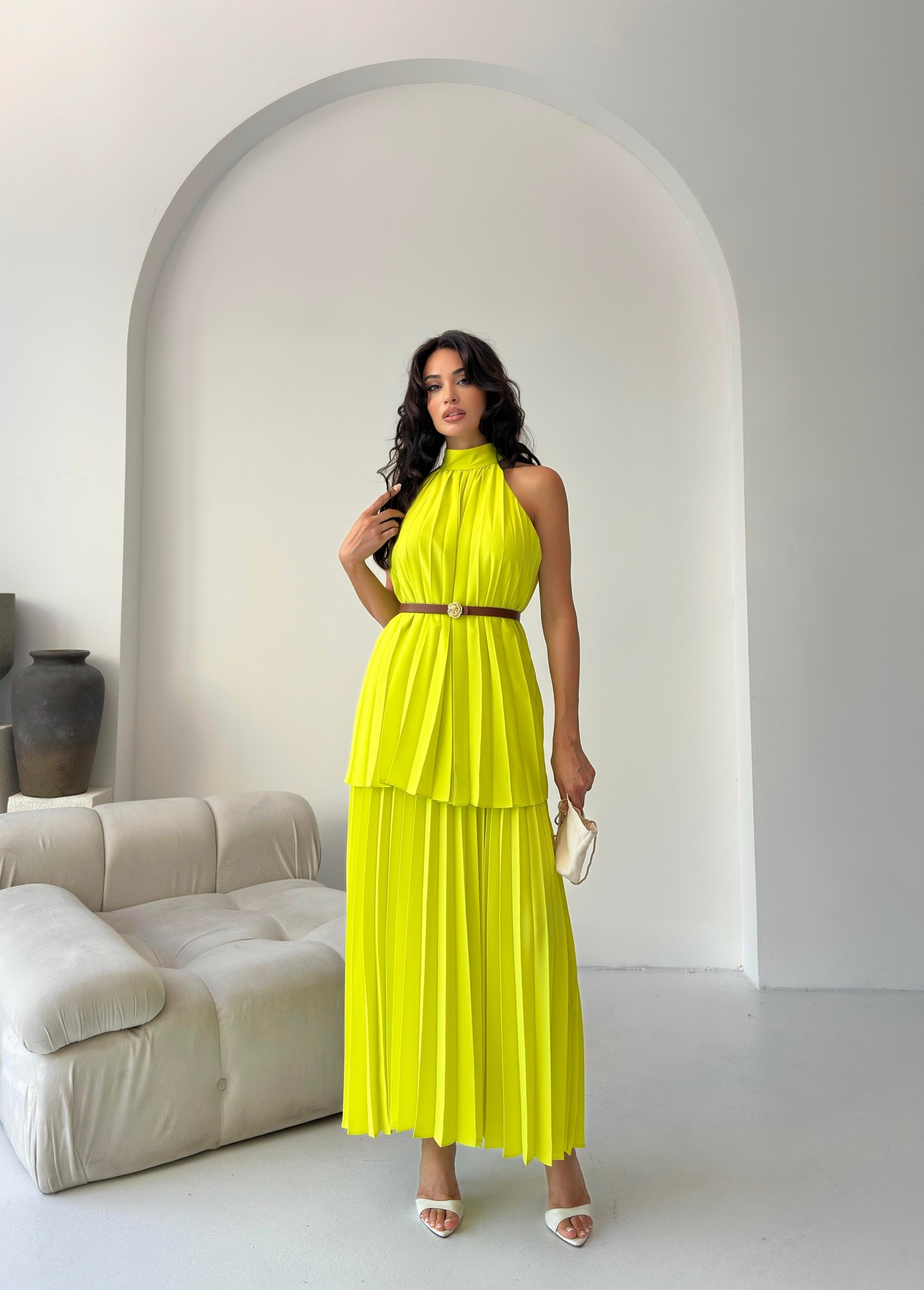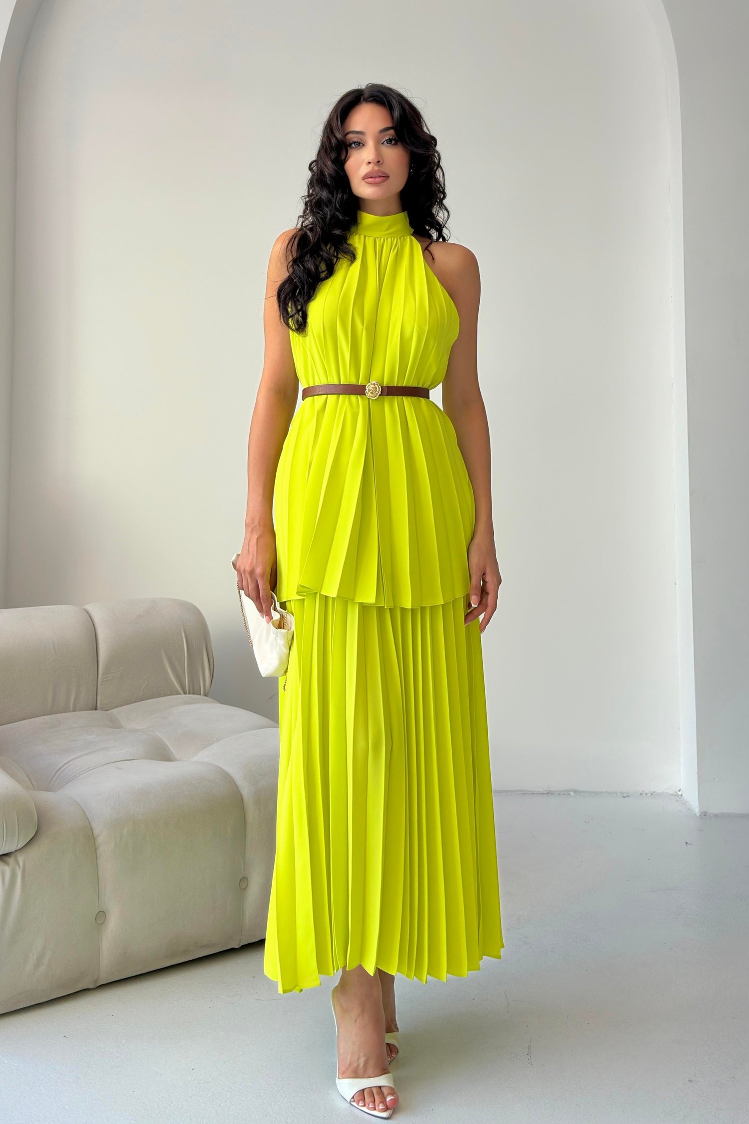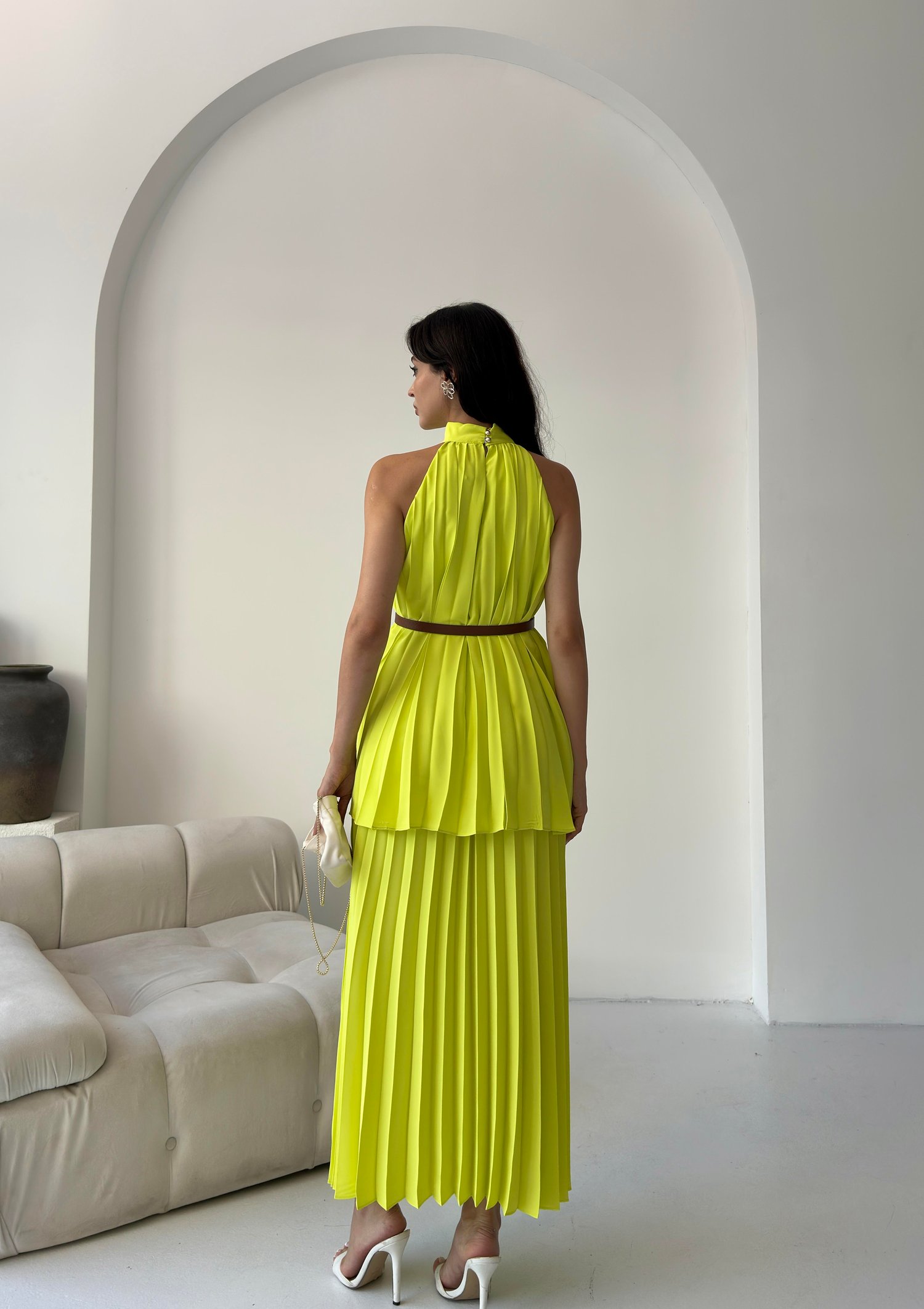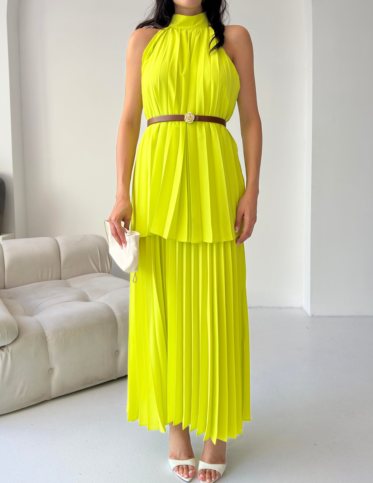 Sarı Pileli Halter Yaka Kemerli Elbise