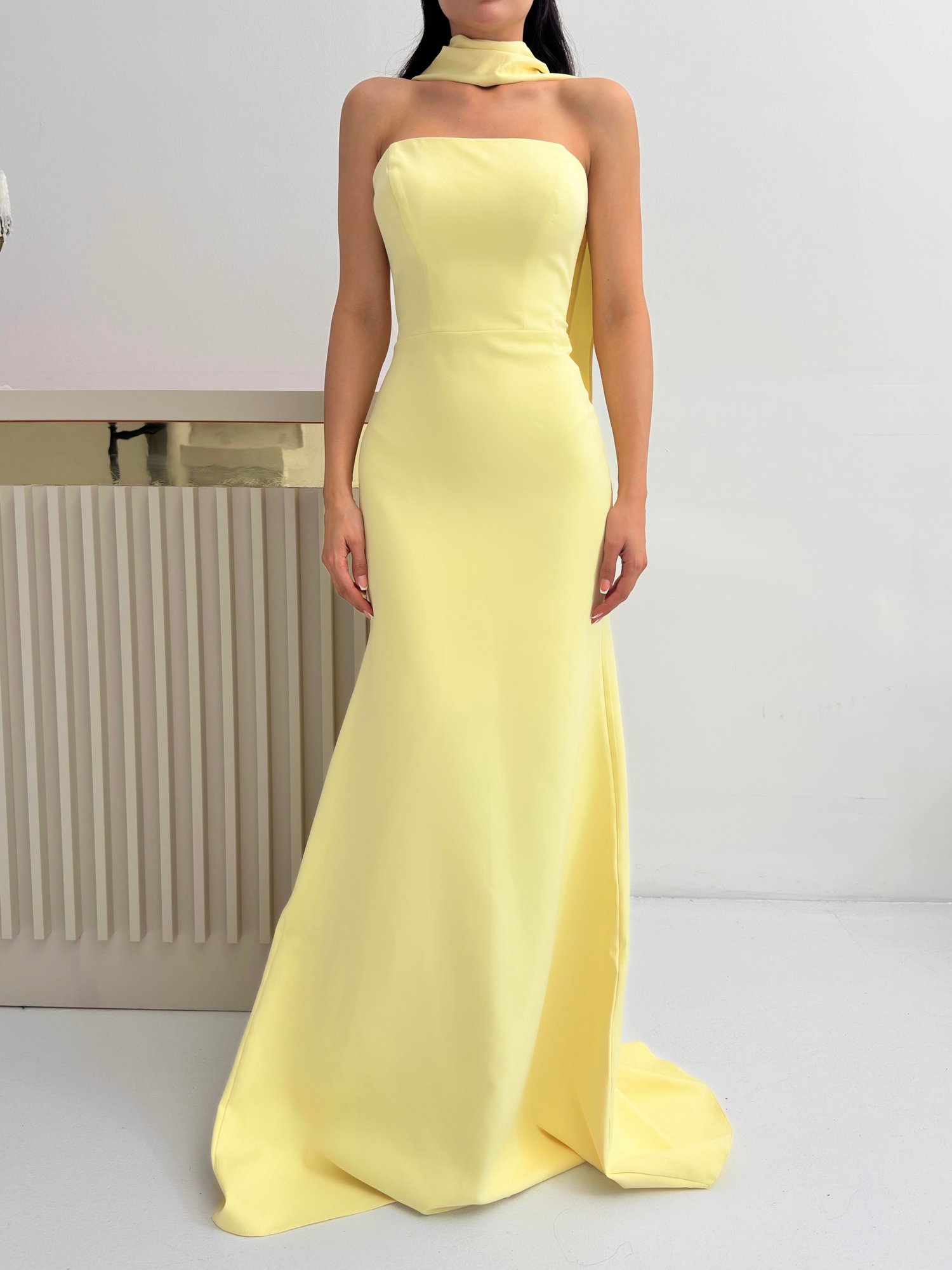 Sarı Şal Yaka Detaylı Straplez Abiye Elbise