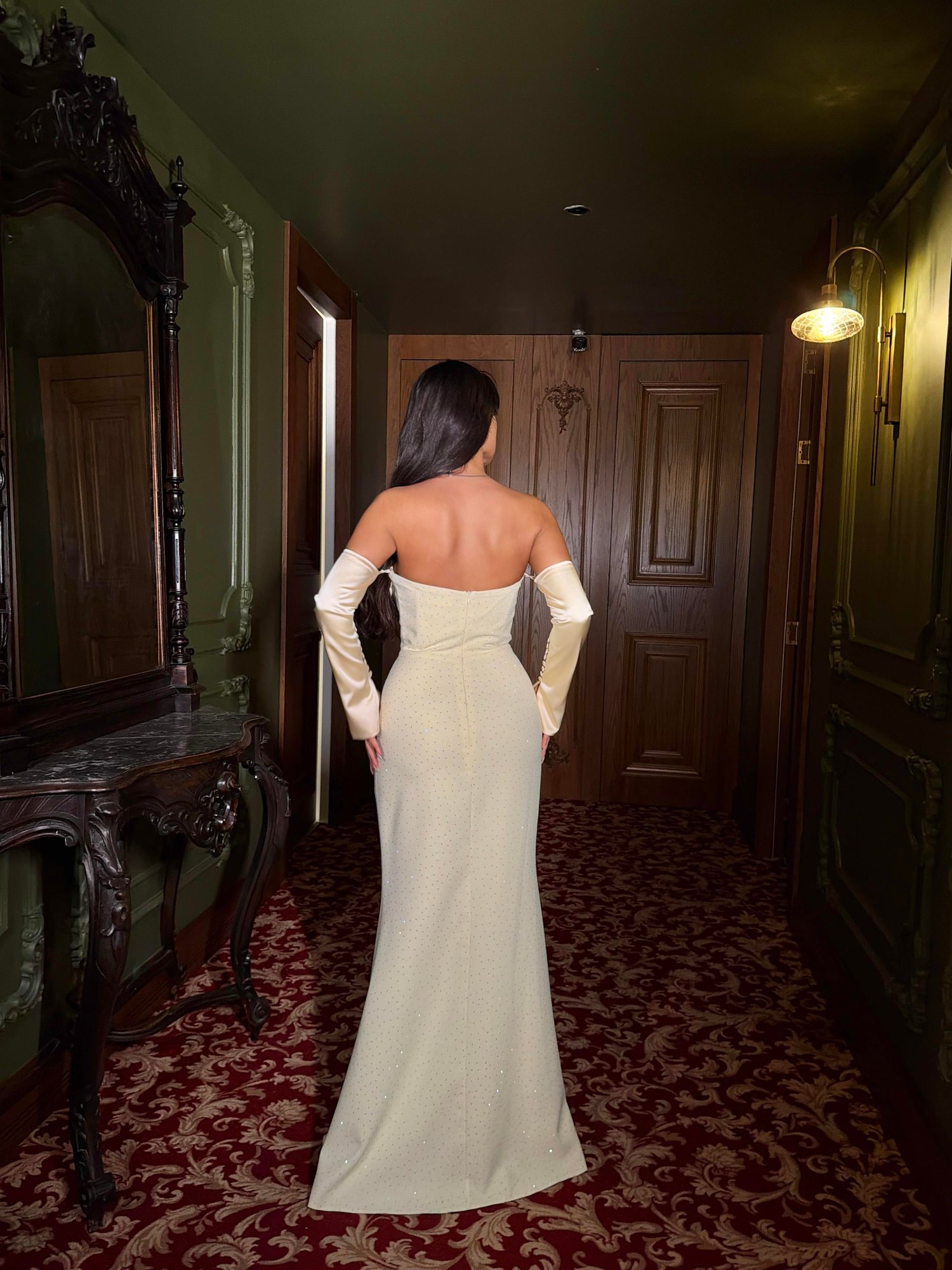 Sarı Saten Kol Detaylı Taş Baskılı Elbise