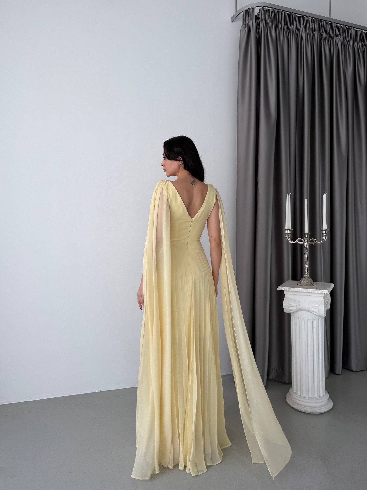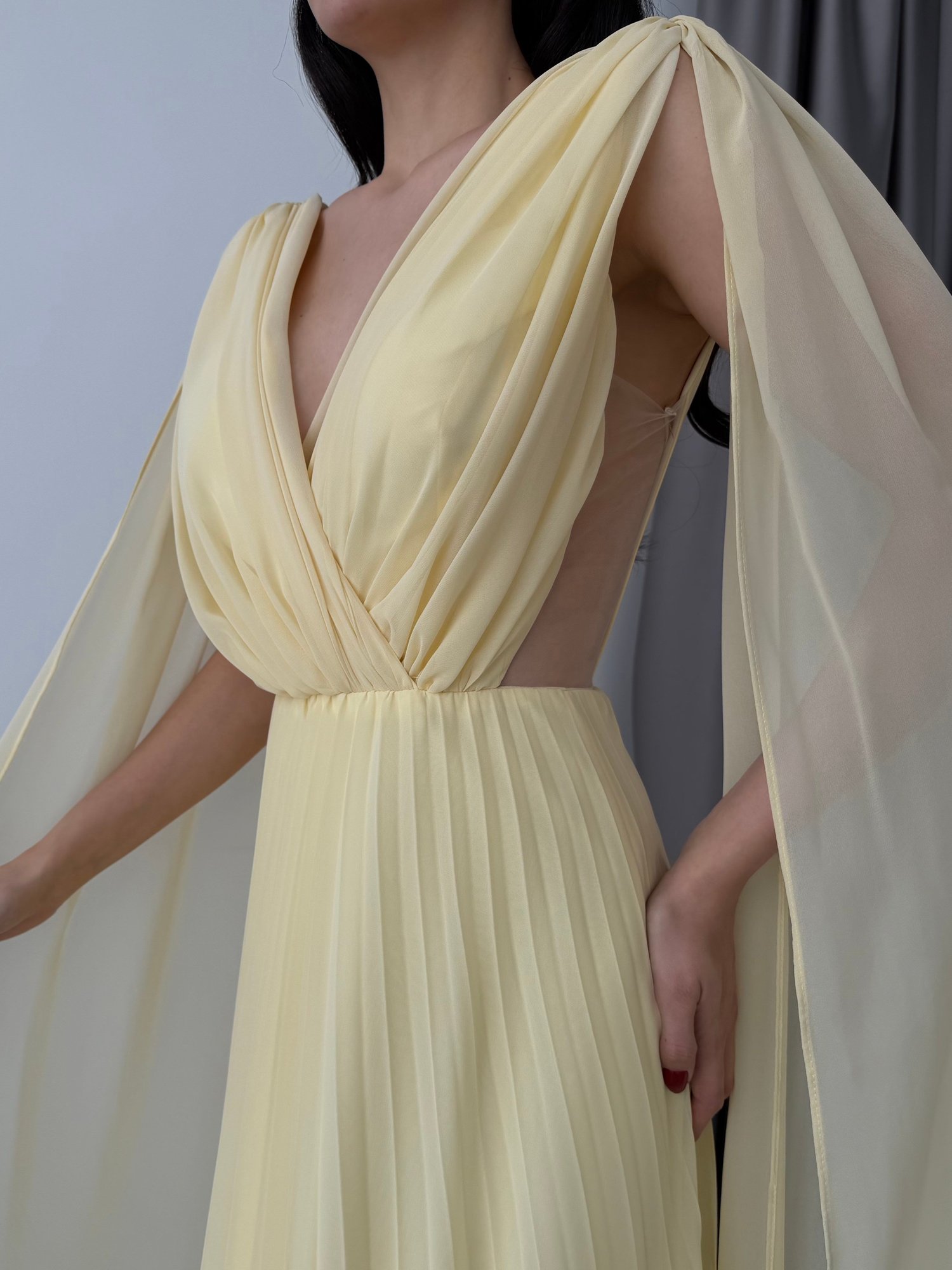 V yaka formu ve omuzlardan dökülen pelerin detaylı tasarımıyla öne çıkan bu abiye elbise, güçlü ve asil bir siluet sunar. Üst kısmındaki zarif drape detayı göğüs ve bel hattını dengeli şekilde vurgularken, belden itibaren piliseli ve akıcı formda inen eteği hareketli ve zarif bir görünüm sağlar. Zamansız siyah rengi sayesinde hem klasik hem de çarpıcı bir şıklık sunar.