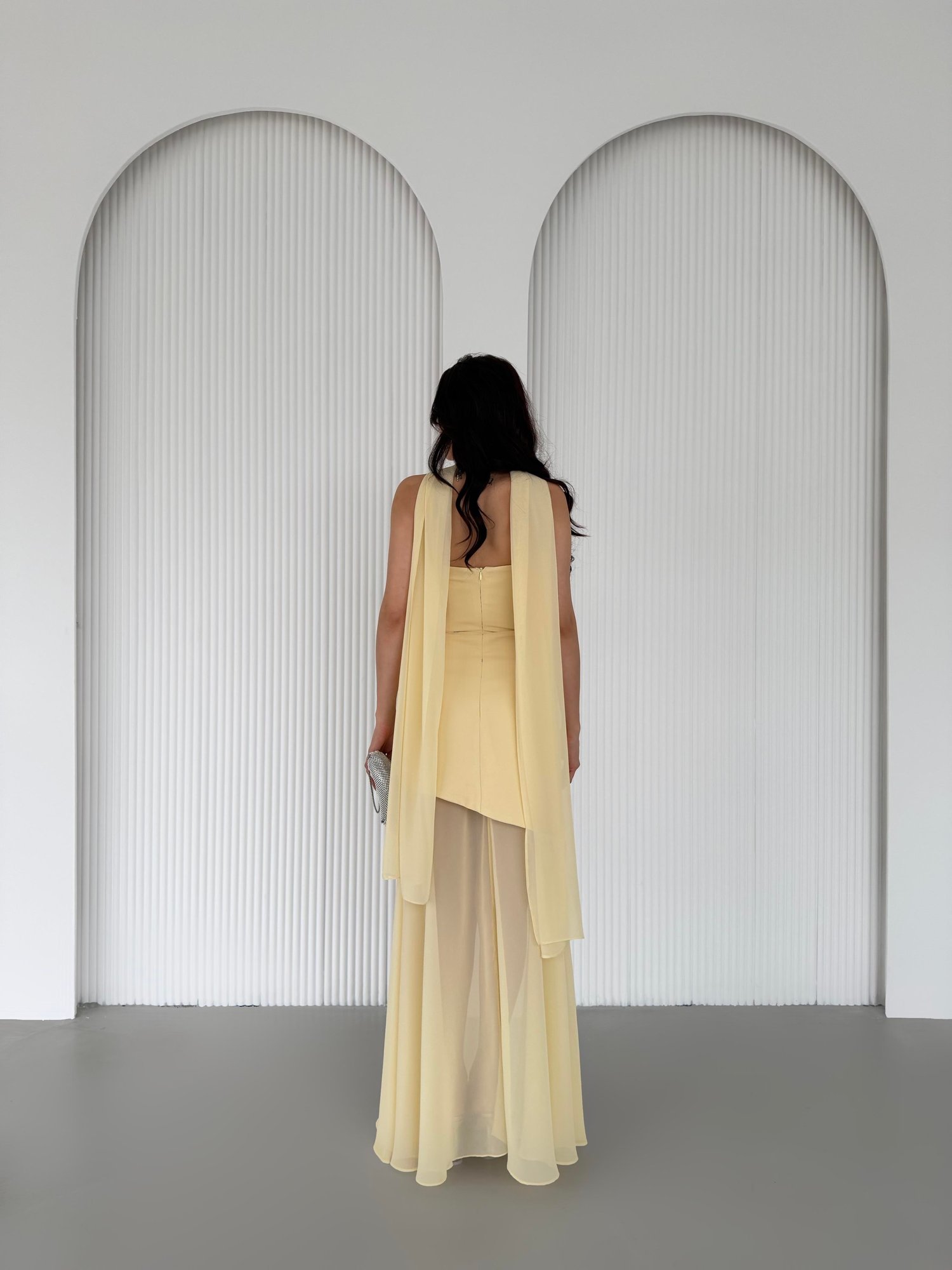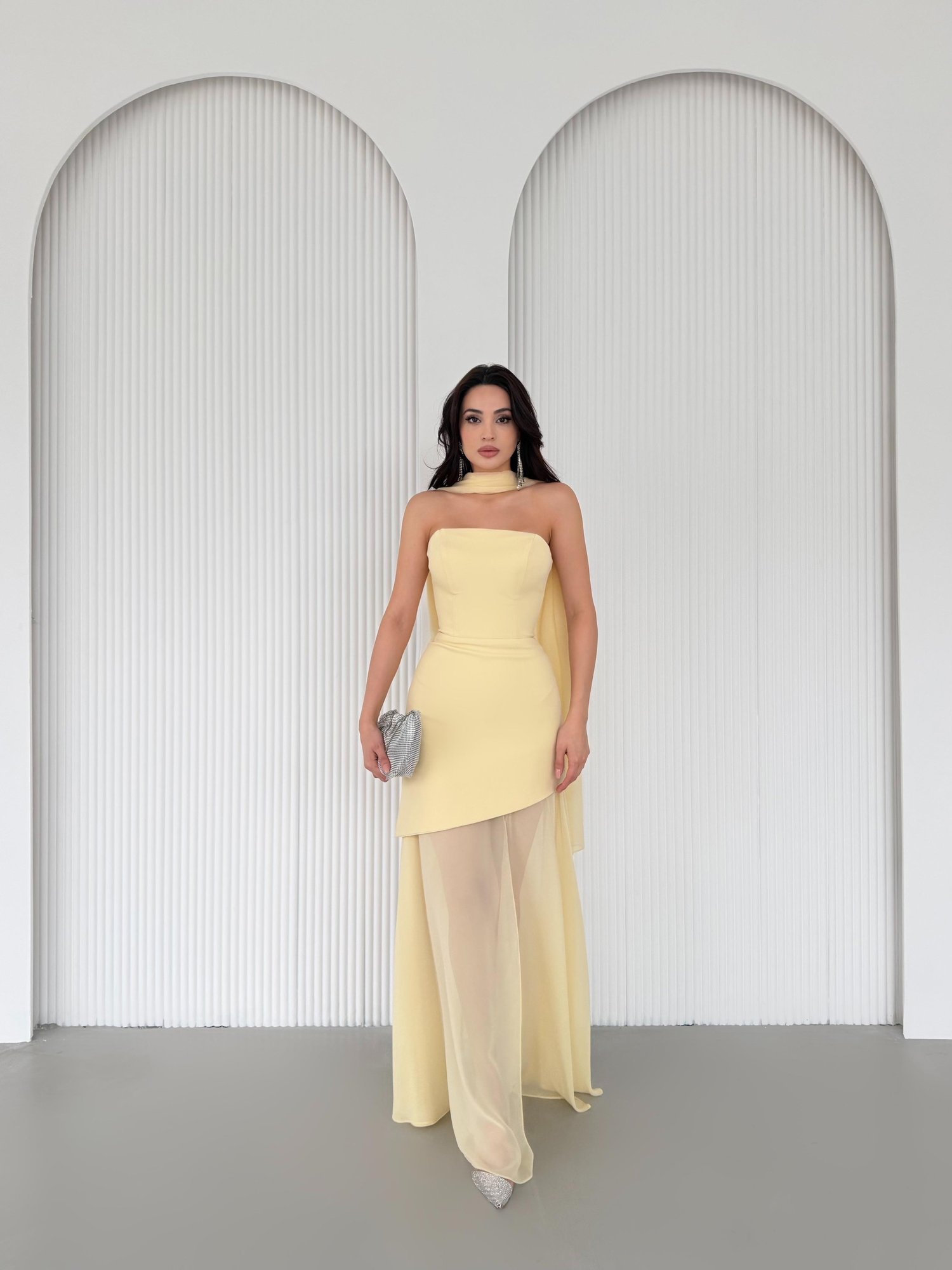 Sarı Tül Etekli Şal Detaylı Straplez Abiye Elbise