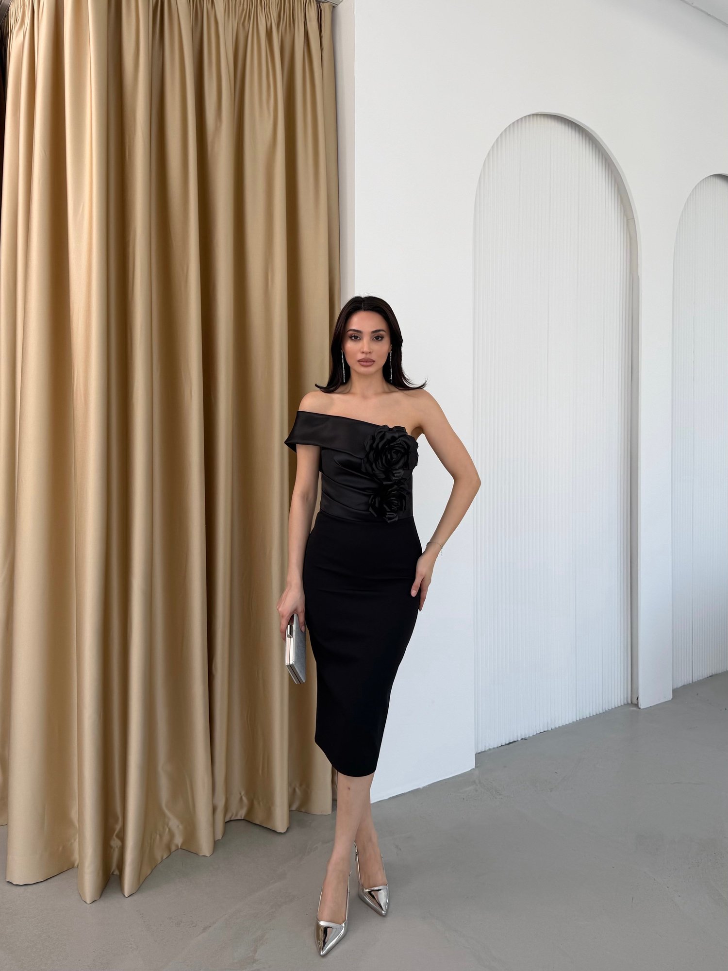 Zarif ve modern tasarımıyla öne çıkan bu midi boy abiye elbise, feminen detayları ve sade şıklığıyla dikkat çeker. Tek omuzdan düşen asimetrik yaka kesimi omuz hattını zarif bir şekilde ortaya çıkarırken, göğüs ve bel kısmında yer alan üç boyutlu çiçek aplikeleri tasarıma romantik ve sofistike bir dokunuş katar. Vücuda oturan formu silueti kusursuz şekilde sararken, diz altına uzanan boyu ile dengeli ve elegan bir görünüm sunar.