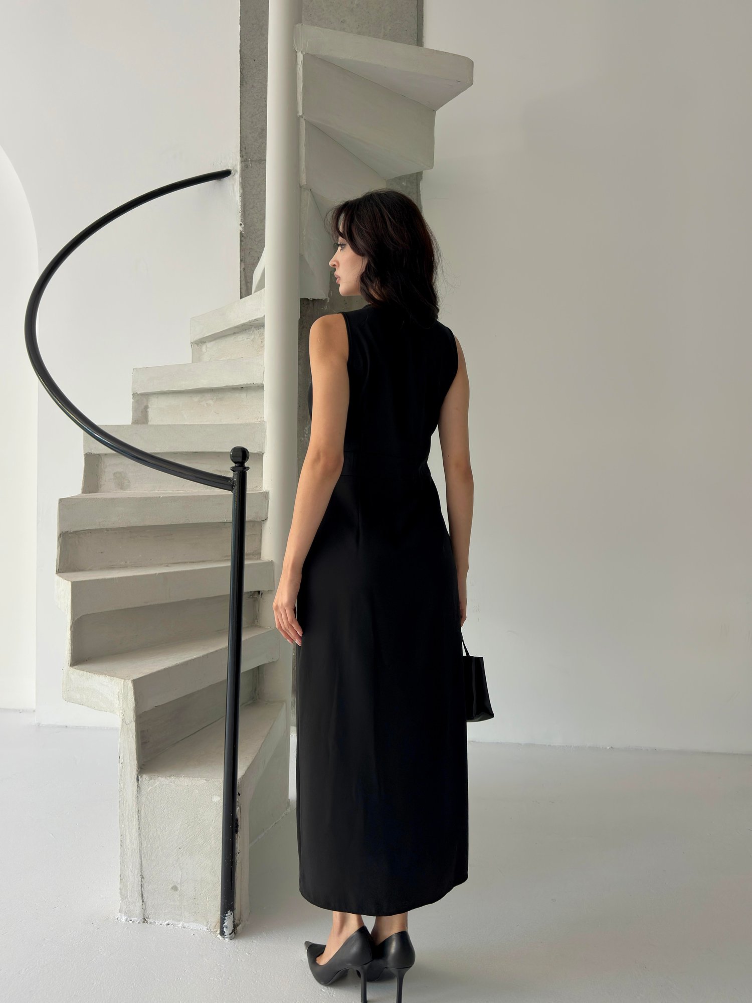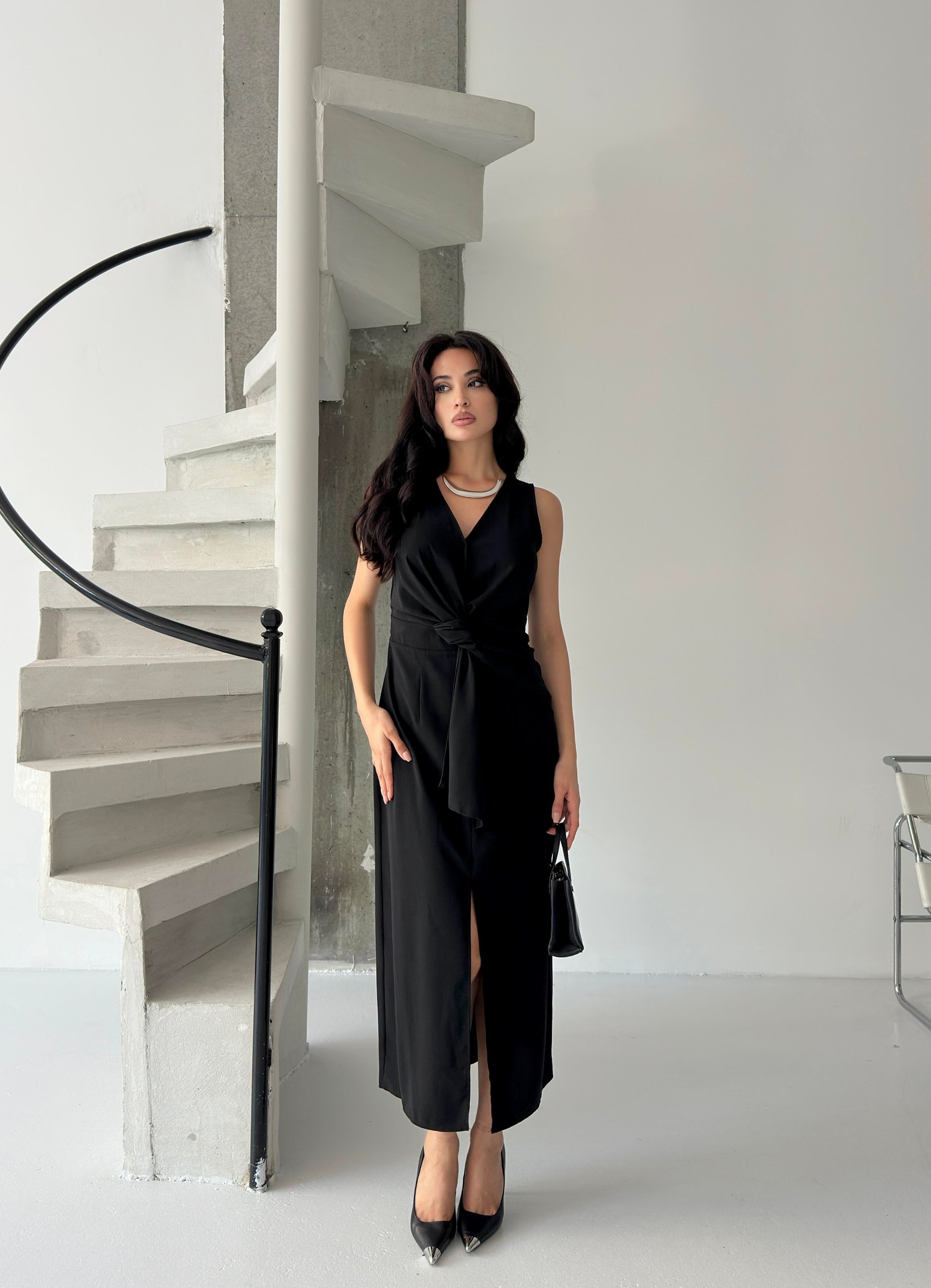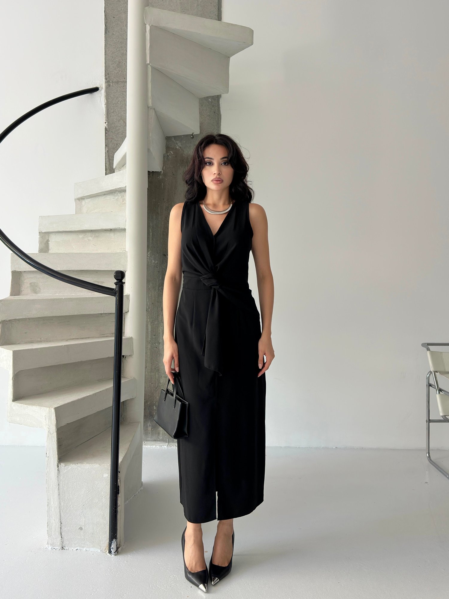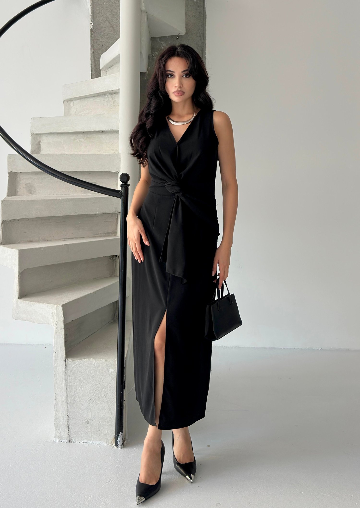 Siyah Bağlama Detaylı Midi Elbise