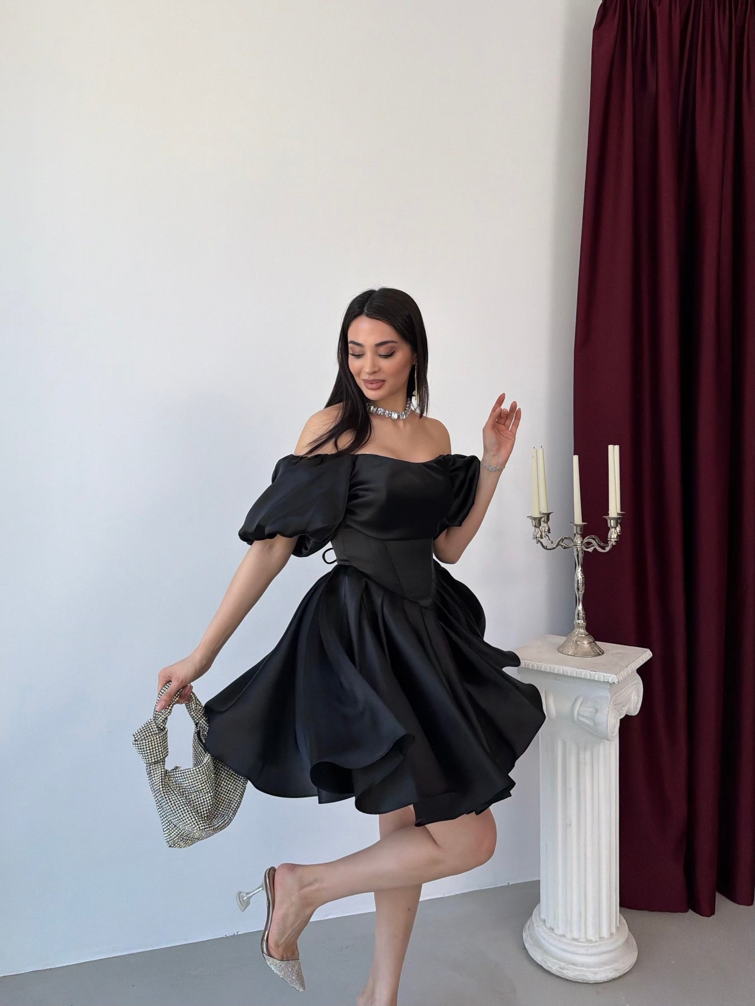 Işıltılı ve iddialı tasarımıyla öne çıkan bu mini abiye elbise, modern prenses siluetiyle dikkat çeker. Düşük omuz (off-shoulder) yaka detayı ve hacimli balon kollar omuz hattını zarifçe vurgularken, korse formundaki üst beden vücudu toparlayarak kusursuz bir görünüm sunar. Belden itibaren genişleyen volanlı etek yapısı hareketli ve feminen bir duruş kazandırır. Parlak saten dokusu sayesinde ışığı yansıtarak göz alıcı bir etki yaratır.