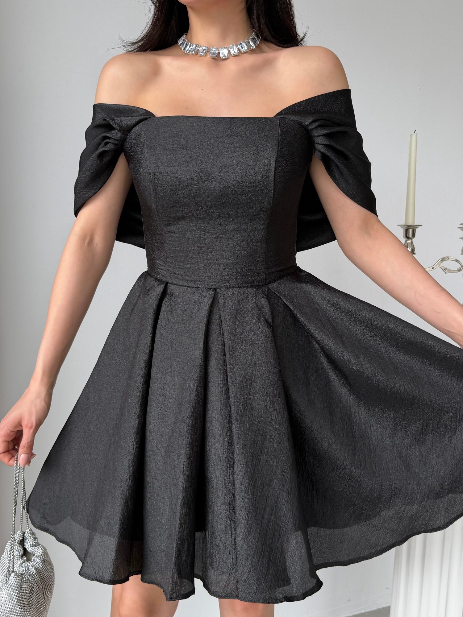 Zarif ve enerjik tasarımıyla öne çıkan bu kısa abiye elbise, hareketli formu ve modern detaylarıyla dikkat çekici bir siluet sunar. Düşük omuz (off-shoulder) yaka kesimi omuzları zarif şekilde ortaya çıkarırken, üst bedendeki minimal ve sade yapı şıklığı ön plana taşır. Belden oturtmalı formu ve geniş açılan kloş etek kesimi, feminen ve dinamik bir görünüm kazandırır. Hafif dokusu sayesinde gün boyu konforlu bir kullanım sunar.