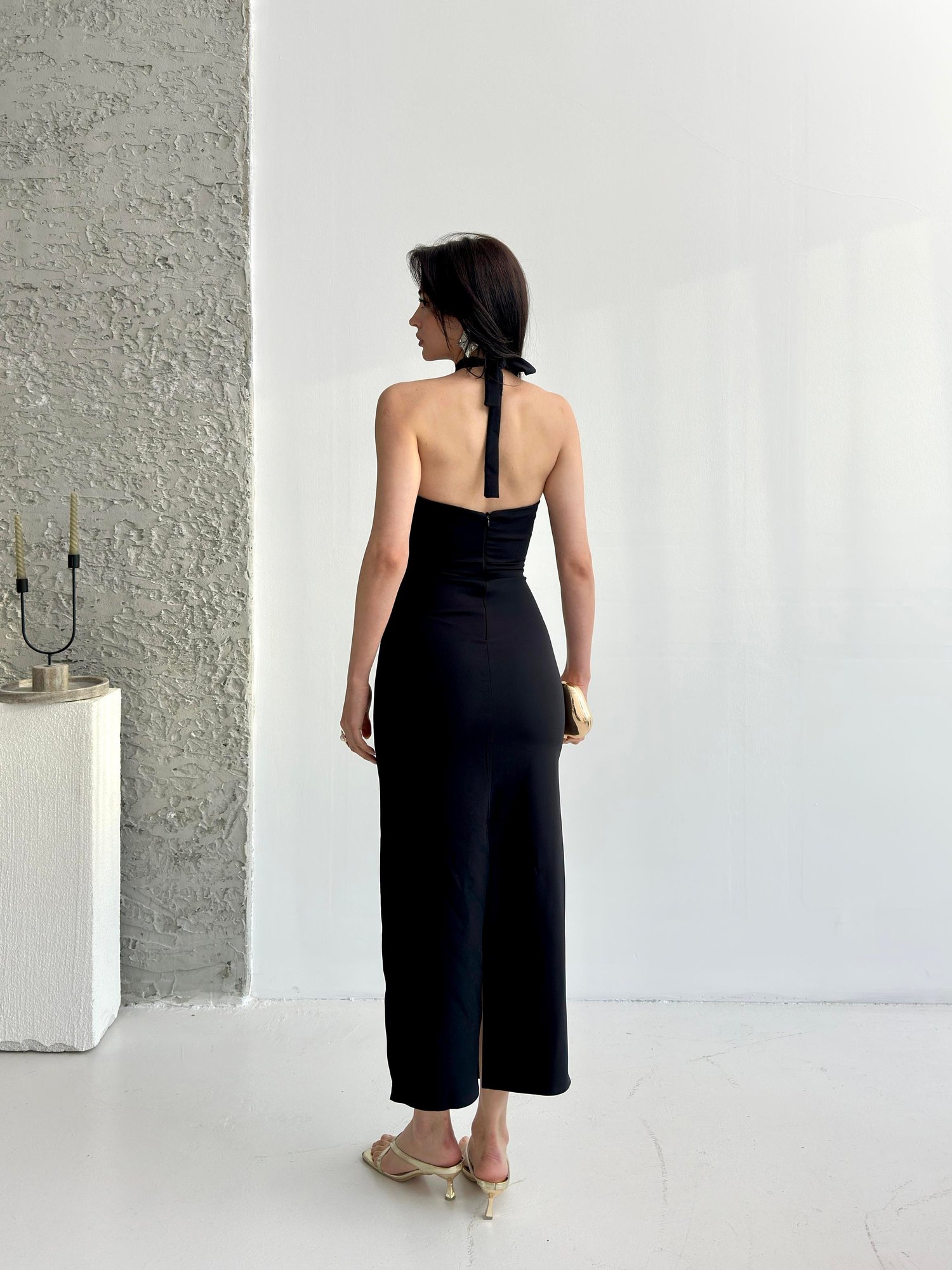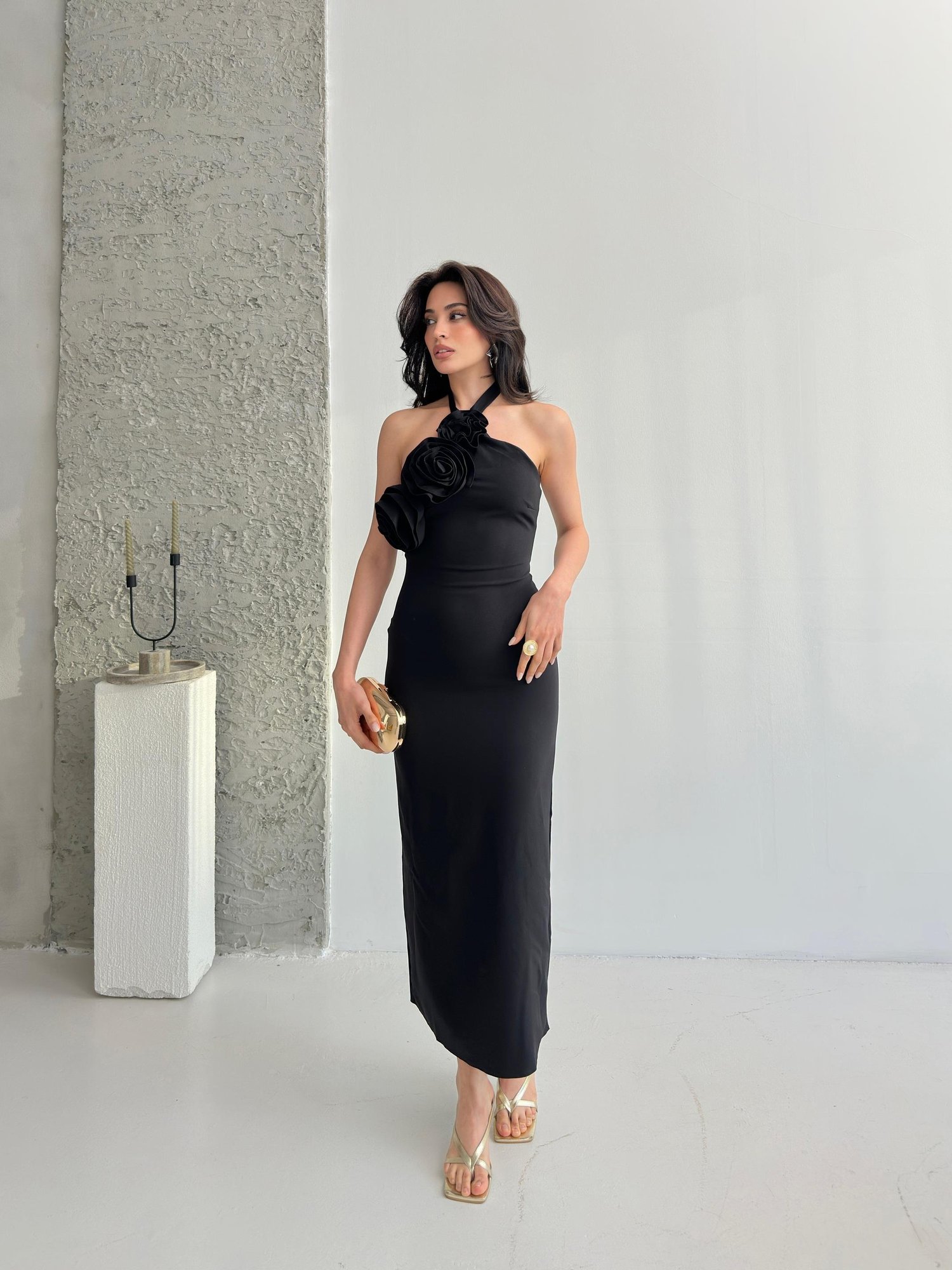 Siyah Gül Detaylı Bağlamalı Elbise Kırmızı Gül Detaylı Bağlamalı Elbise