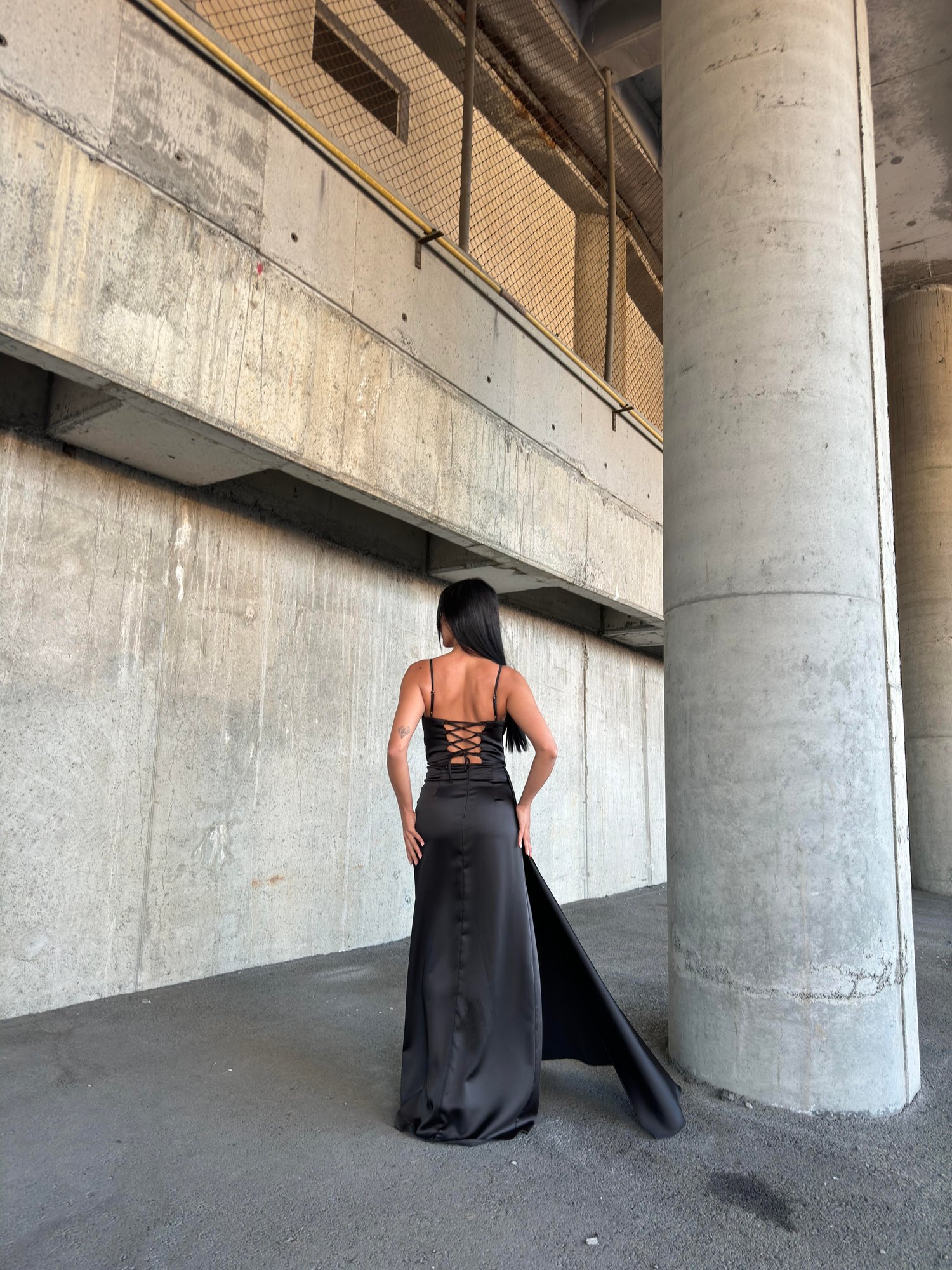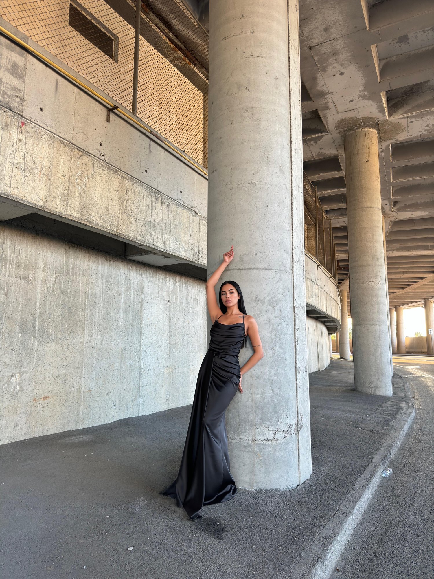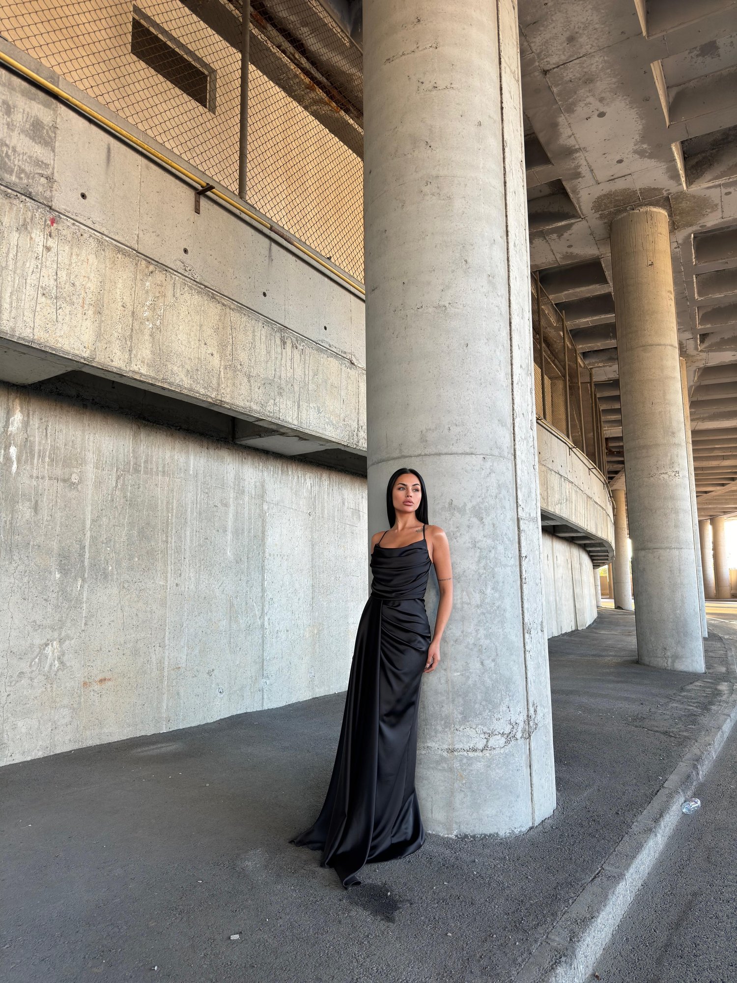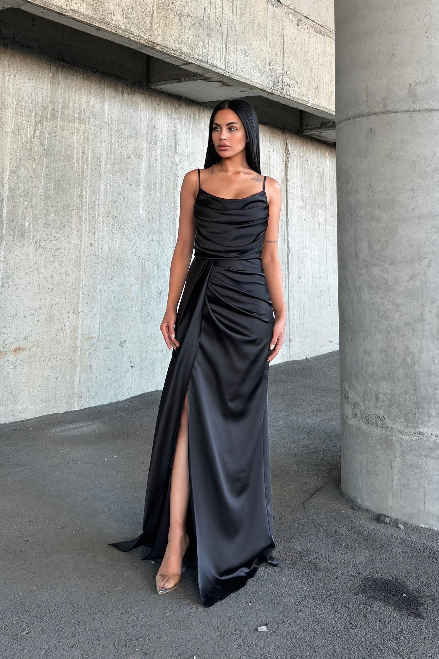 Siyah İp Askılı Drapeli Yırtmaçlı Saten Uzun Abiye Elbise