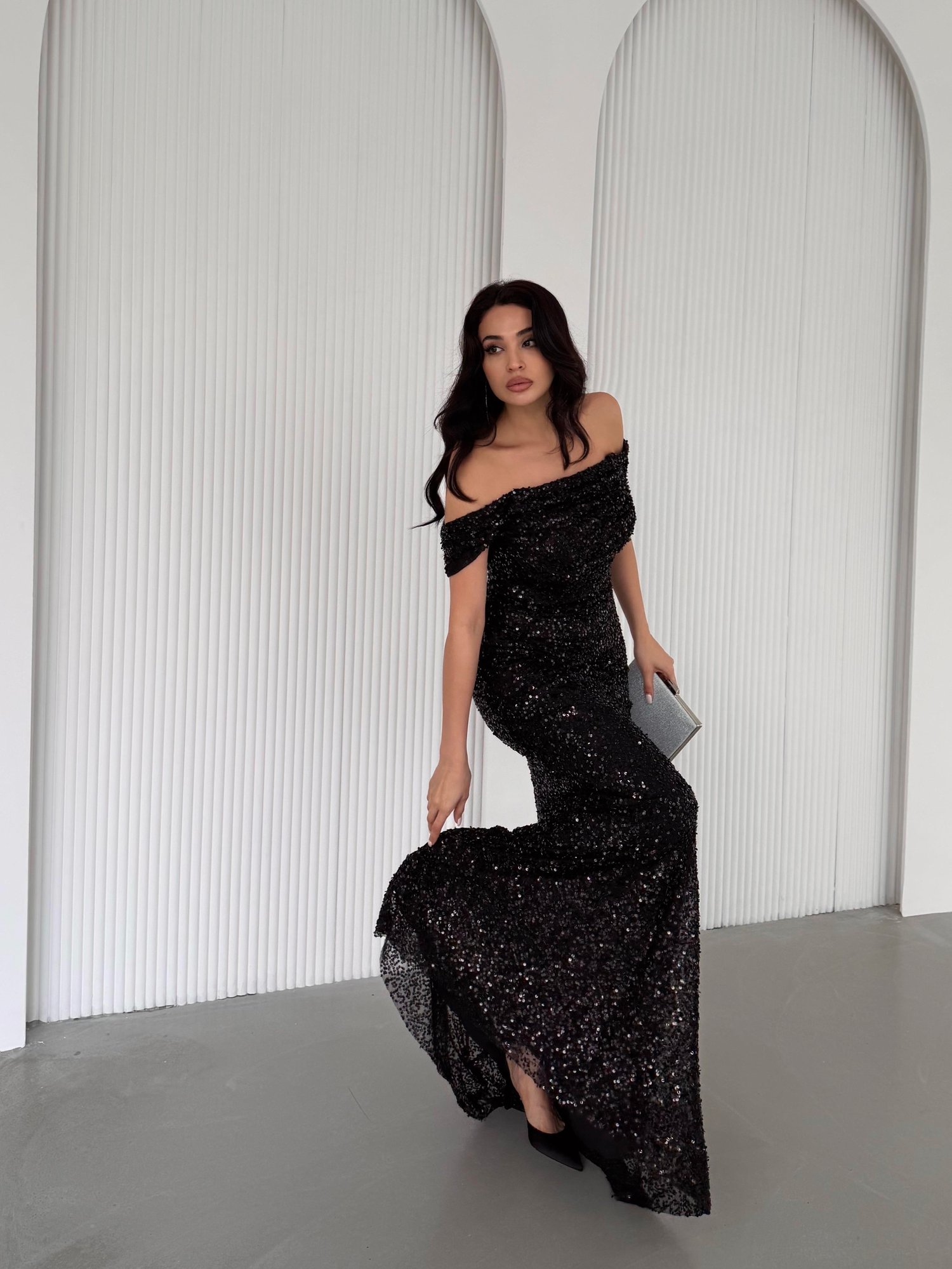 Siyah Kayık Yaka Pul Payetli Abiye Elbise
