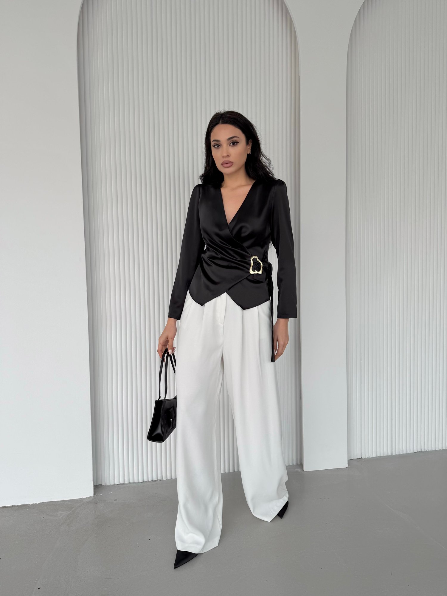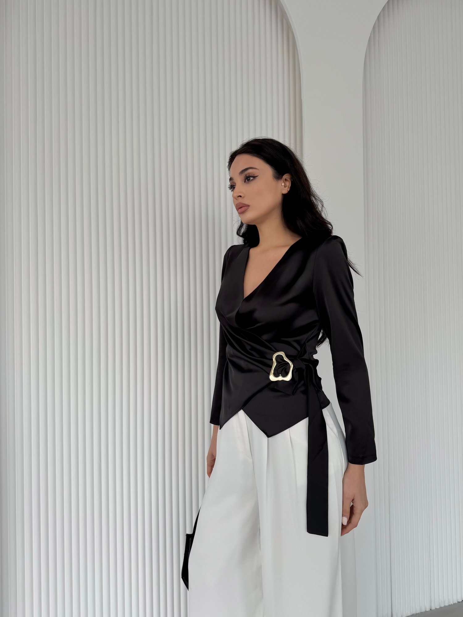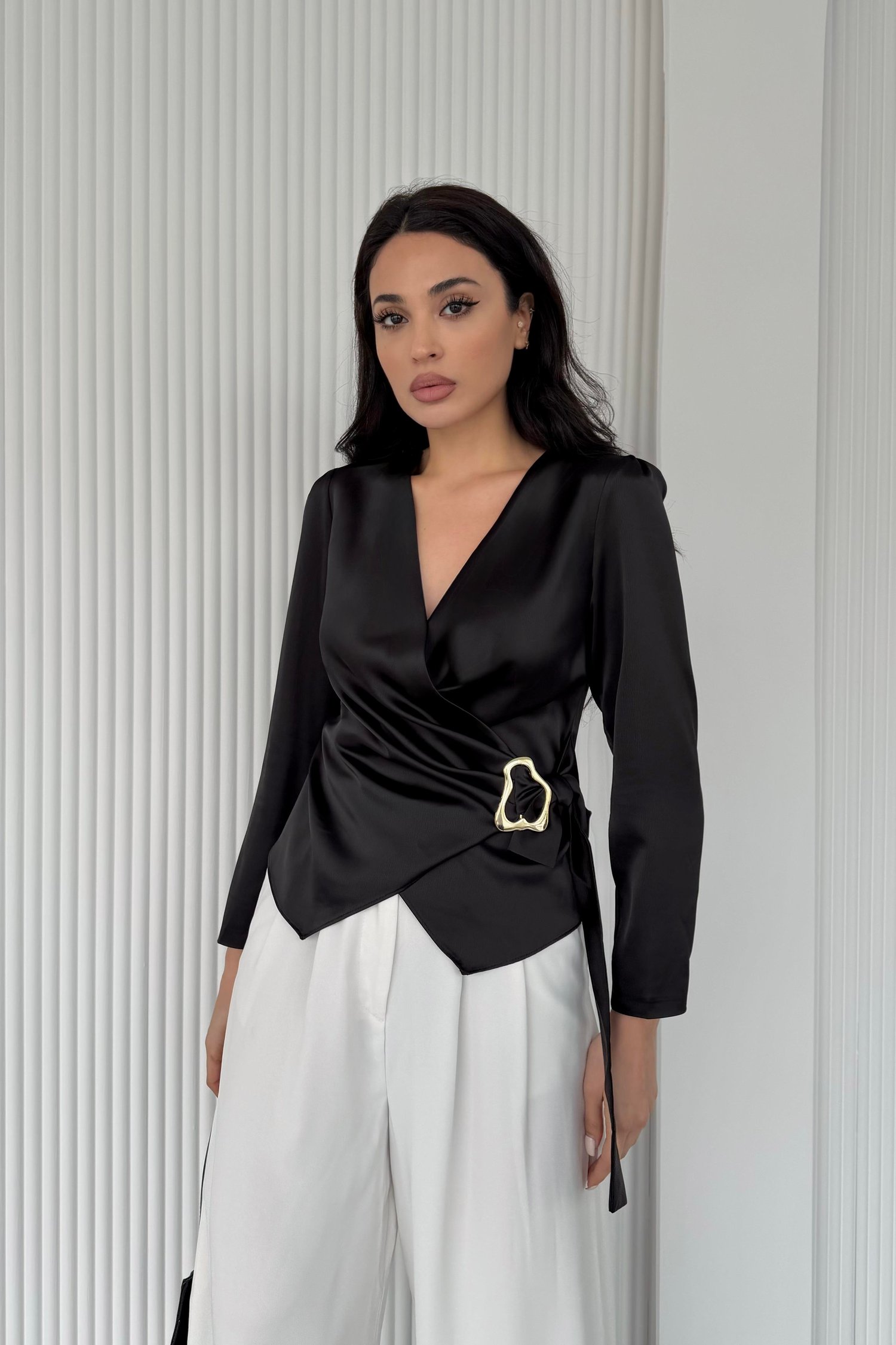 Siyah Kruvaze Yaka Toka Detaylı Saten Bluz