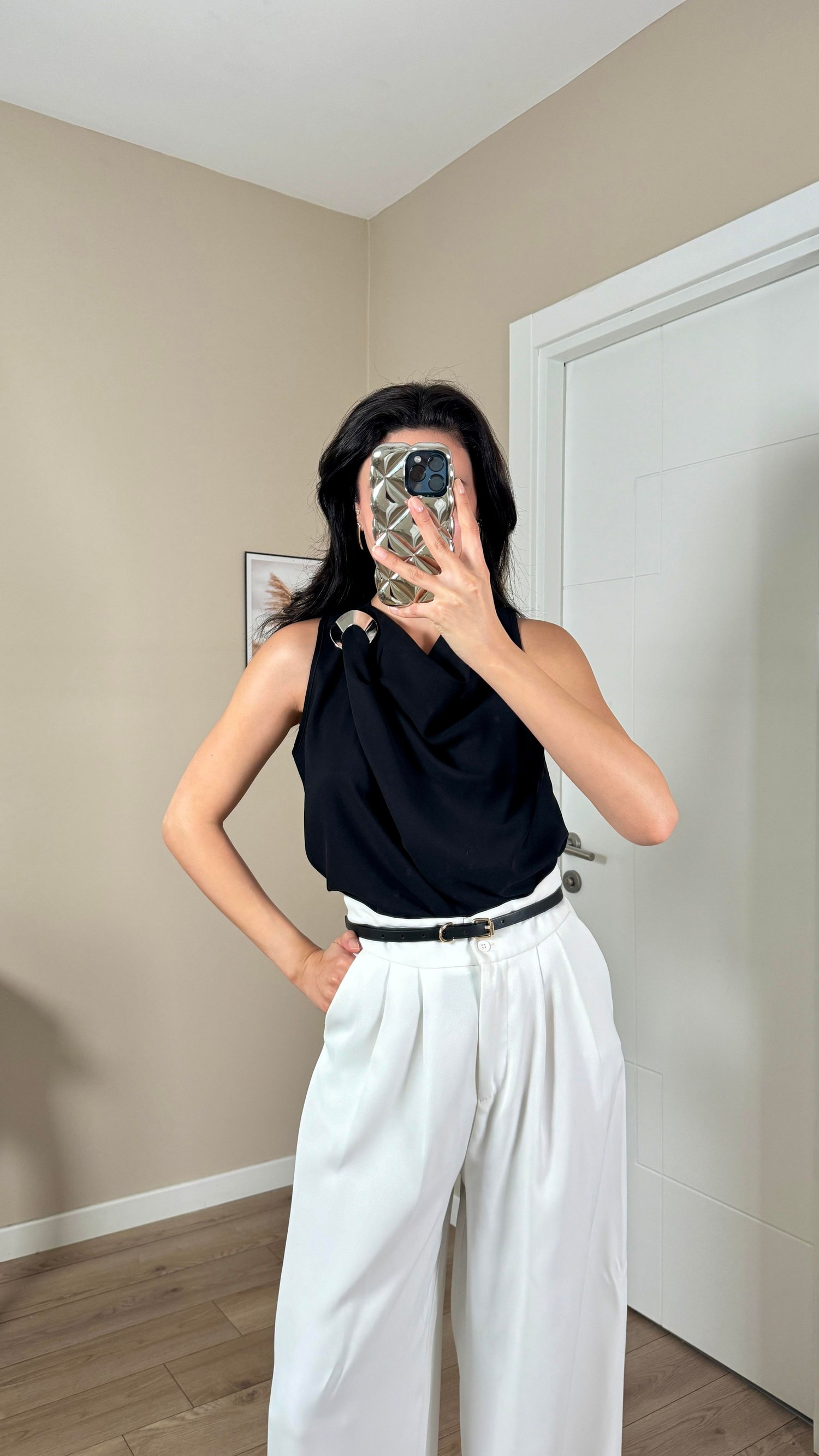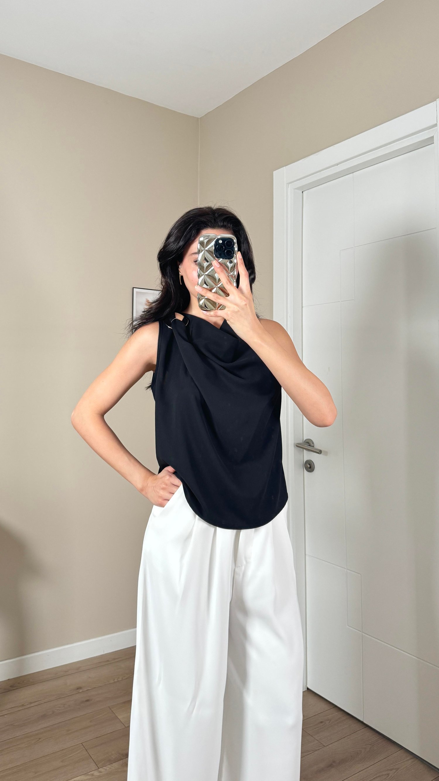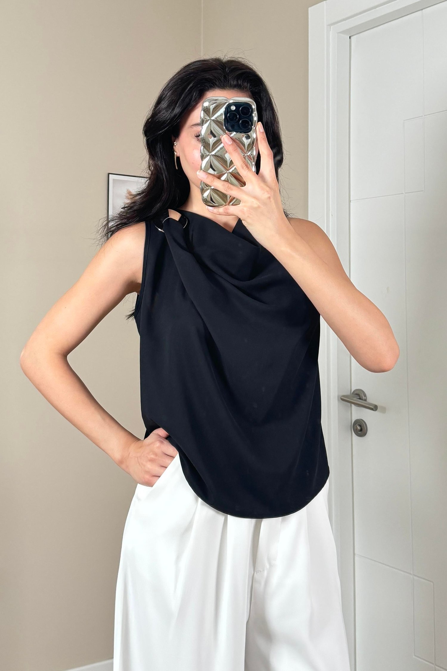 Siyah Omuz Tokalı Degaje Yaka Kolsuz Bluz