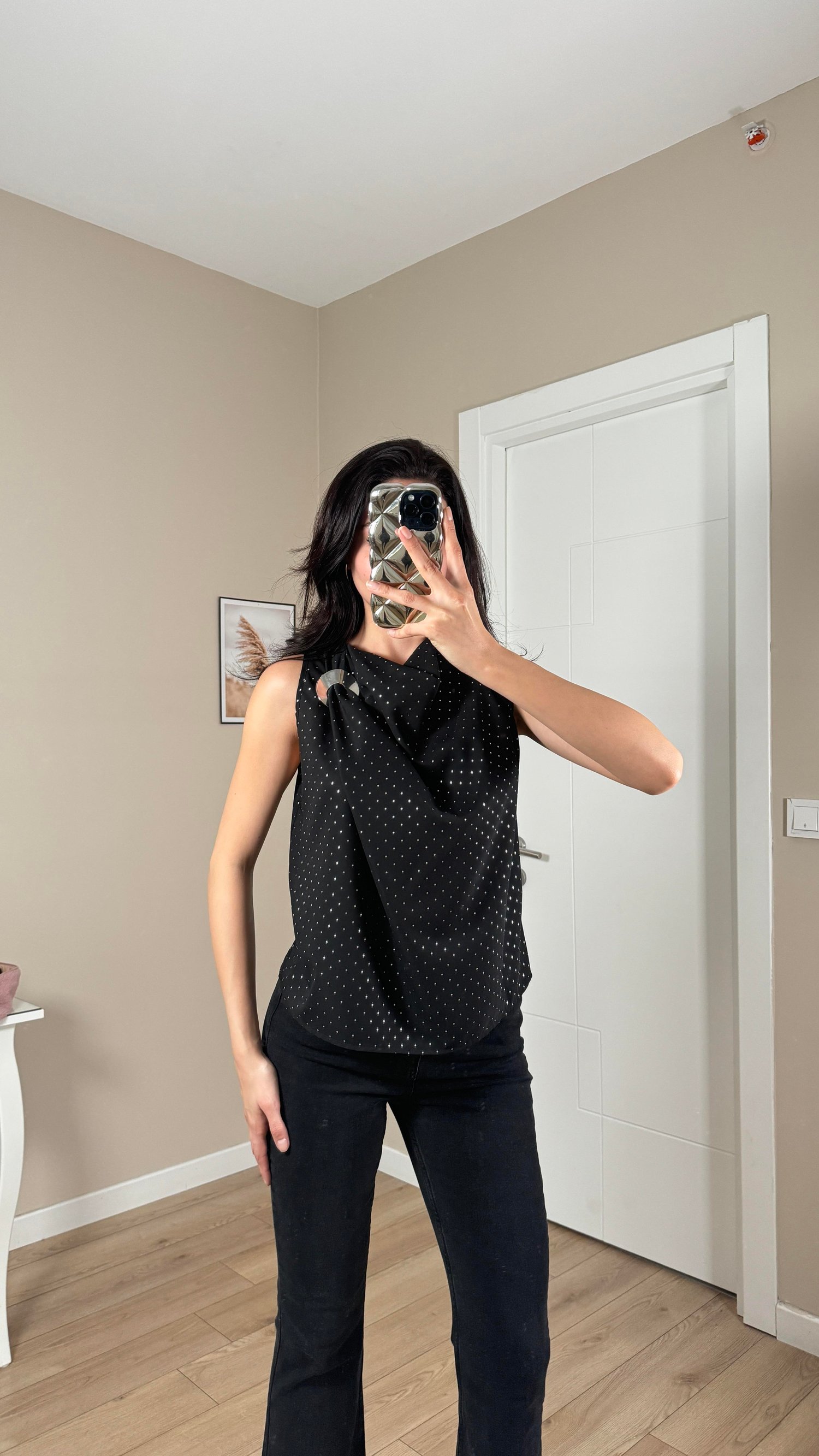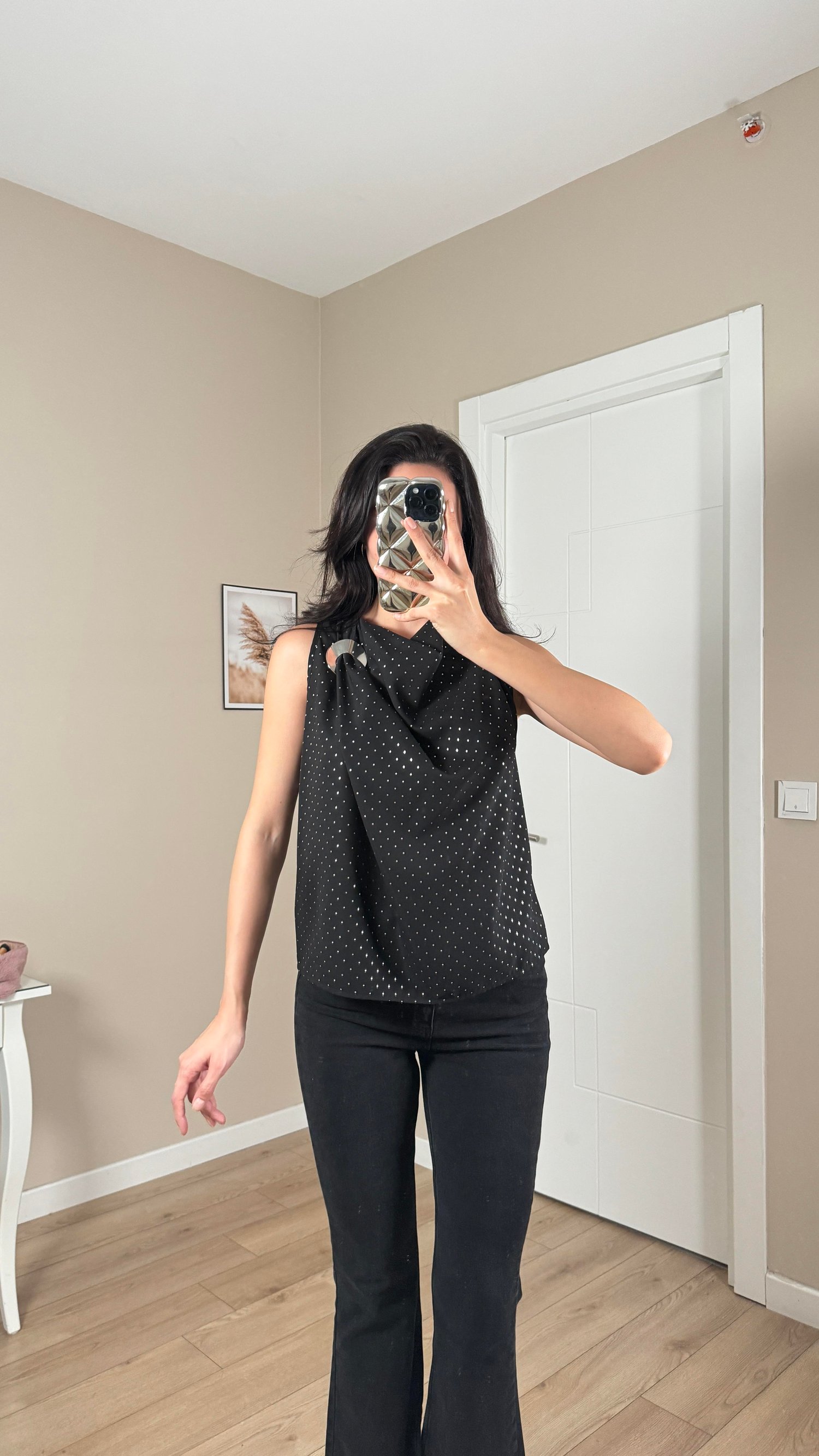 Siyah Omuz Tokalı Puantiyeli Degaje Yaka Bluz