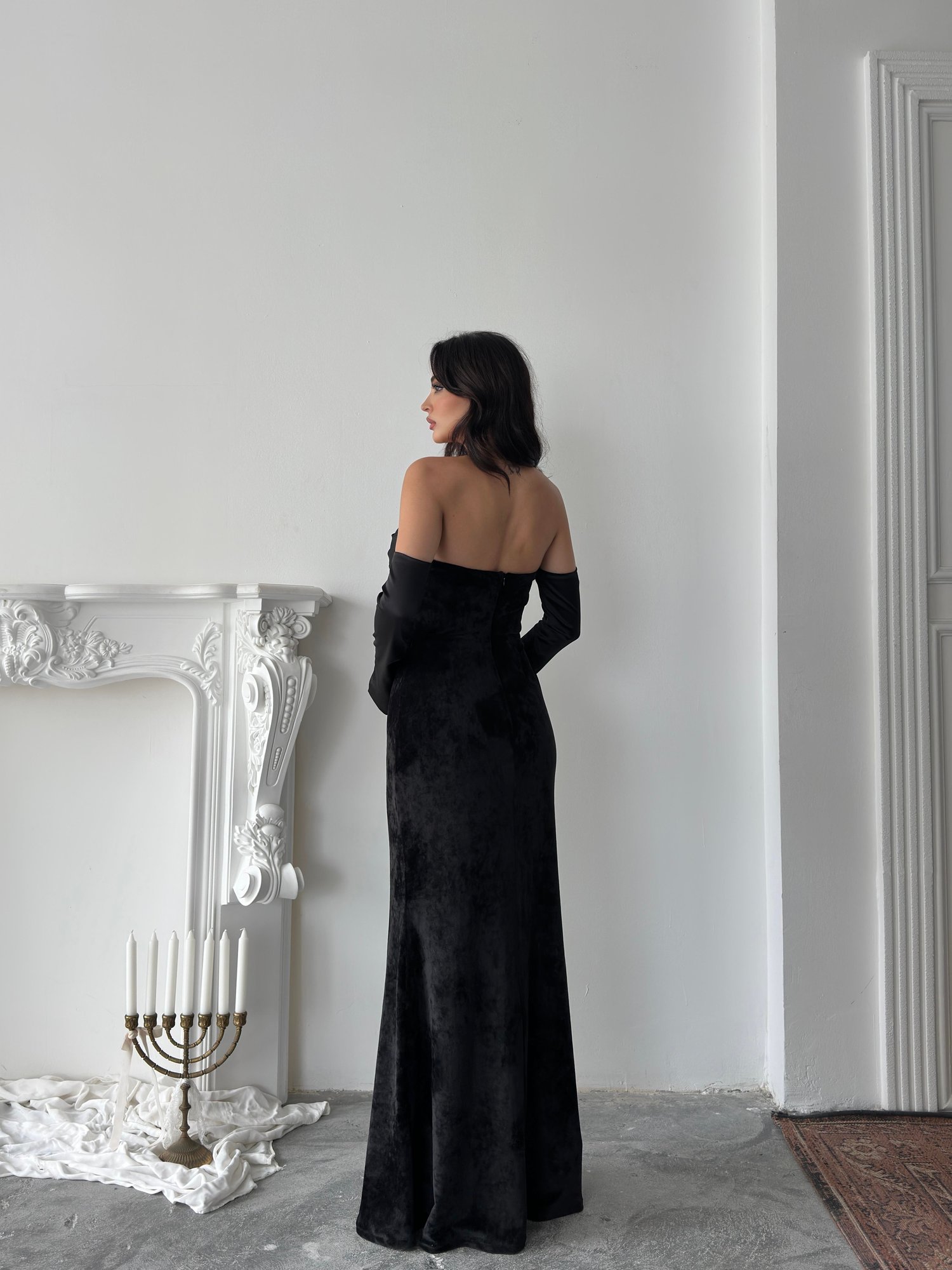 Siyah Saten Kol Detaylı Kadife Abiye Elbise Beyaz Saten Kol Detaylı Kadife Abiye Elbise Bej Saten Kol Detaylı Kadife Abiye Elbise