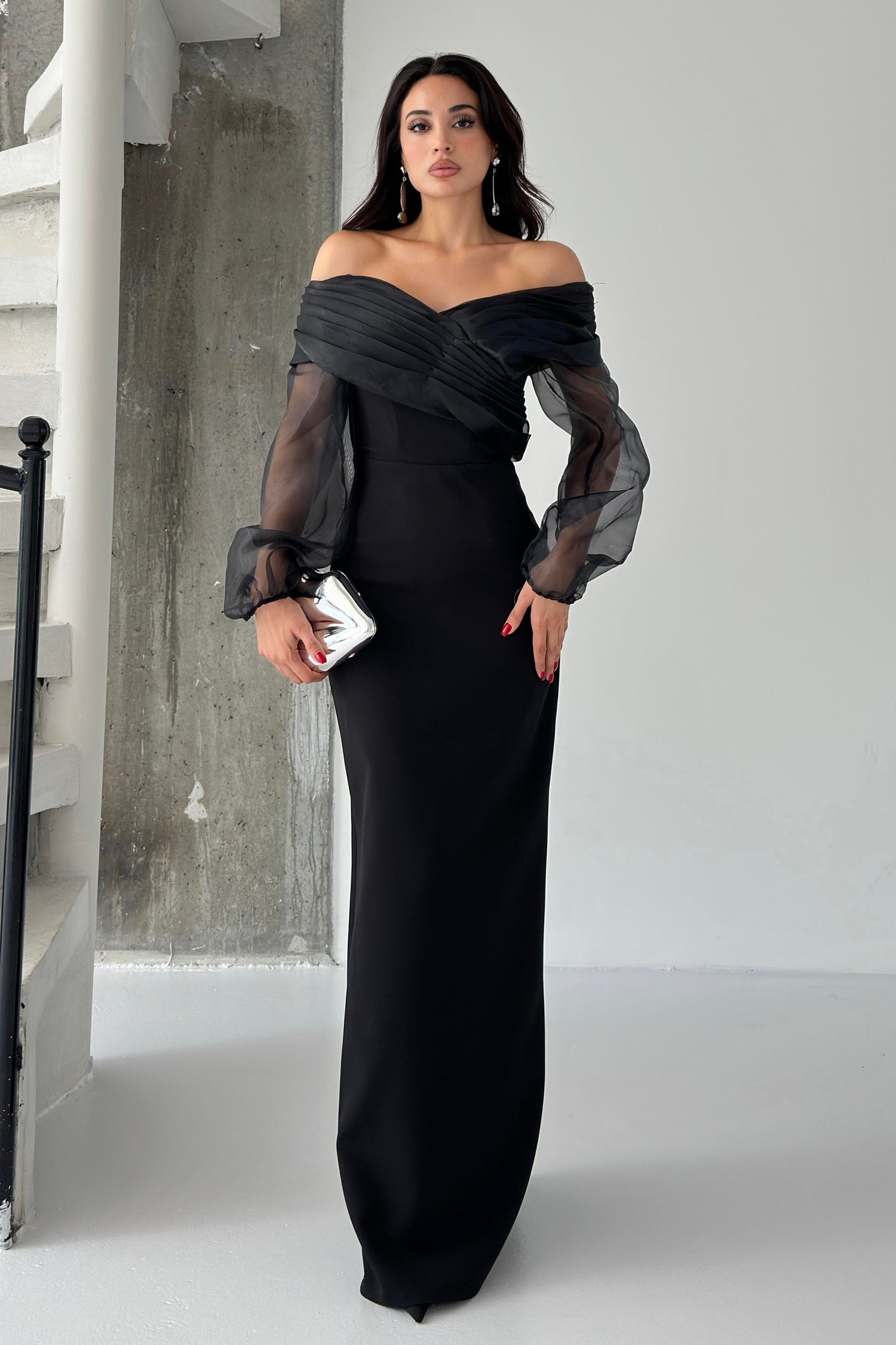 Siyah Şifon Kol Detaylı Düşük Omuz Balık Abiye Elbise