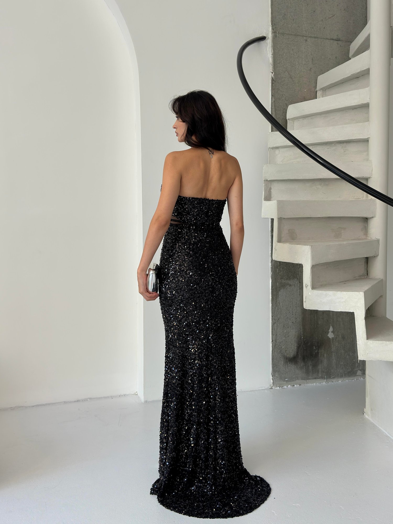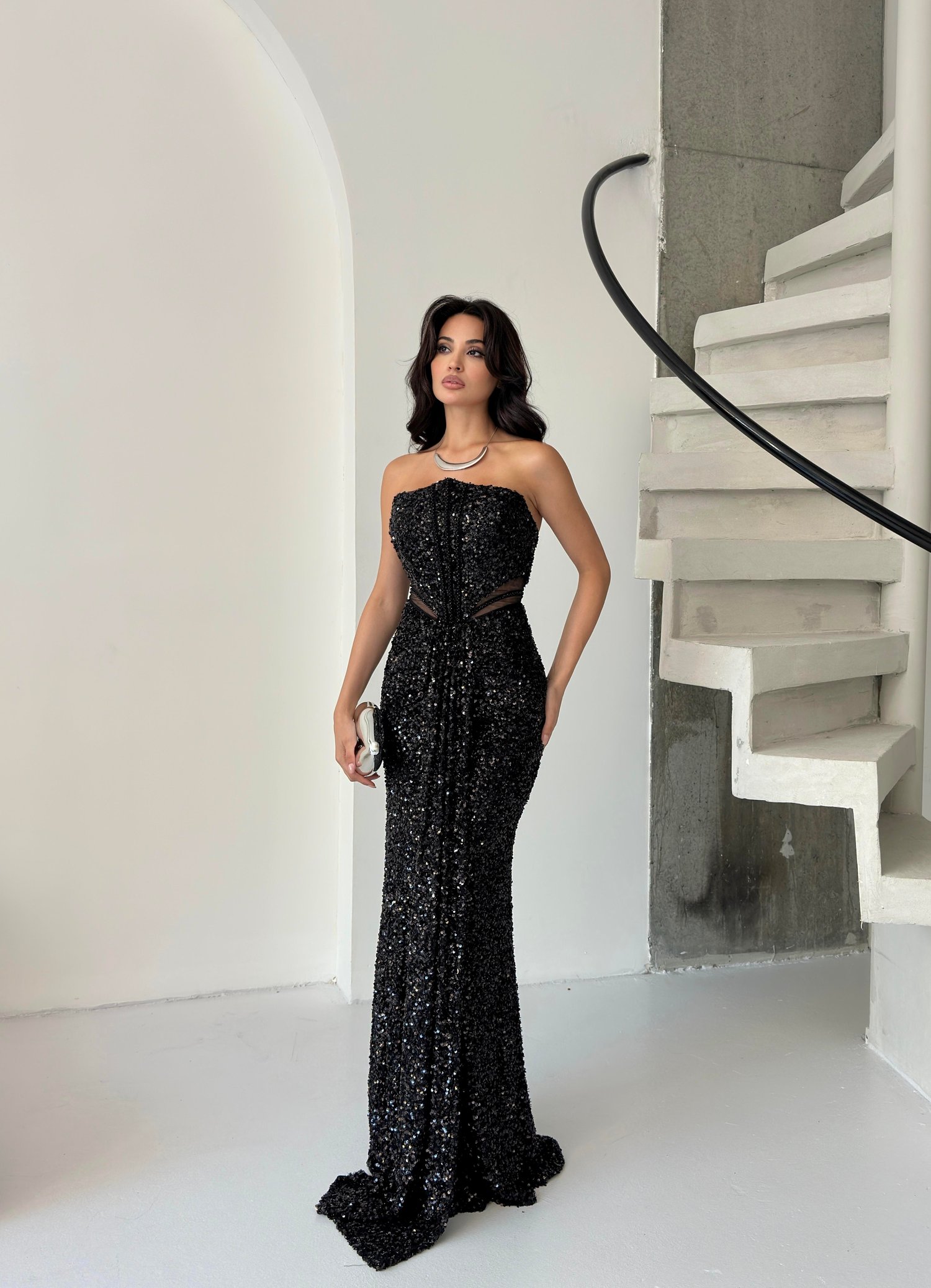 Siyah Straplez Bel Detaylı Pul Payet Abiye Elbise