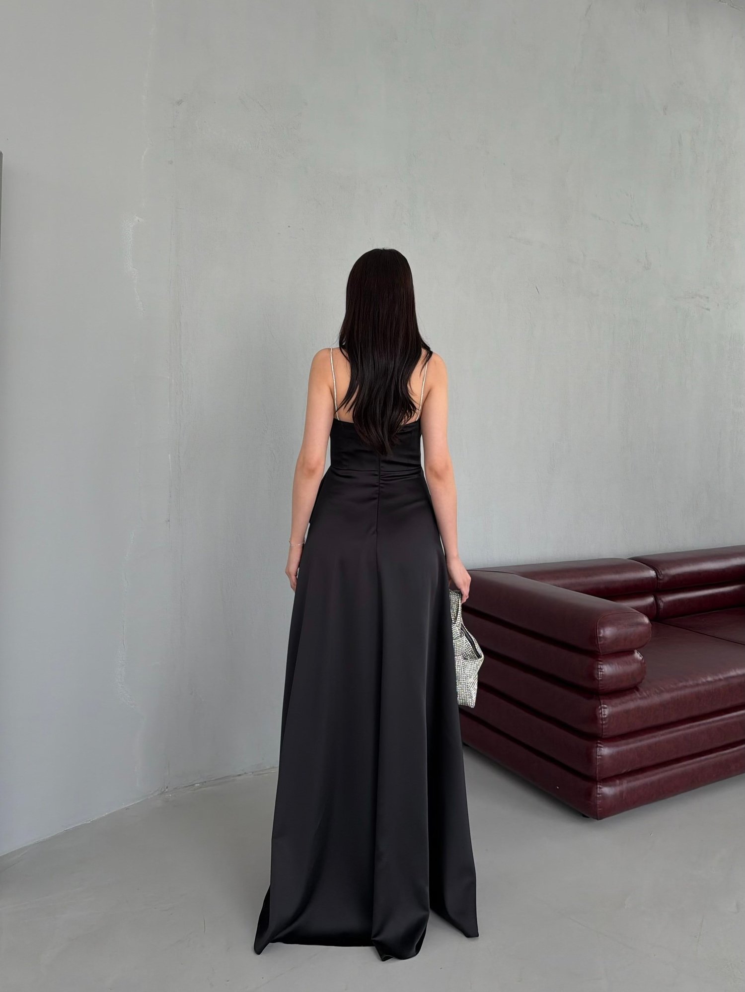 Siyah Taş Askılı Volanlı Yırtmaçlı Abiye Elbise