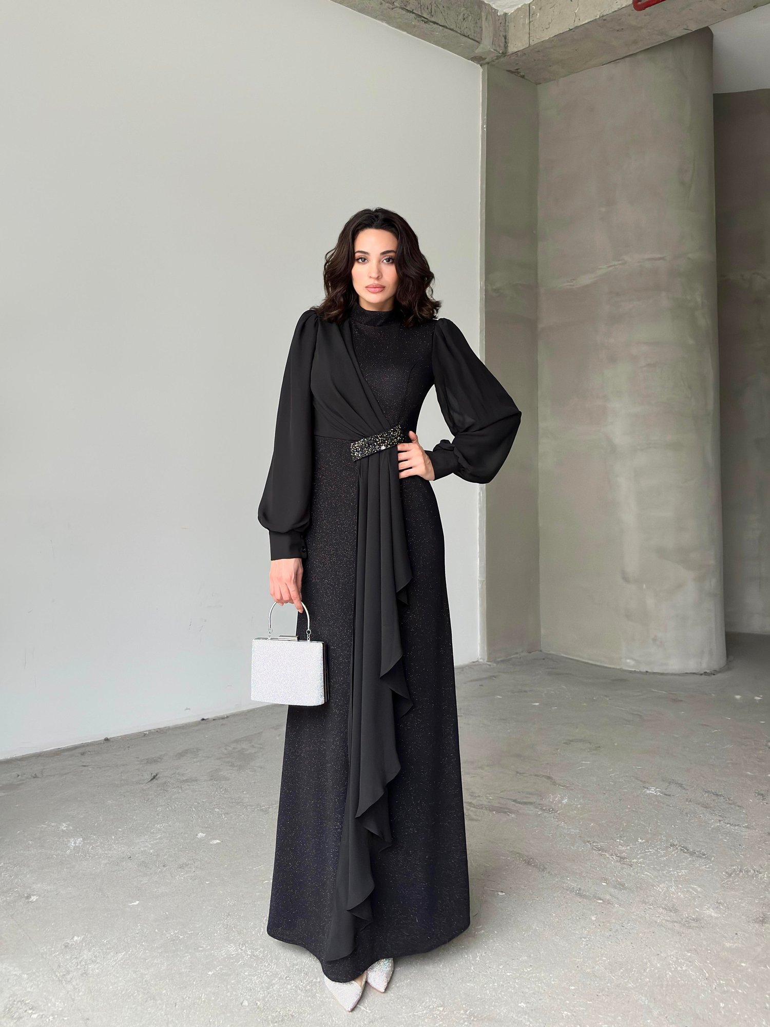 Siyah Taş Detaylı Uzun Kol Simli Abiye Elbise