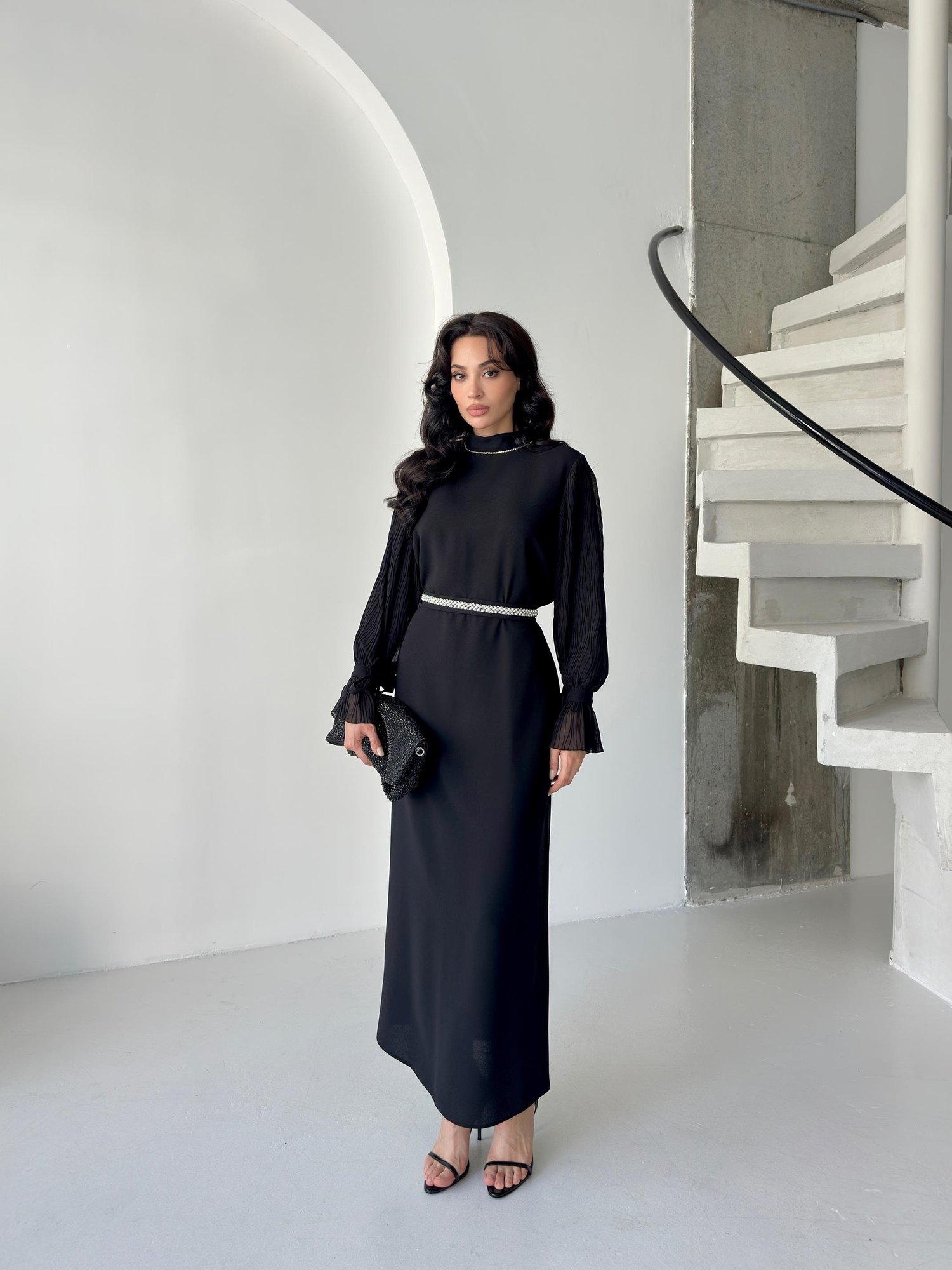 Siyah Taş Kuşaklı Balon Kol Abiye Elbise