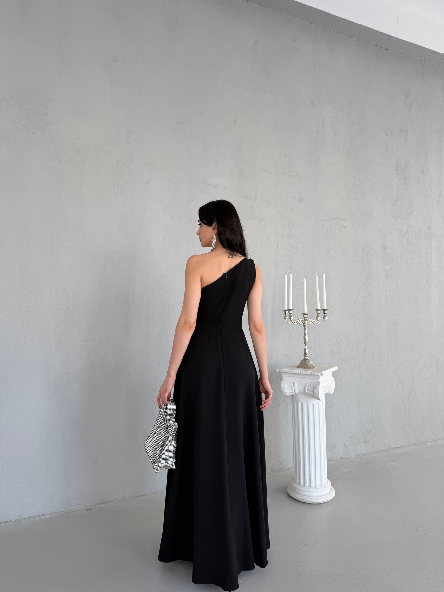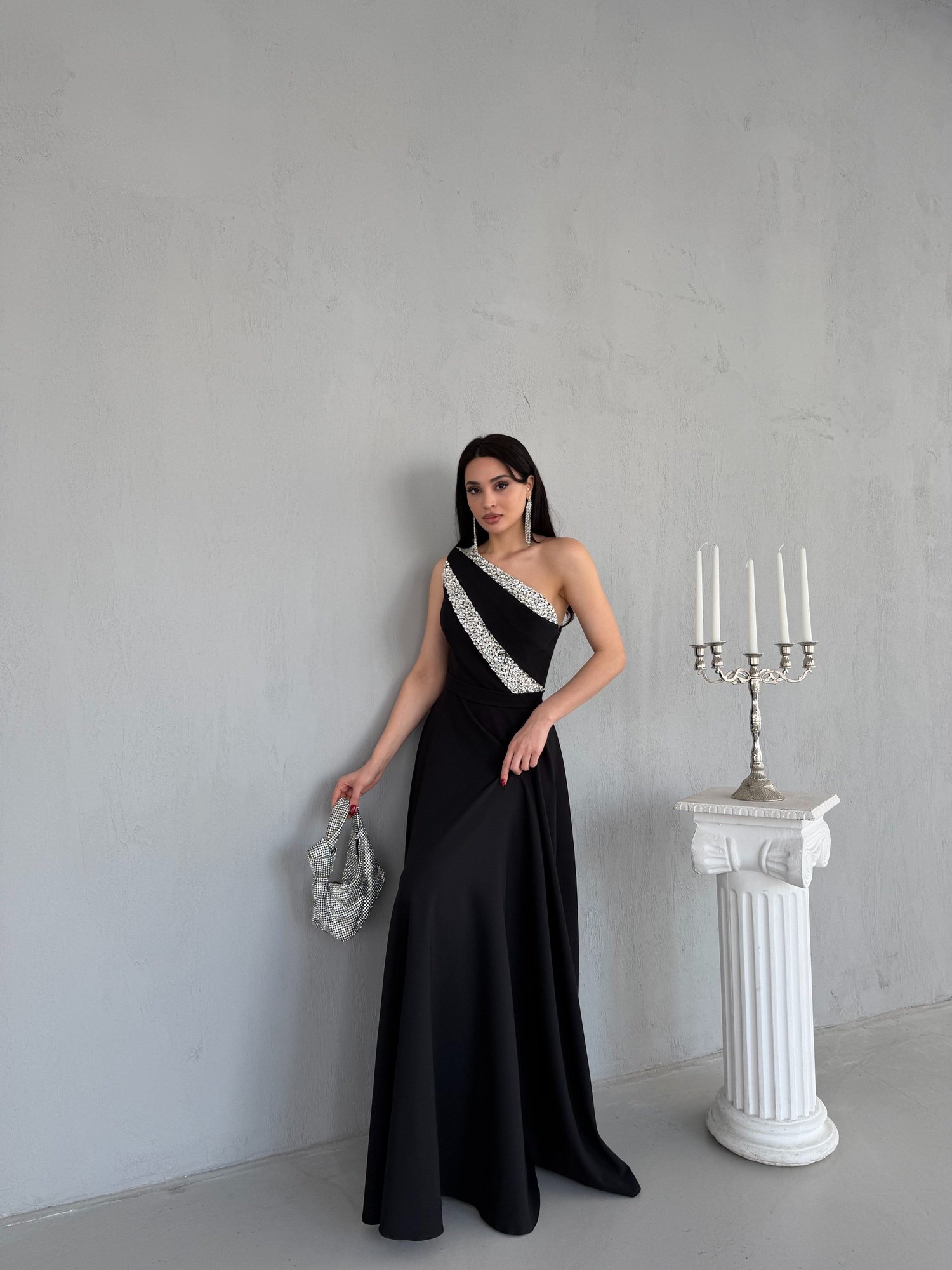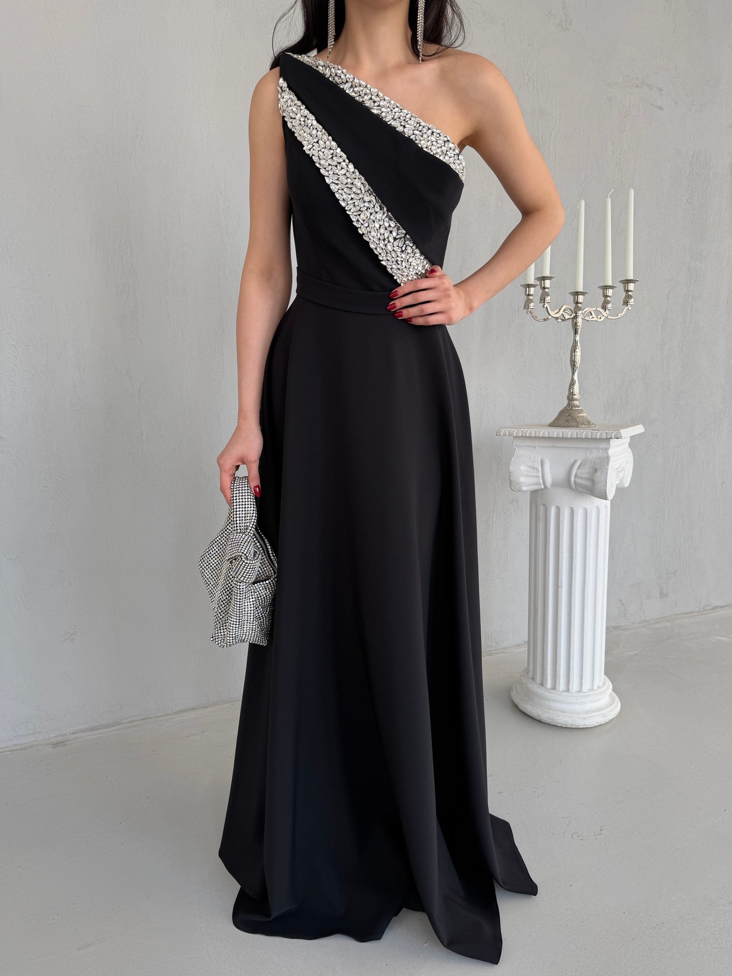 Siyah Tek Omuz Taş İşlemeli Abiye Elbise