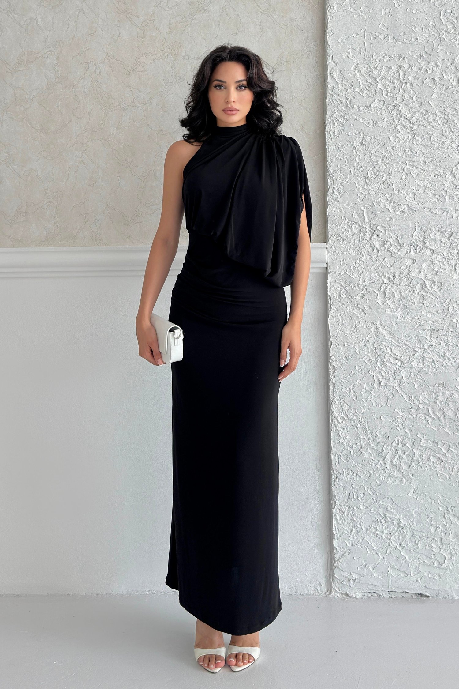 Siyah Tek Omuz Yüksek Yaka Detaylı Elbise