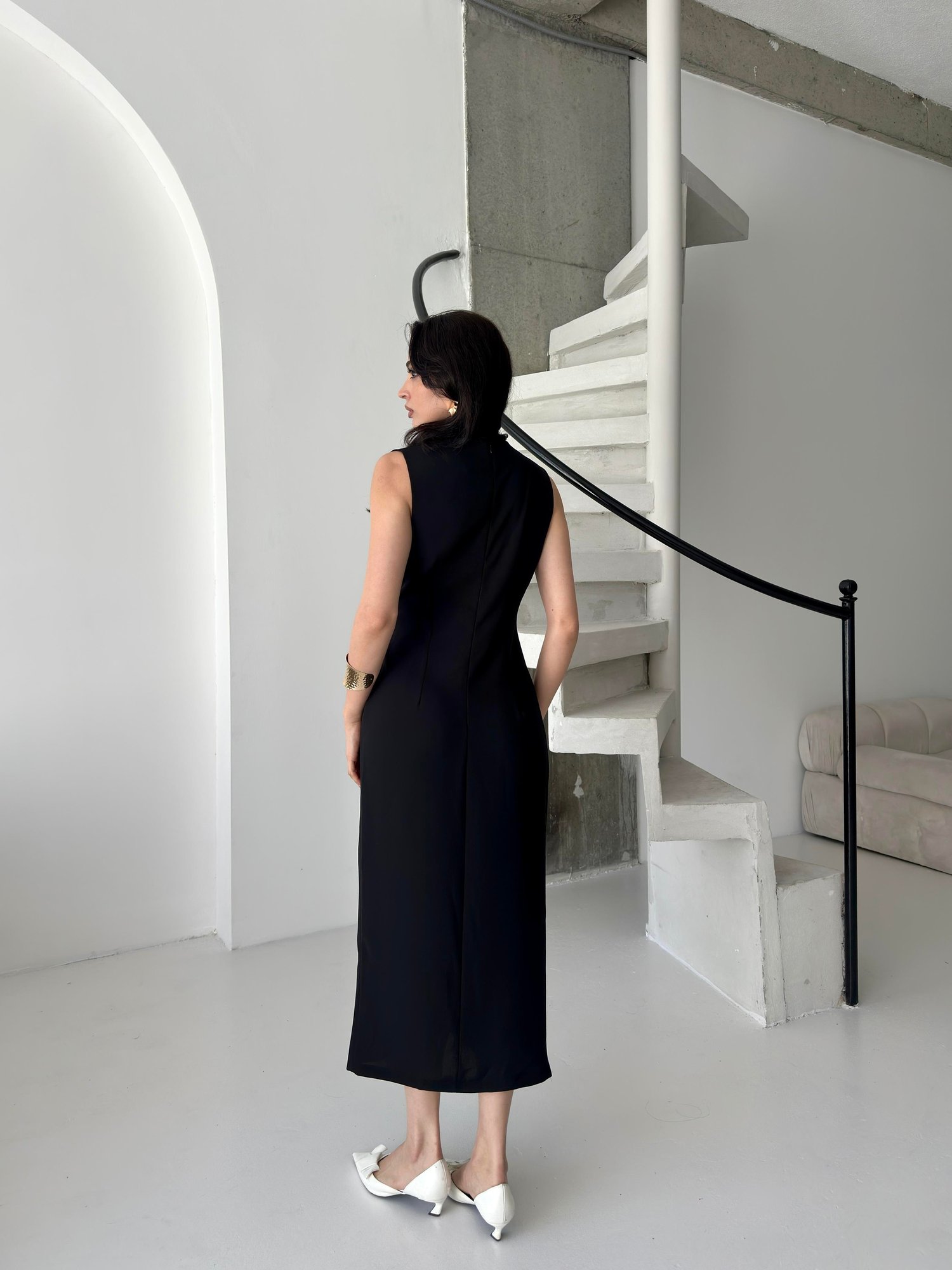 Siyah Tokalı Pile Detaylı Kolsuz Elbise