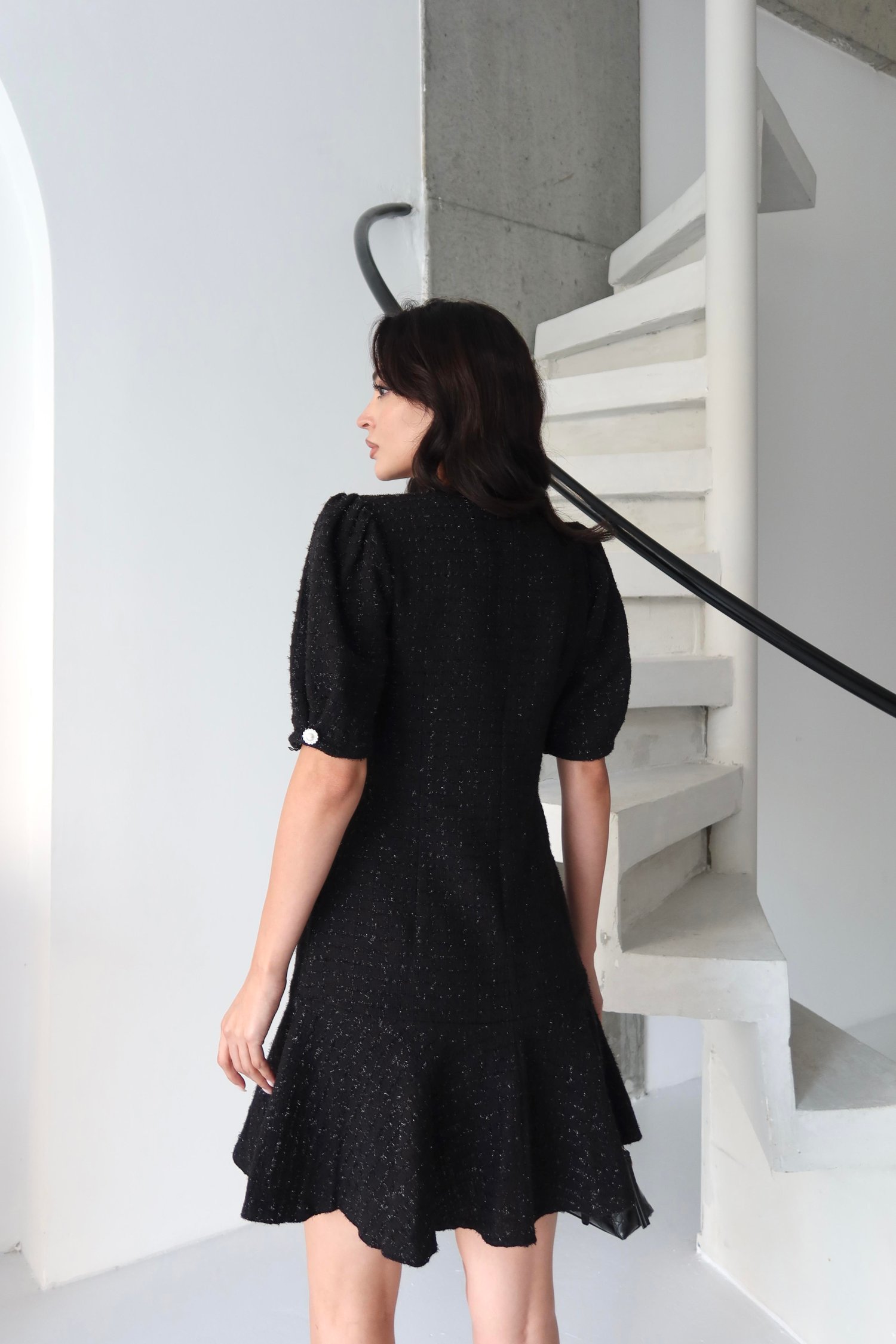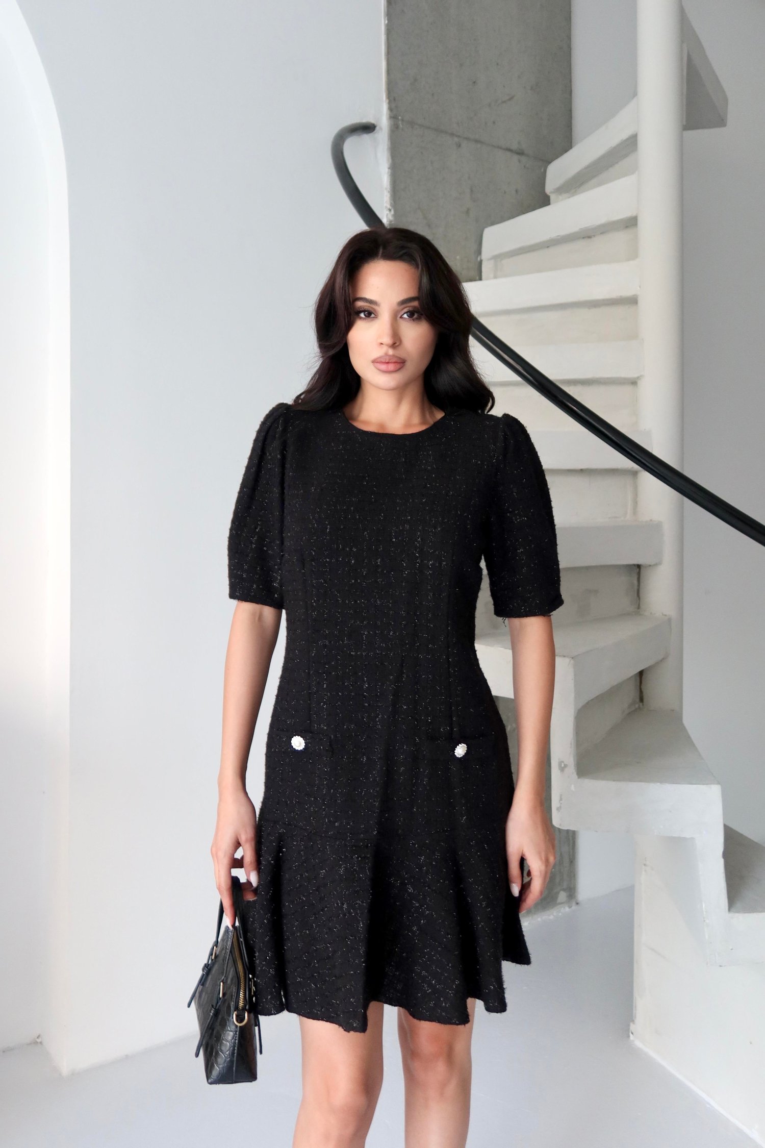 Siyah Tüvit Kumaş Cep Detaylı Volanlı Elbise
