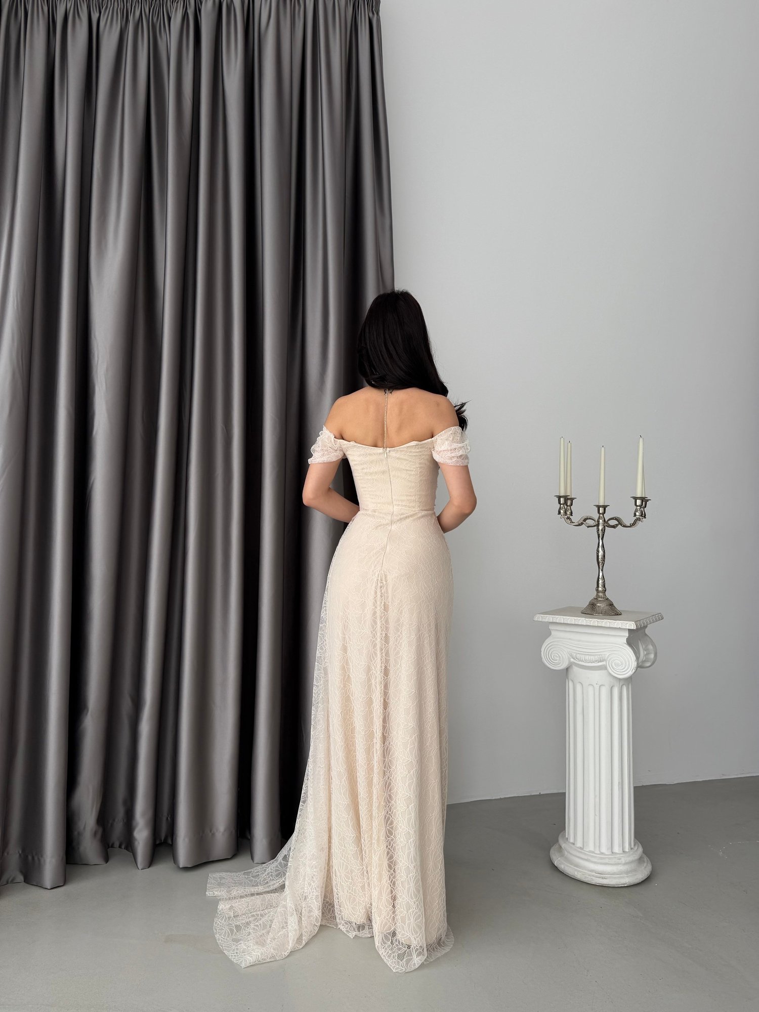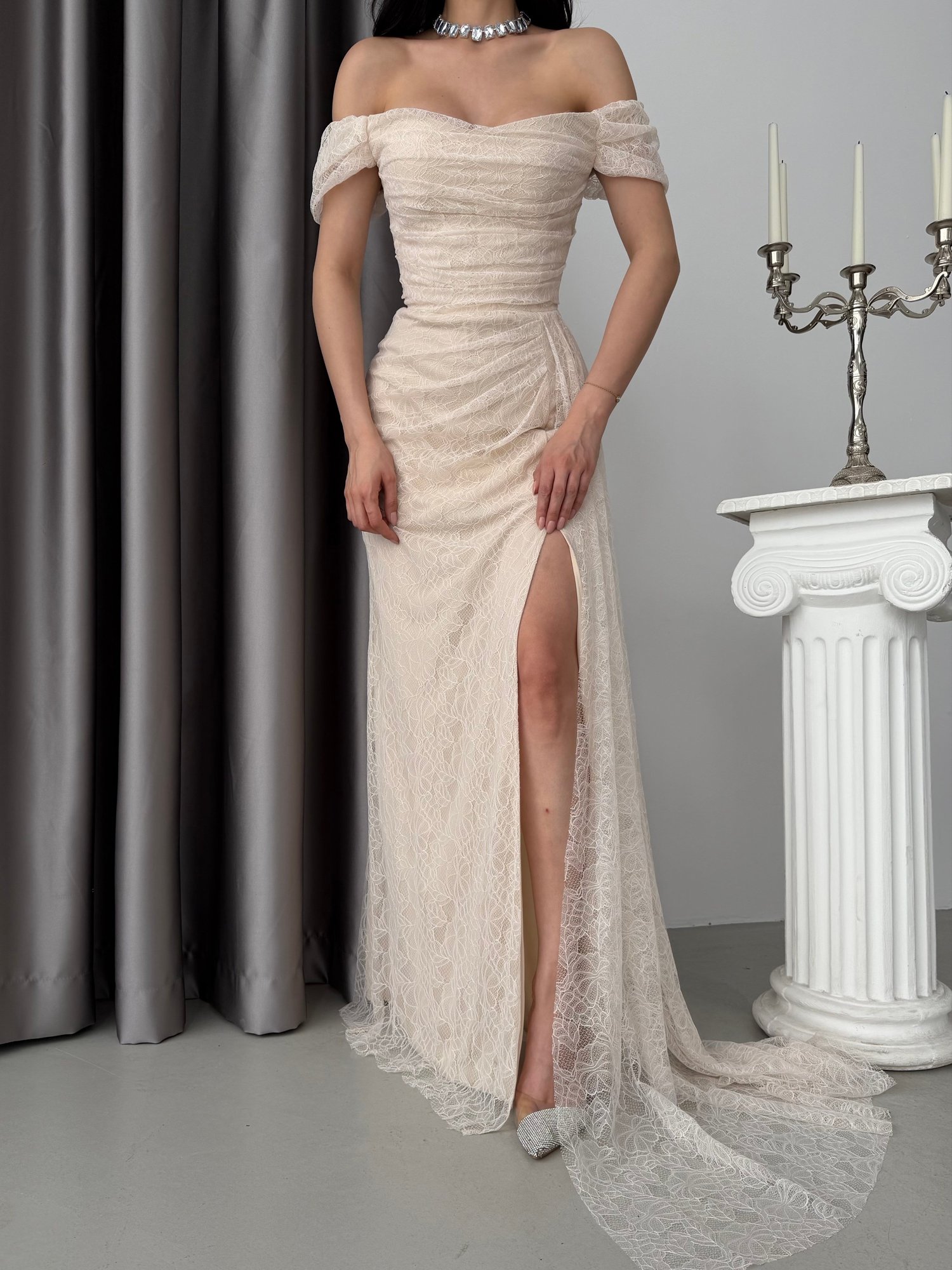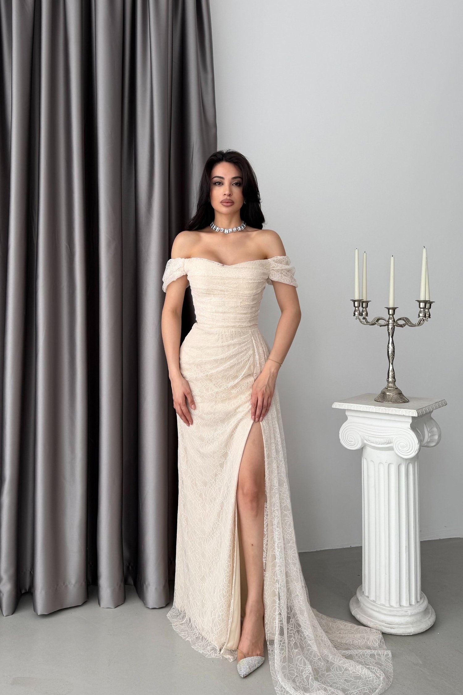 Taş Düşük Omuz Drapeli Dantel Kumaş Abiye Elbise