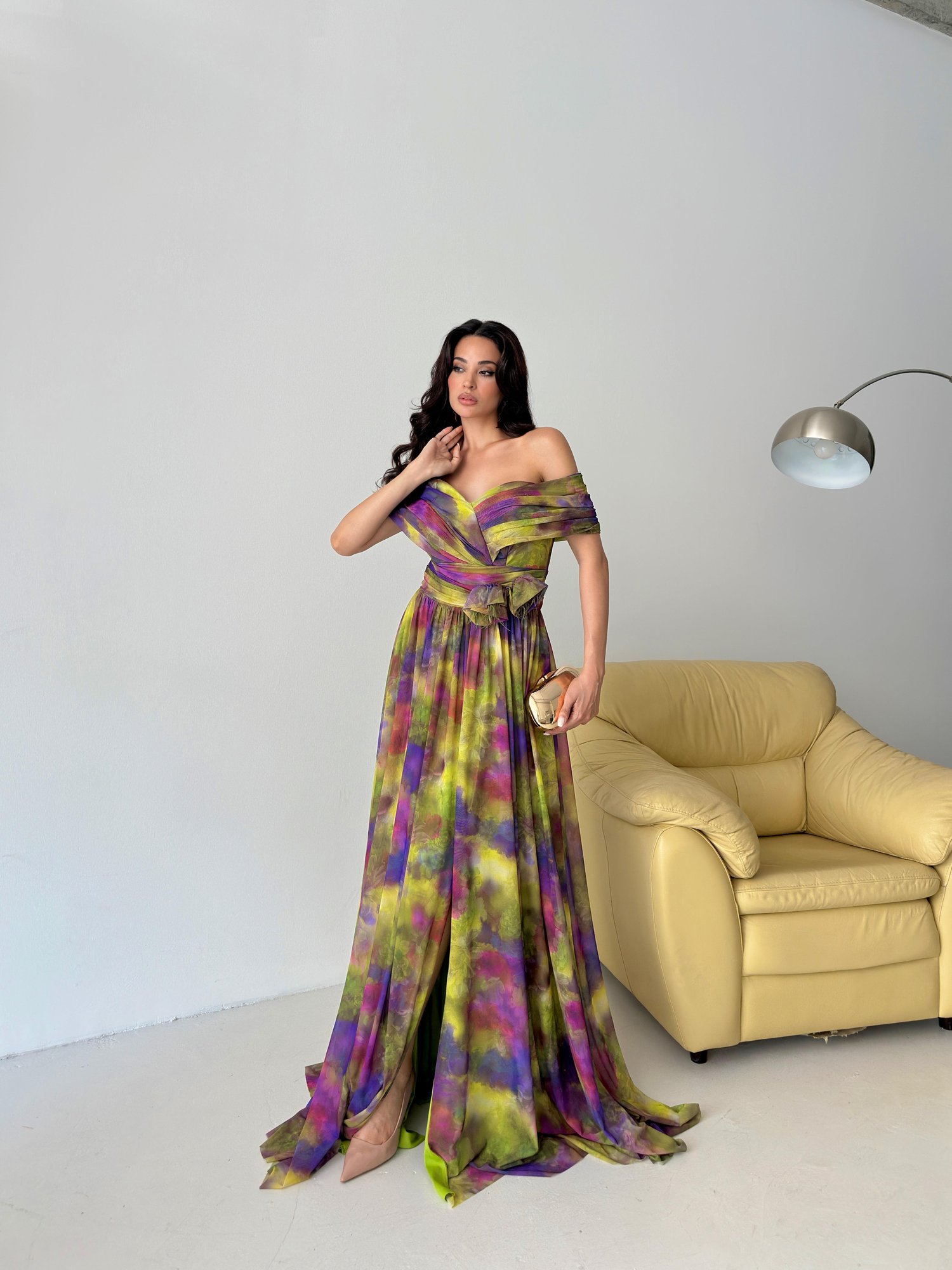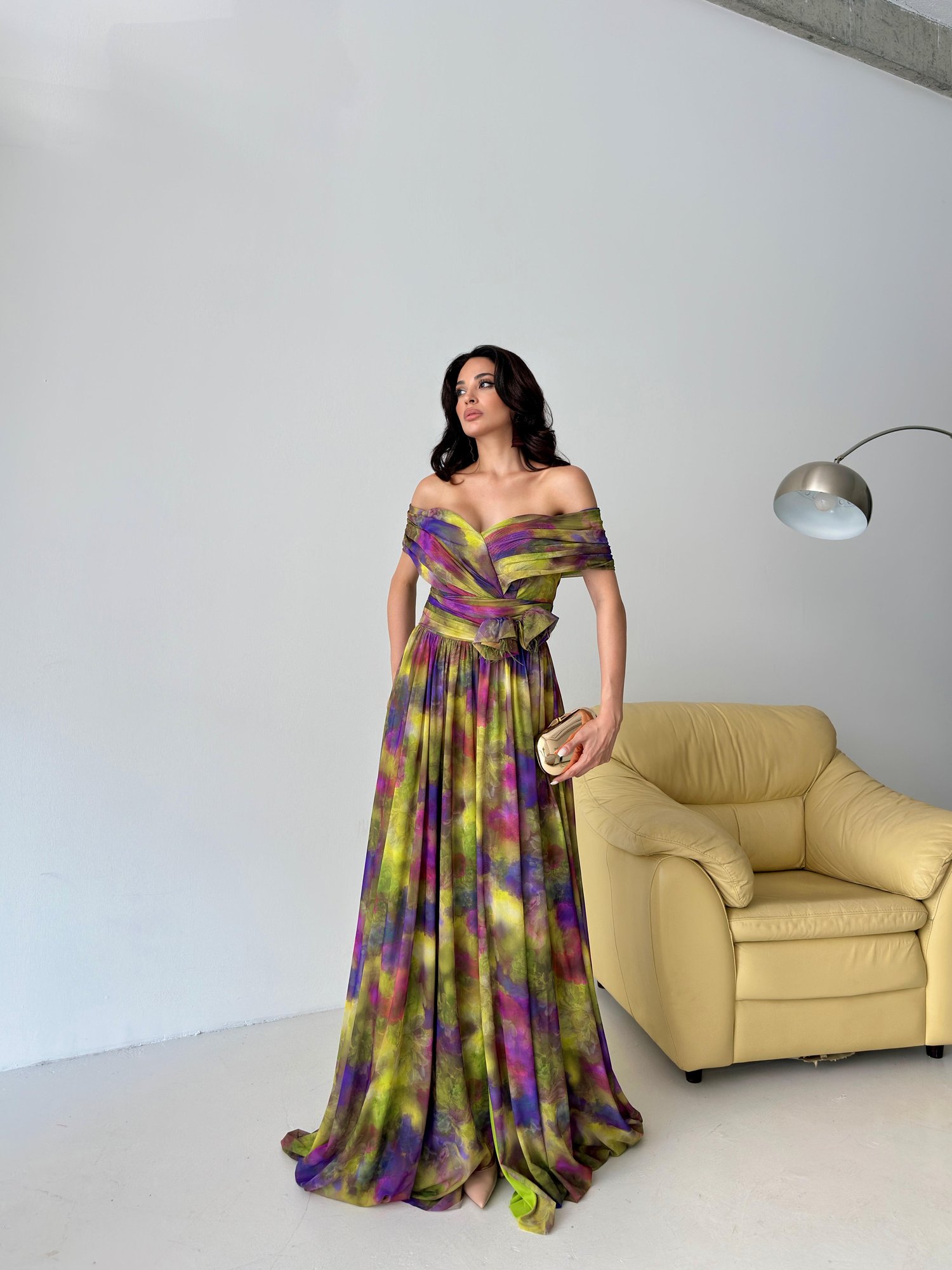 Yeşil Kayık Yaka Desenli Tül Abiye Elbise Saks Mavi Kayık Yaka Desenli Tül Abiye Elbise Mor Kayık Yaka Desenli Tül Abiye Elbise