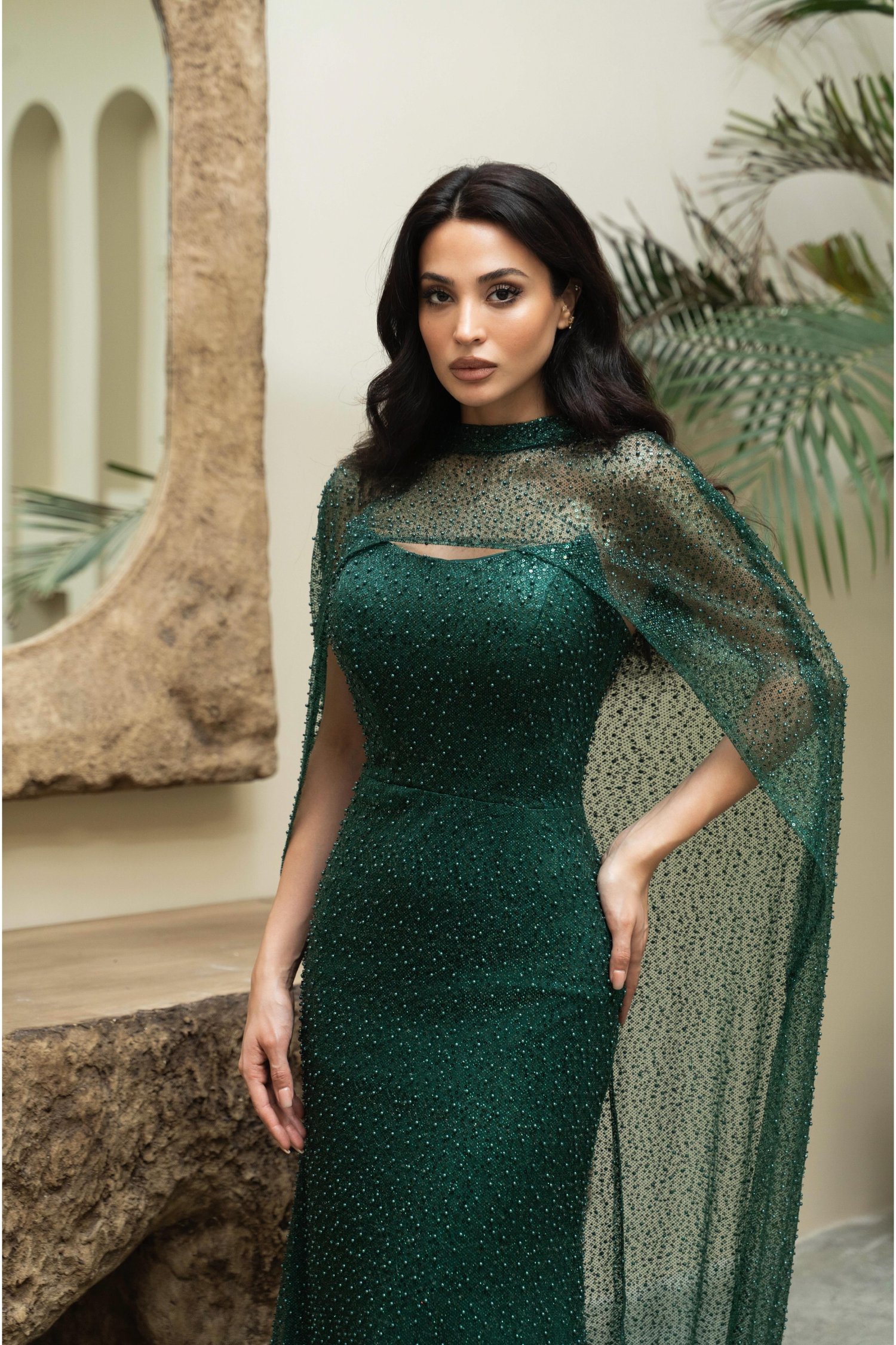 Zümrüt Straplez Boncuk İşlemeli Pelerinli Abiye Elbise